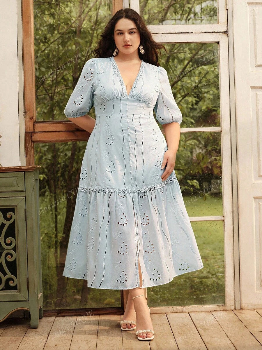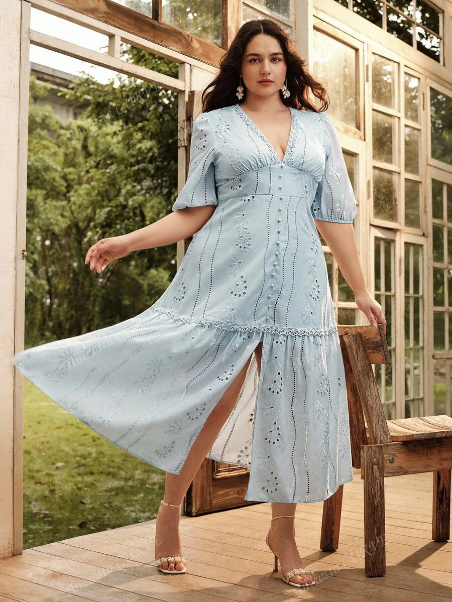 Vestido de talla grande de manga abullonada con cuello en v, calado y bordado en color liso, diseno de verano