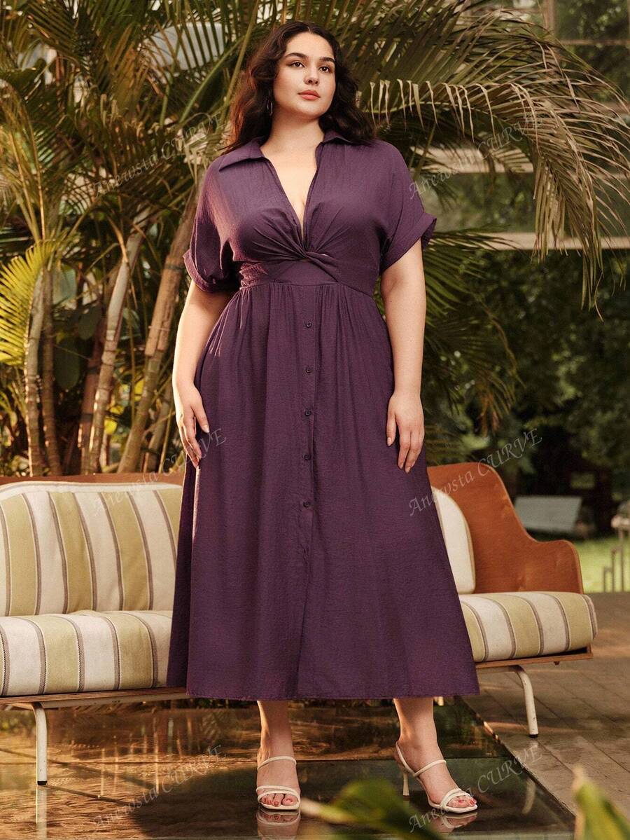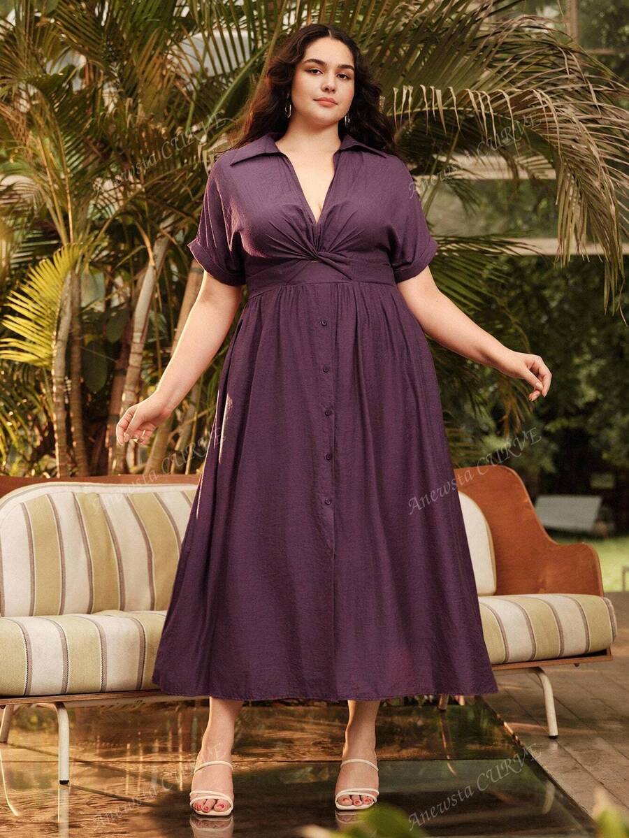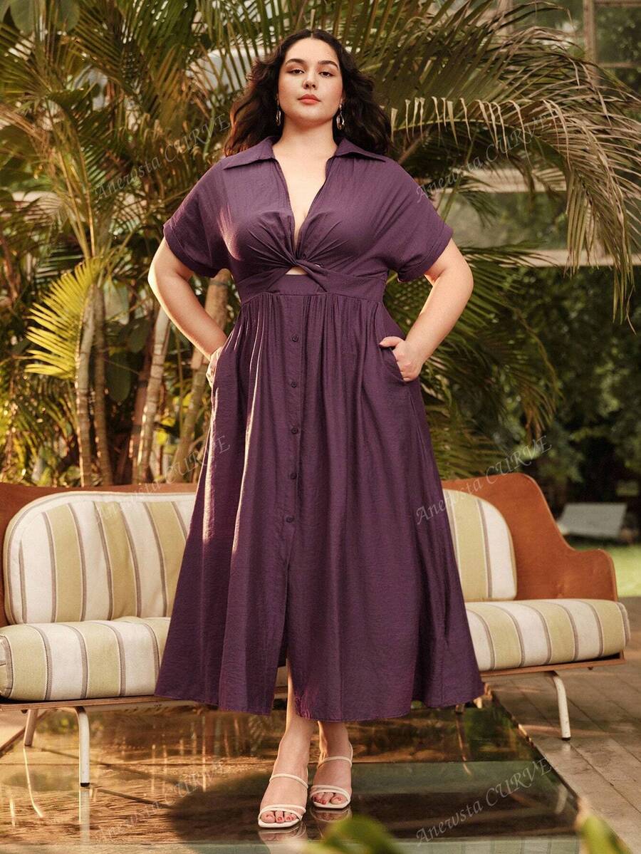 Vestido con cuello, cintura entallada, escote en v retorcido y abotonadura sencilla, de talla grande, para primavera/verano, festival/graduacion