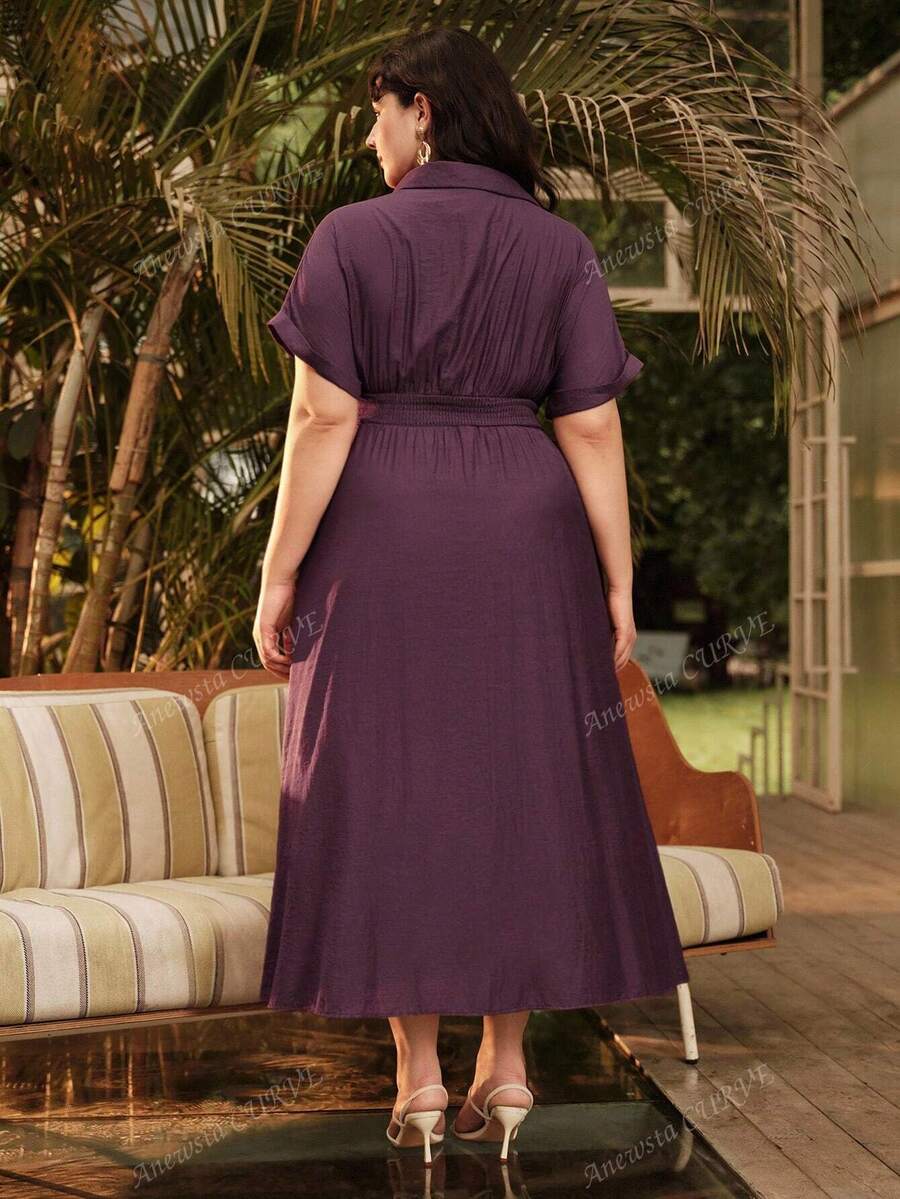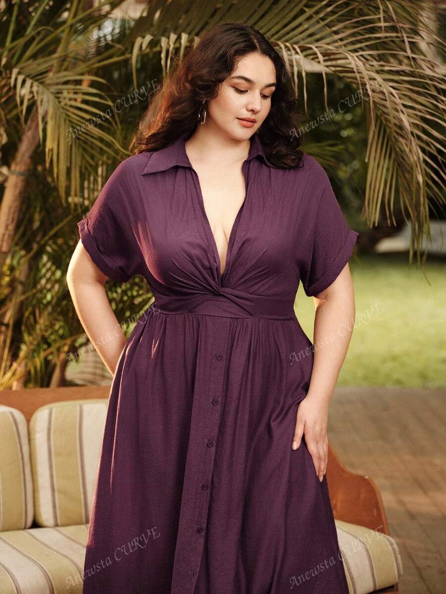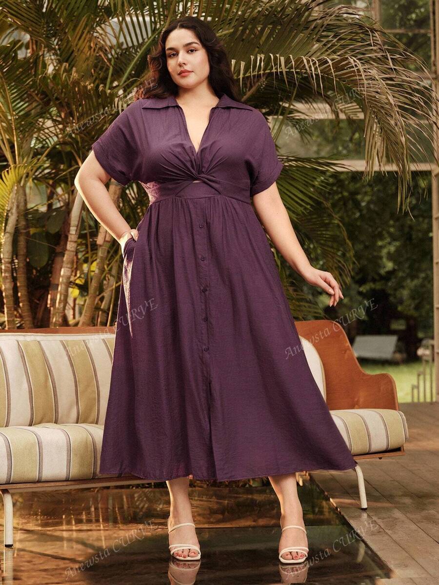 Vestido con cuello, cintura entallada, escote en v retorcido y abotonadura sencilla, de talla grande, para primavera/verano, festival/graduacion