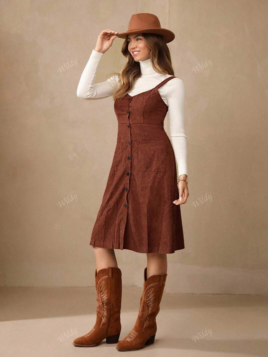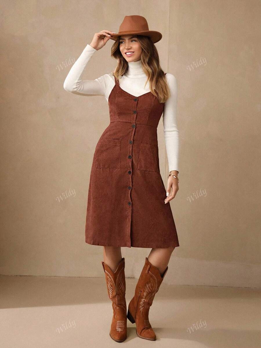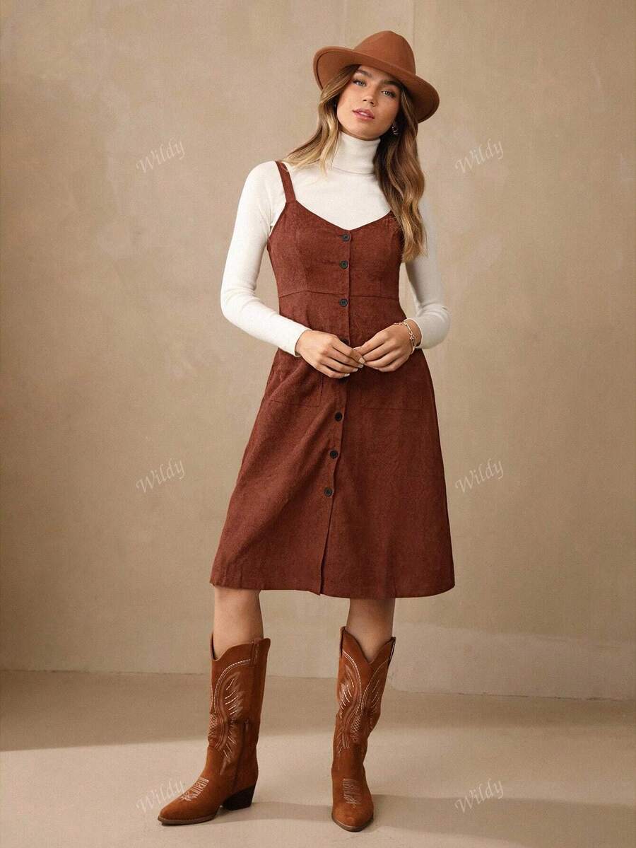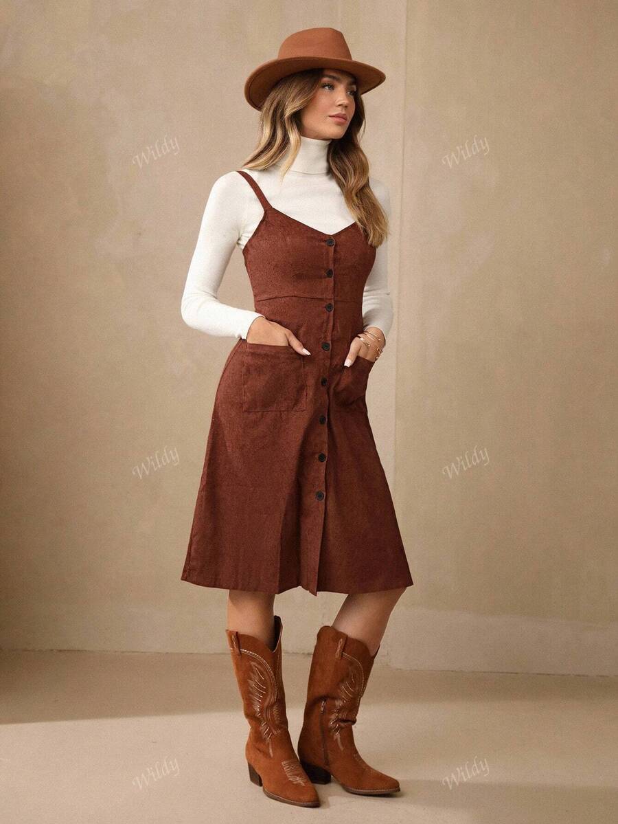 Vestido overol con doble bolsillo con boton delantero sin sueter