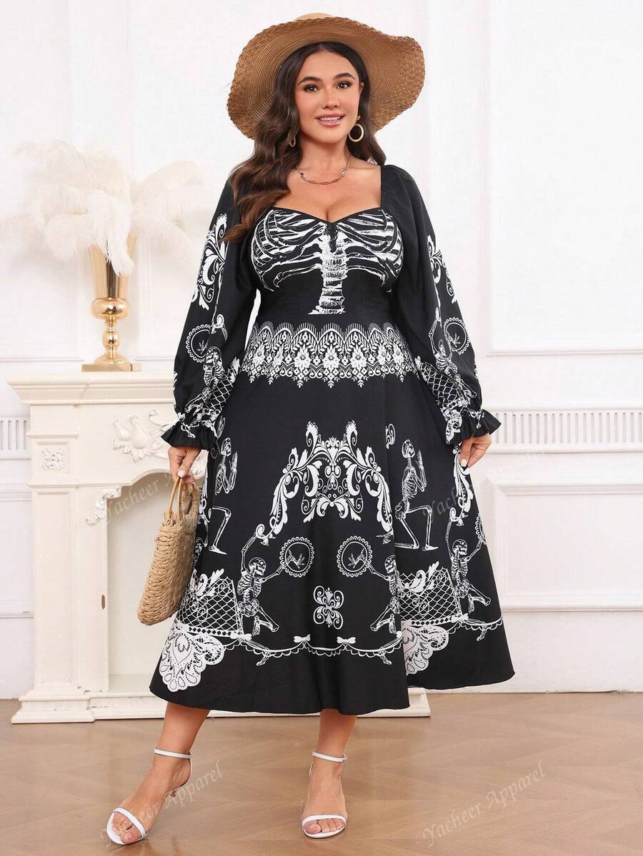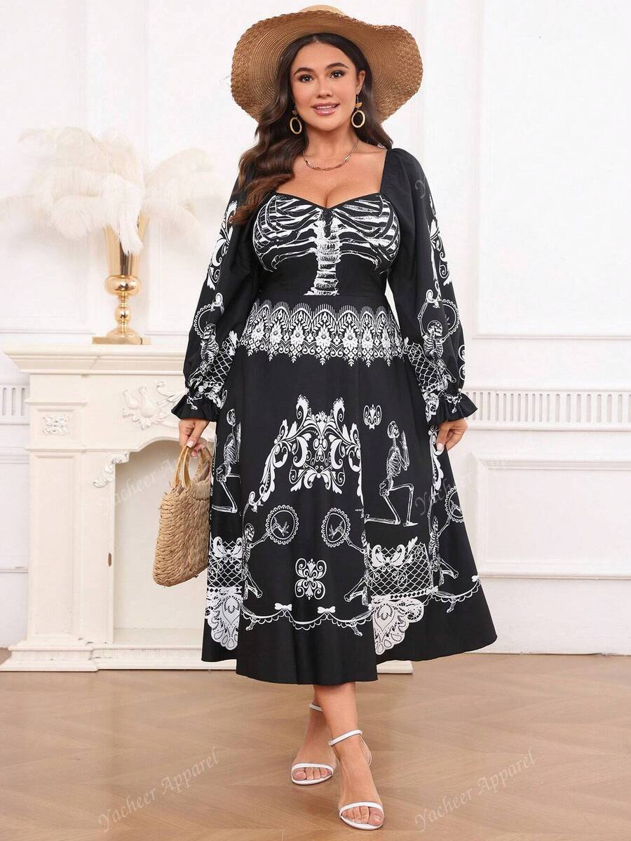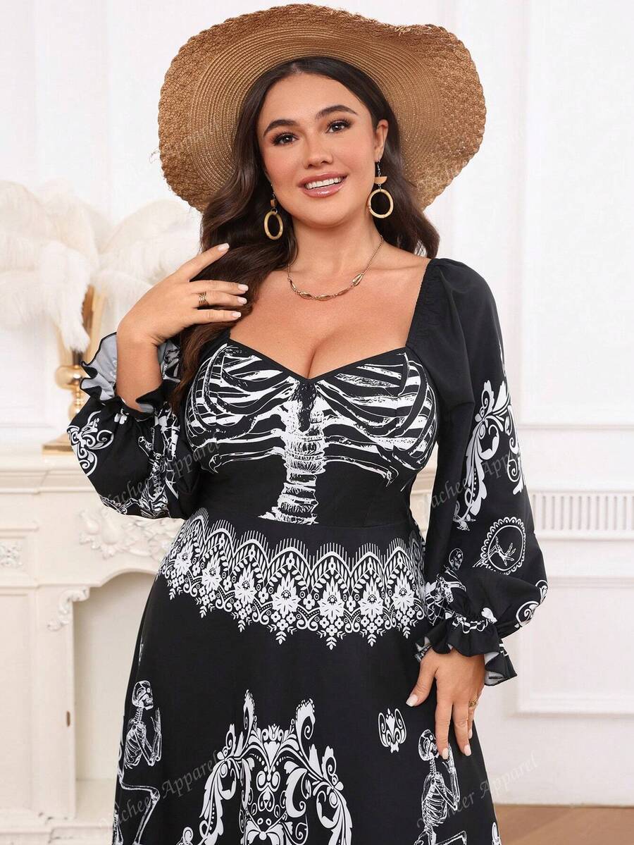 Vestido largo de talla grande para mujer con estilo gotico, estampado de esqueleto y plantas, cuello de corazon, mangas con volantes y cintura cenida, para uso casual y vacaciones, primavera/otono