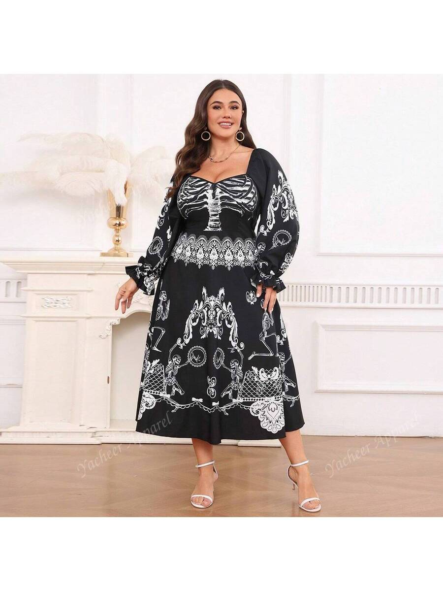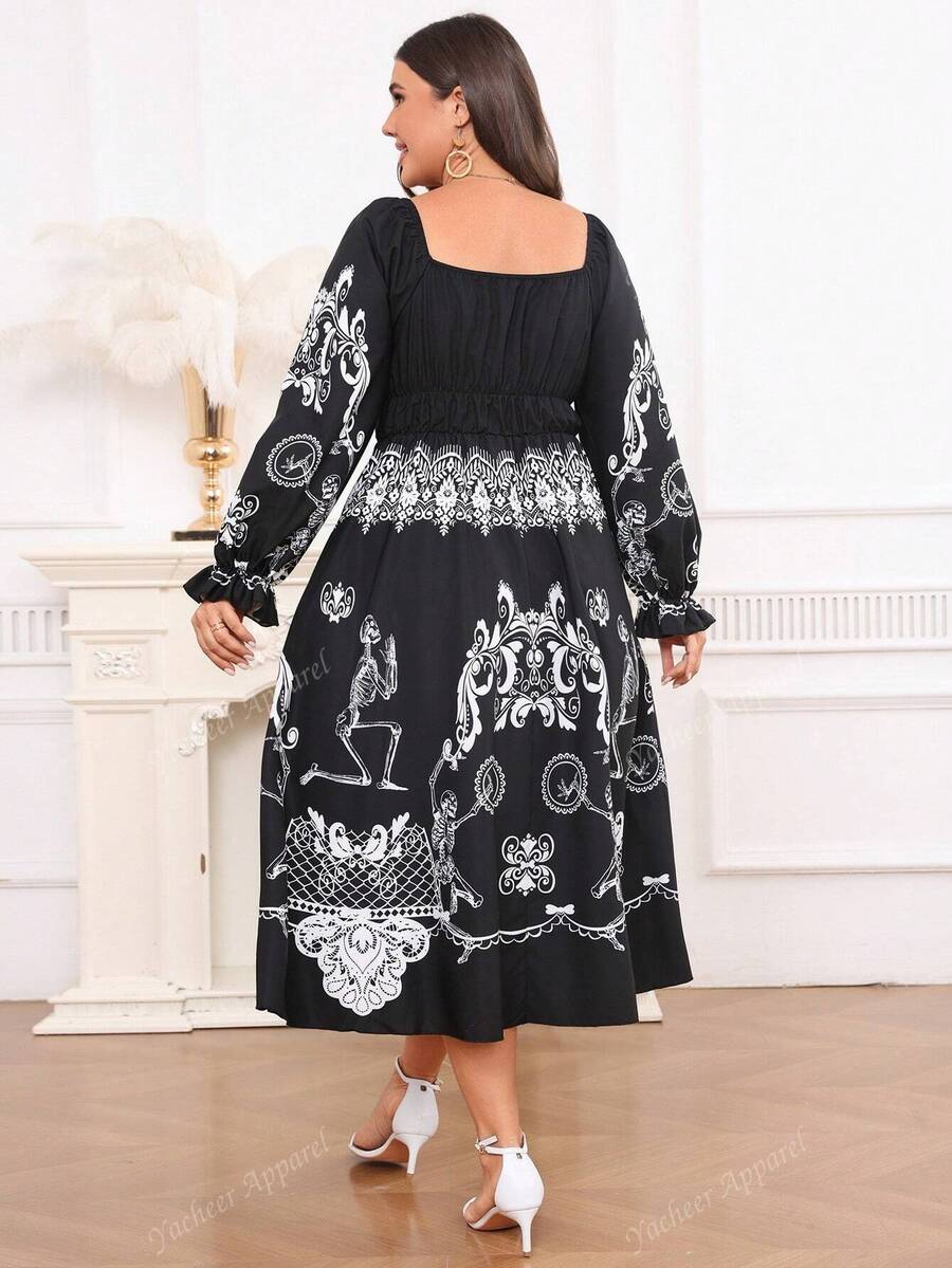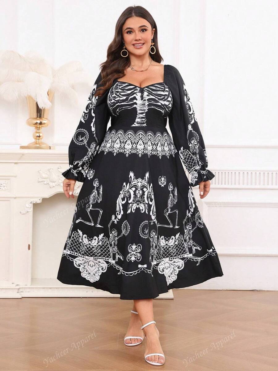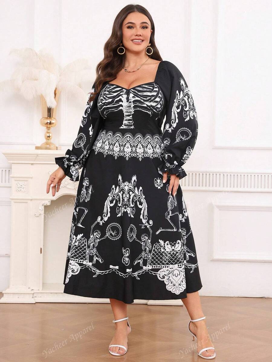 Vestido largo de talla grande para mujer con estilo gotico, estampado de esqueleto y plantas, cuello de corazon, mangas con volantes y cintura cenida, para uso casual y vacaciones, primavera/otono