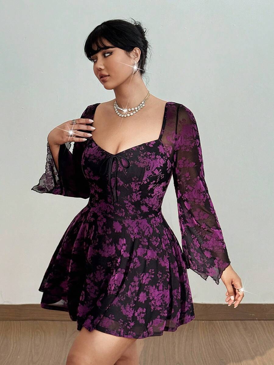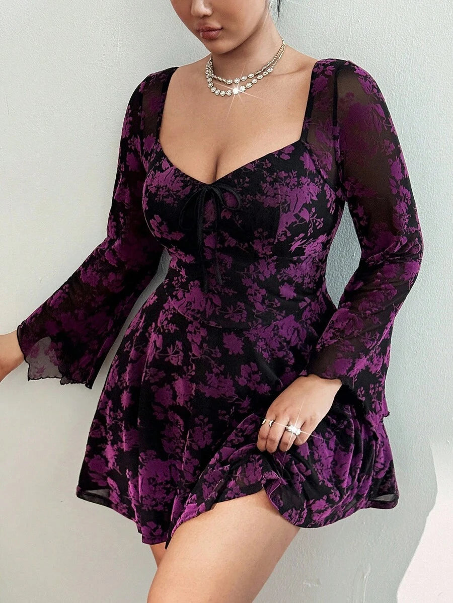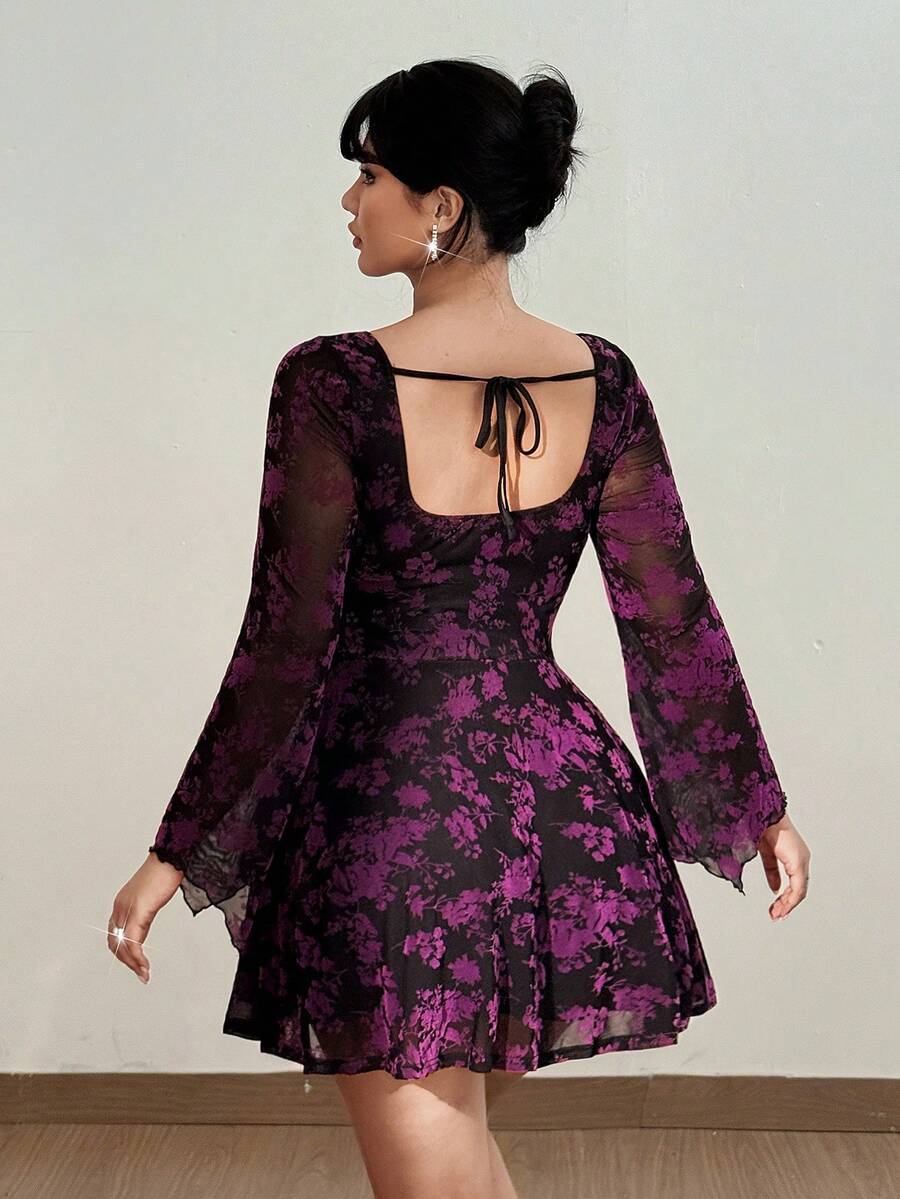 Viva relle vestido mini con estampado floral, cuello en v, mangas acampanadas, volantes en el bajo, adecuado para otono, invierno, viajes al aeropuerto, fiestas, eventos formales, sexy, espalda descubierta, pascua, romantico, tallas grandes para mujer