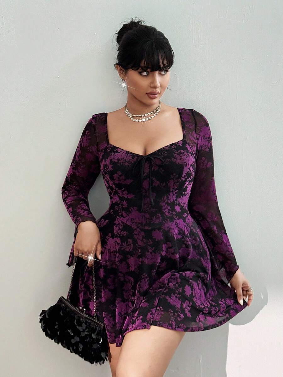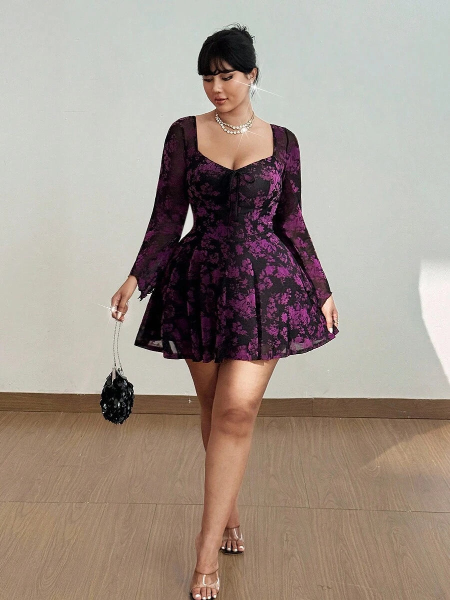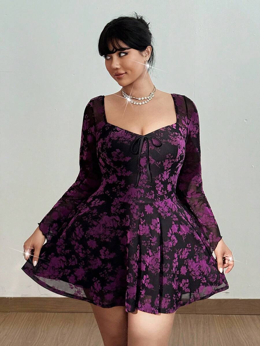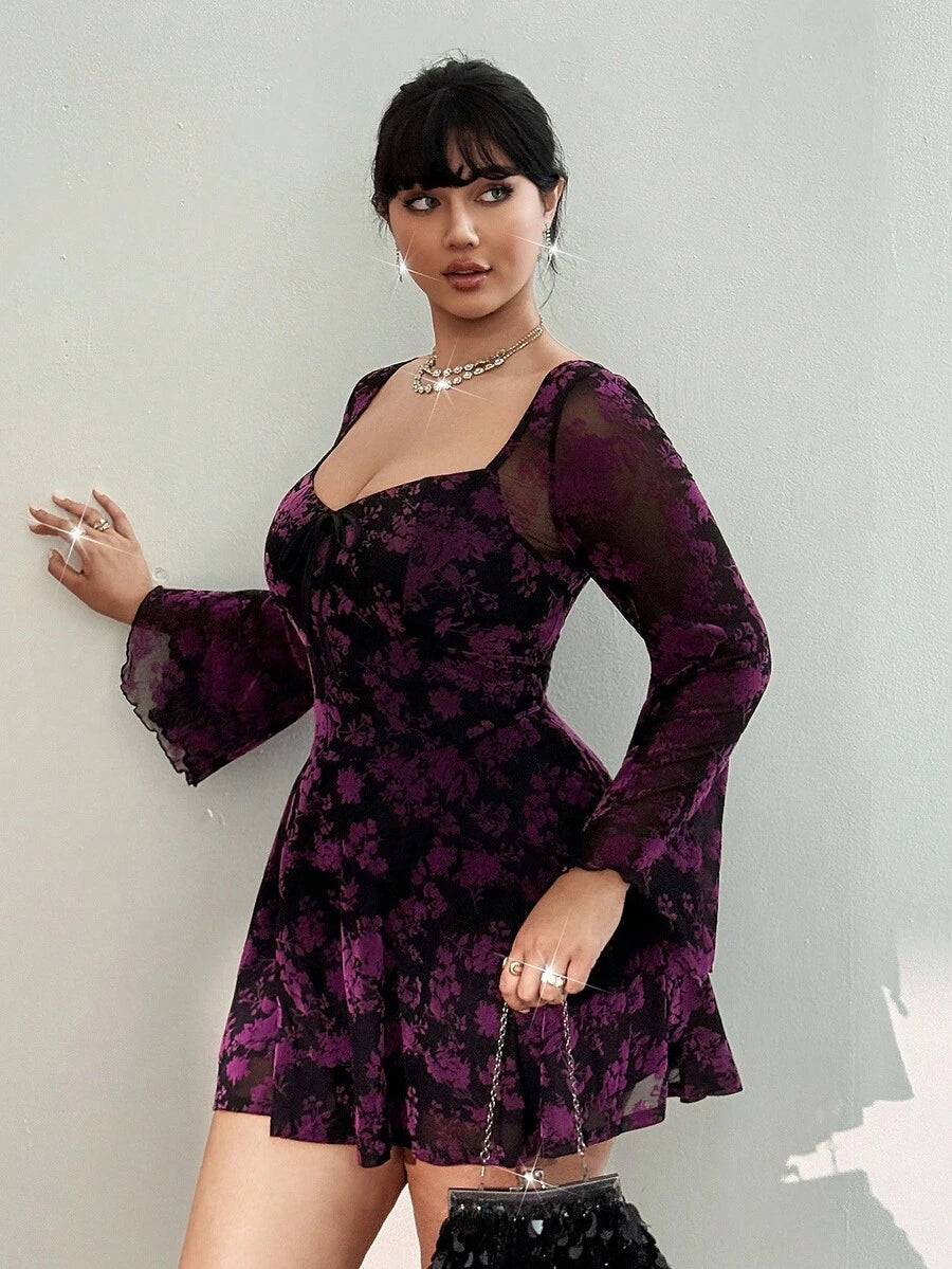 Viva relle vestido mini con estampado floral, cuello en v, mangas acampanadas, volantes en el bajo, adecuado para otono, invierno, viajes al aeropuerto, fiestas, eventos formales, sexy, espalda descubierta, pascua, romantico, tallas grandes para mujer