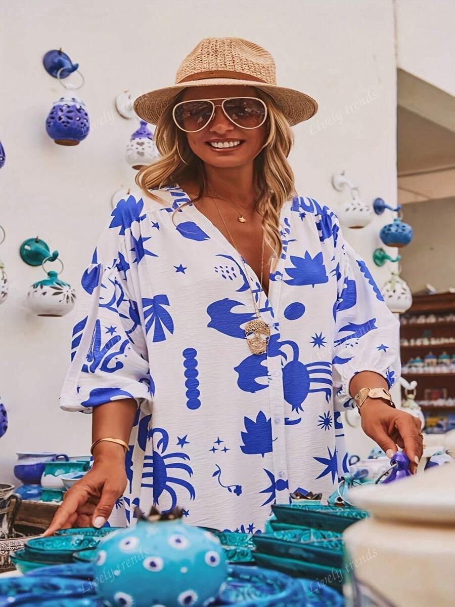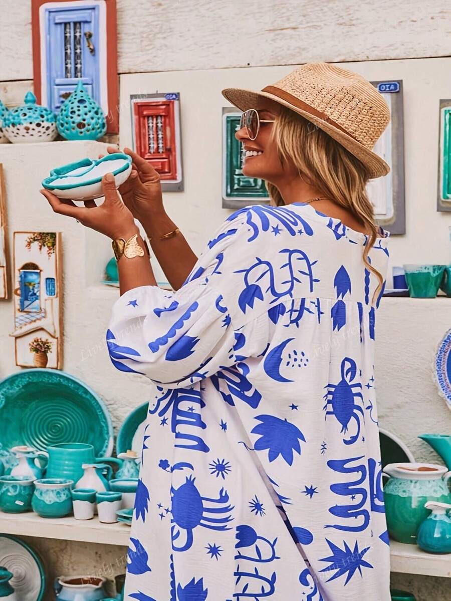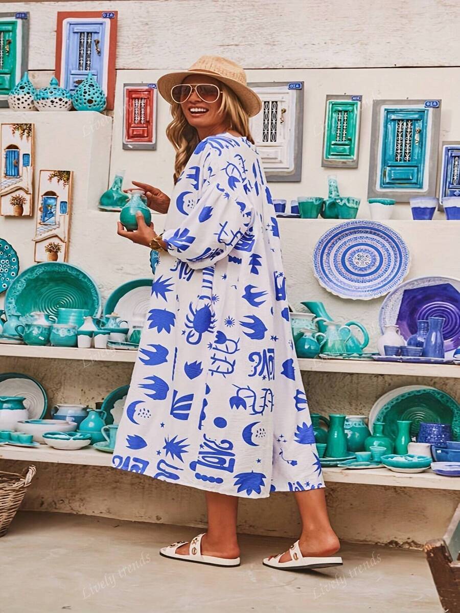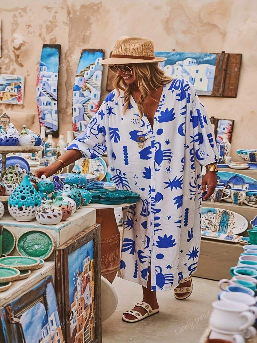 Vestido largo de mujer talla grande con cuello en v, mangas sueltas y caidas, estampado tropical de isla, estilo de vacaciones, moda casual, minimalista para ir y venir, estilo bohemio, adecuado para temporada de graduacion, regreso a clases, conciertos
