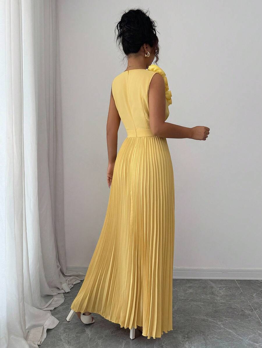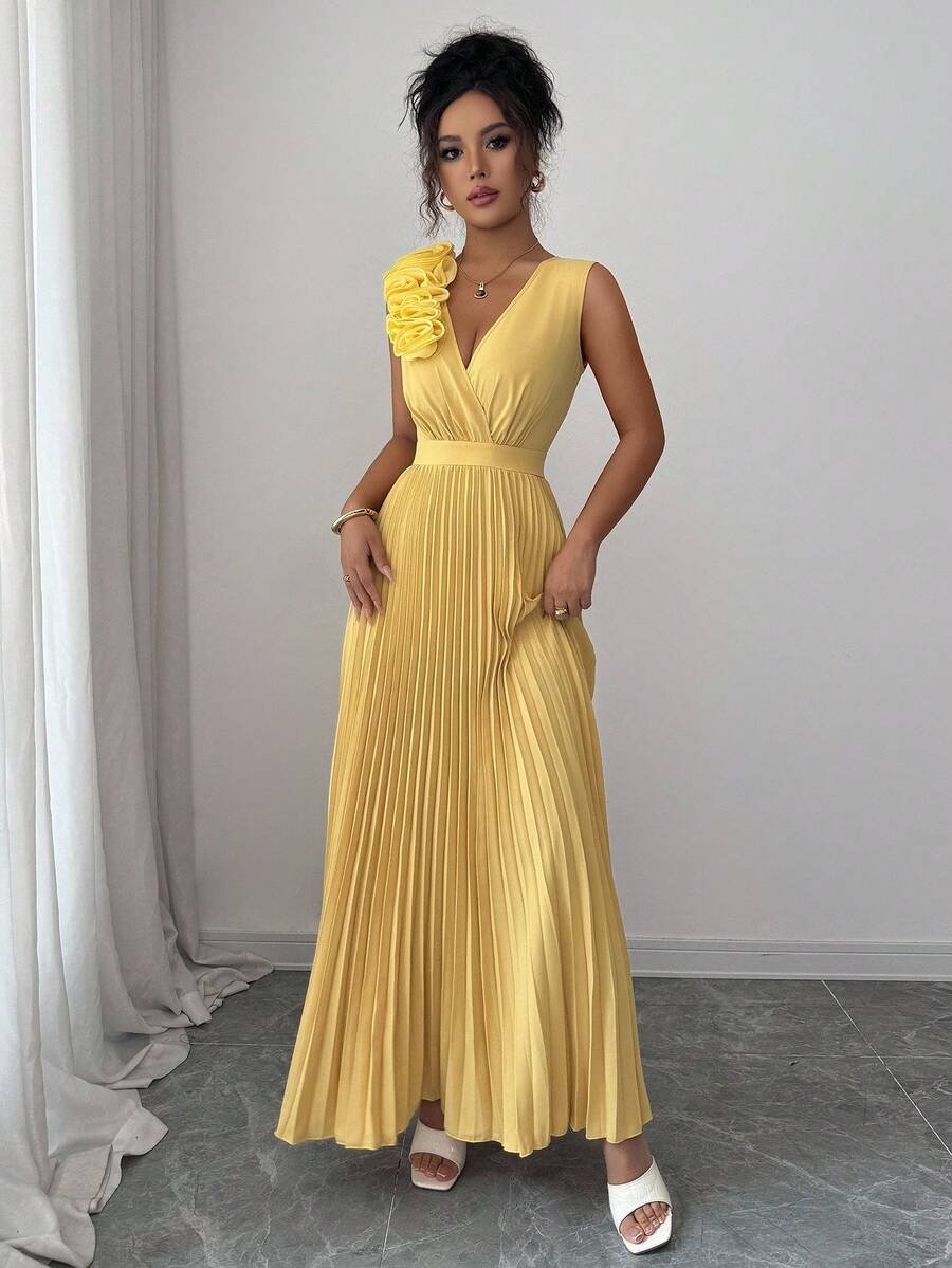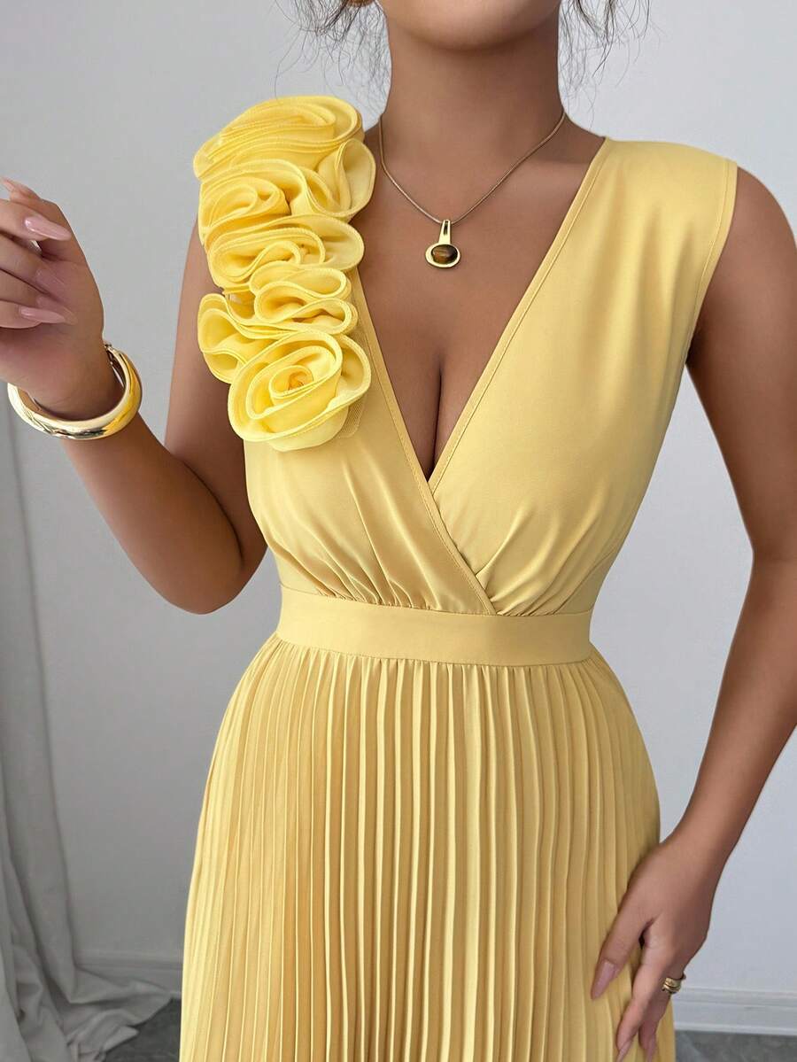 Vestido plisado de linea a con escote en v, parches florales y volantes en la cintura, color amarillo crema de verano