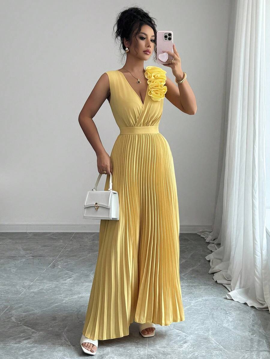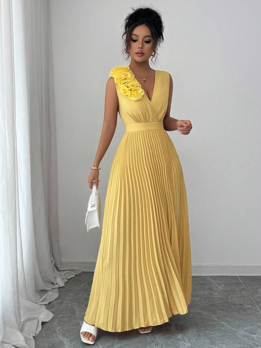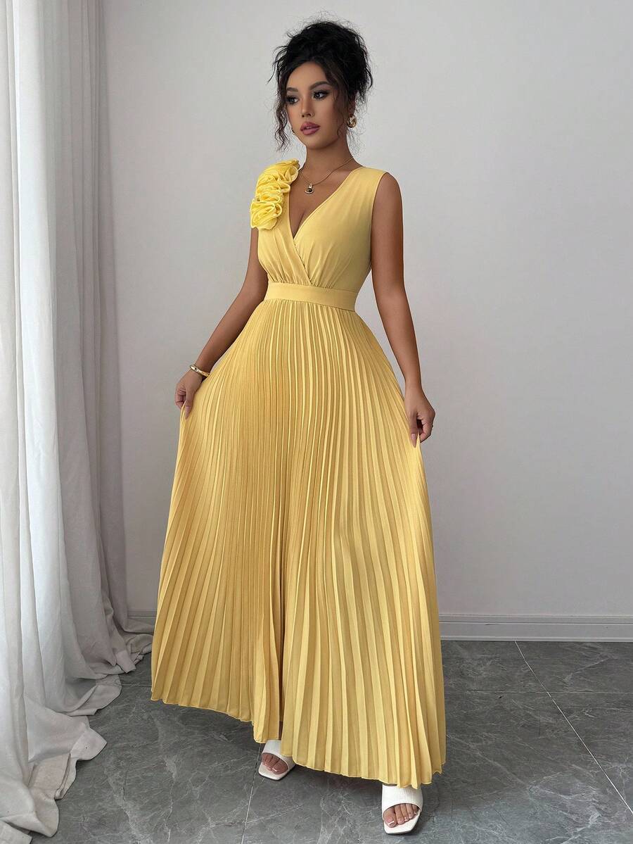 Vestido plisado de linea a con escote en v, parches florales y volantes en la cintura, color amarillo crema de verano