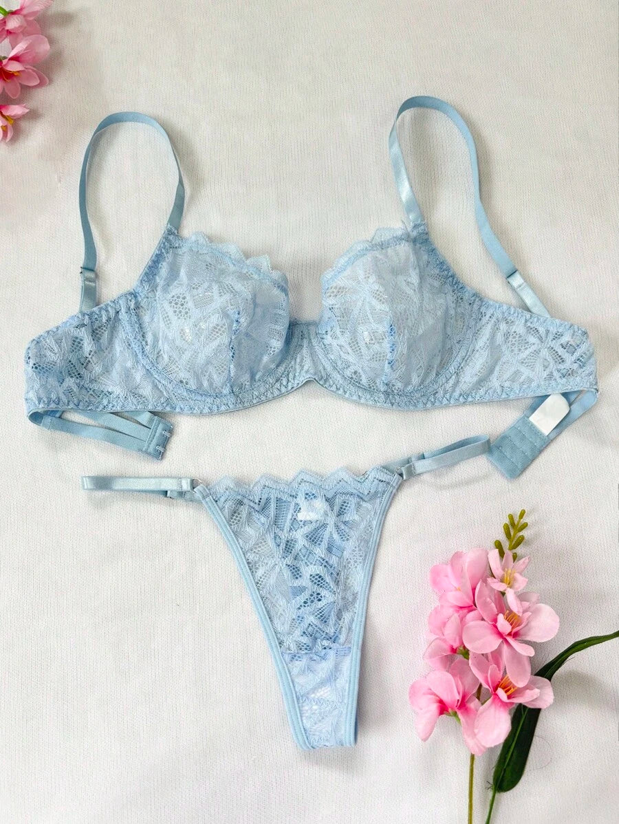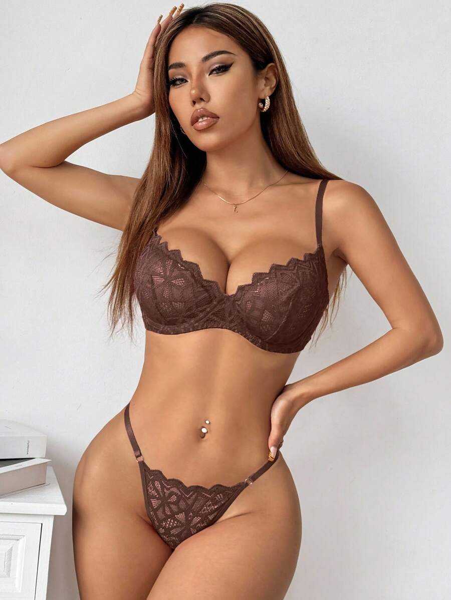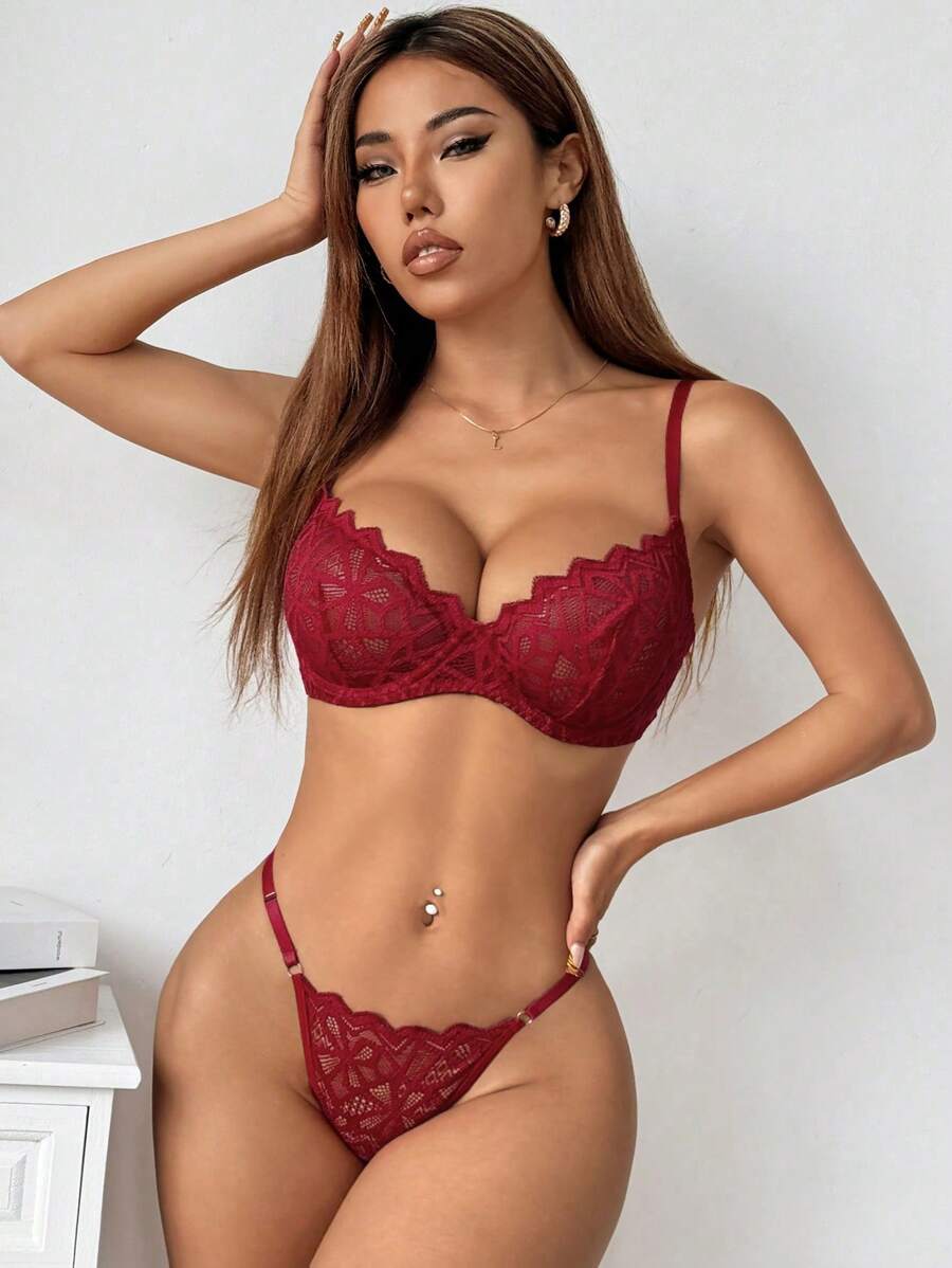 2 piezas conjunto de brasier con aros y encaje de unicolor sexy para mujer