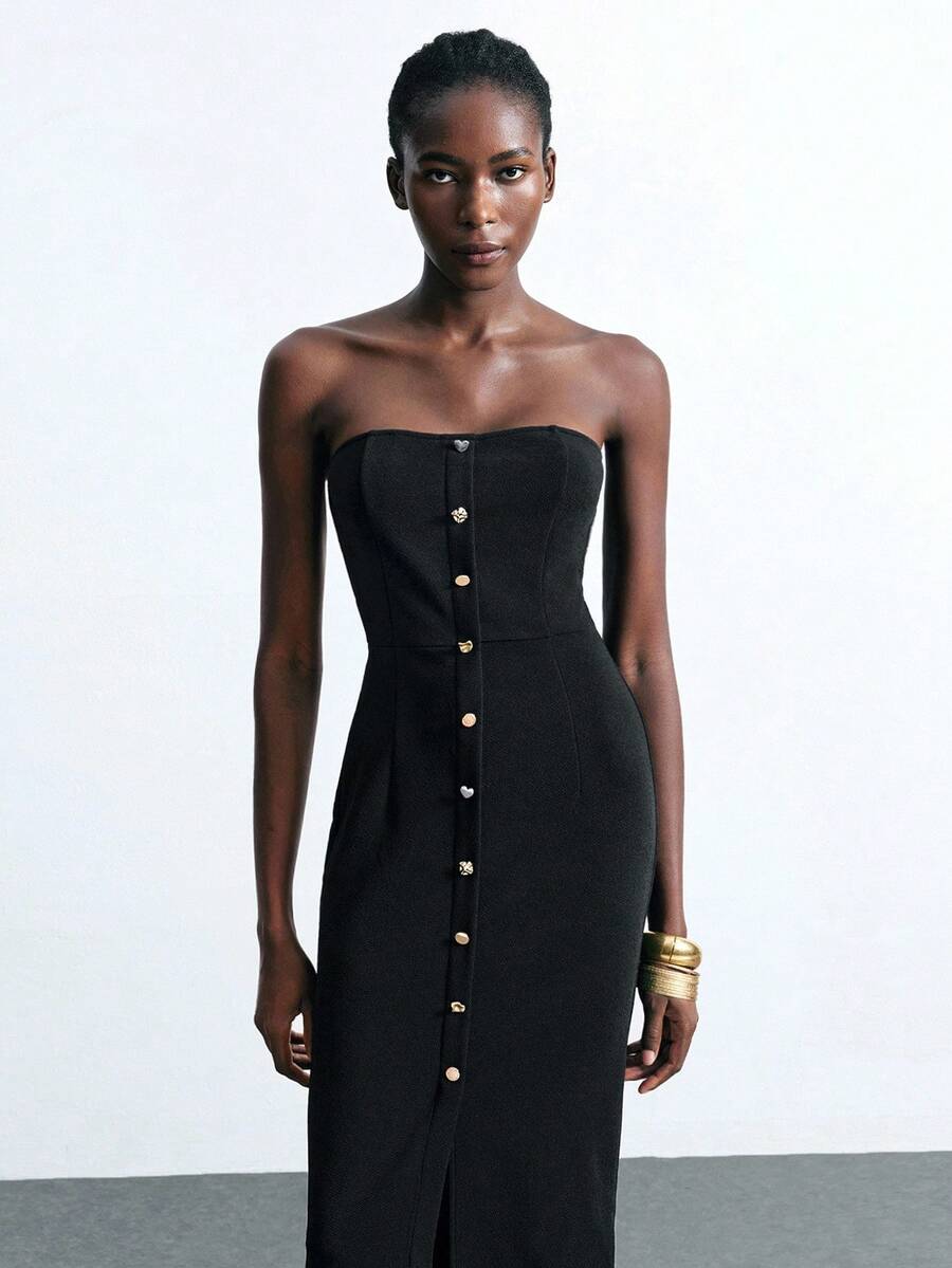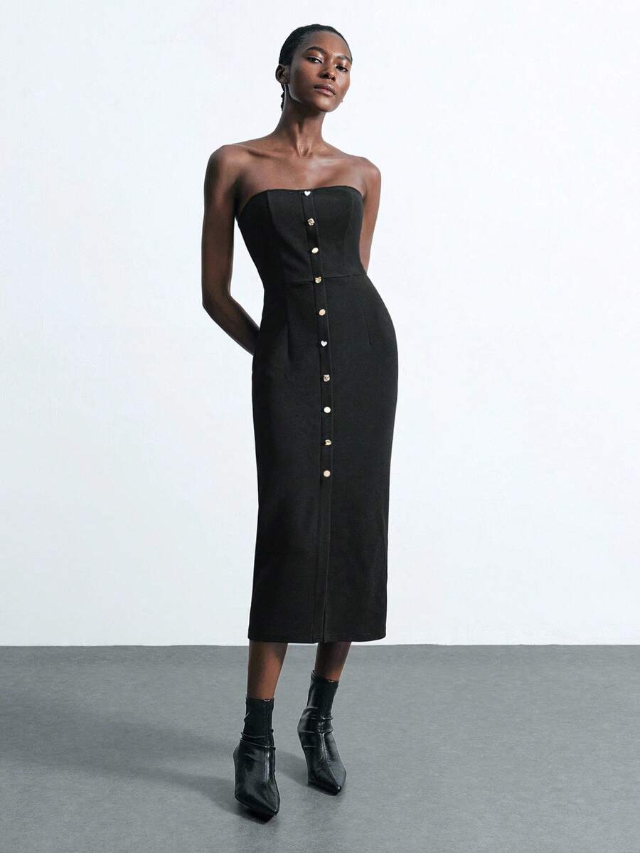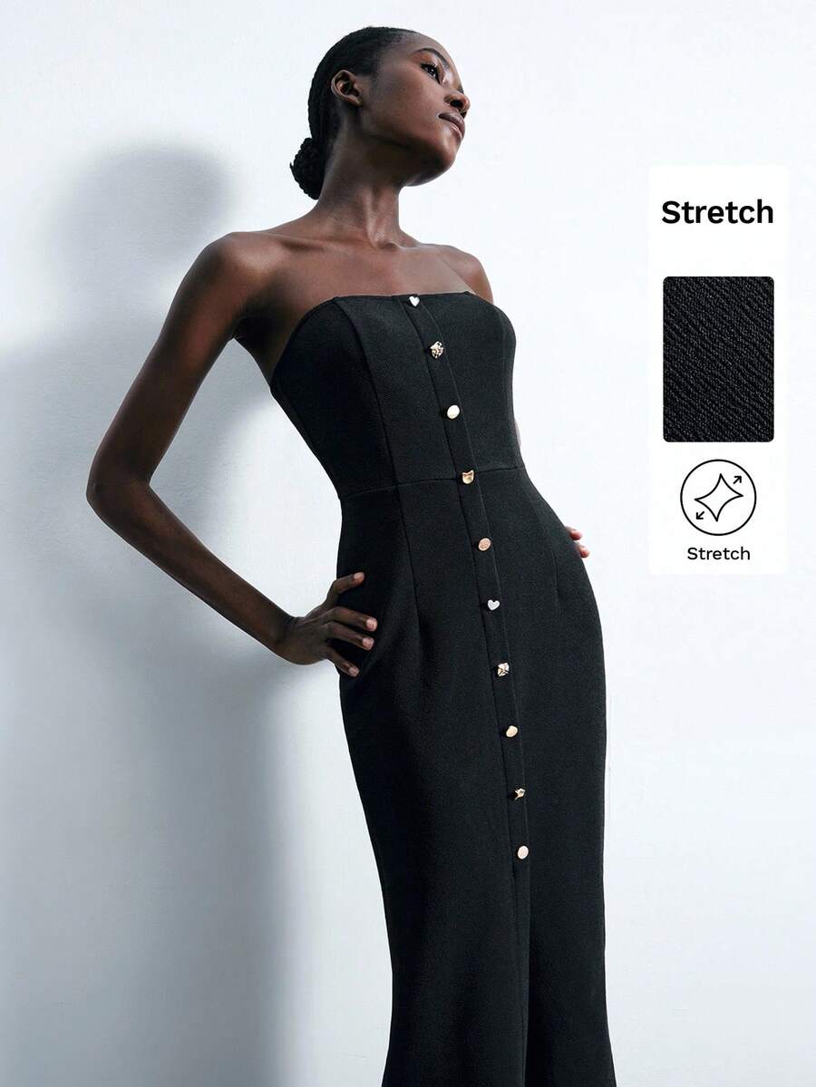 Vestido elegante sin tirantes con decoracion metalica para mujer, adecuado para la temporada de regreso a clases 2025