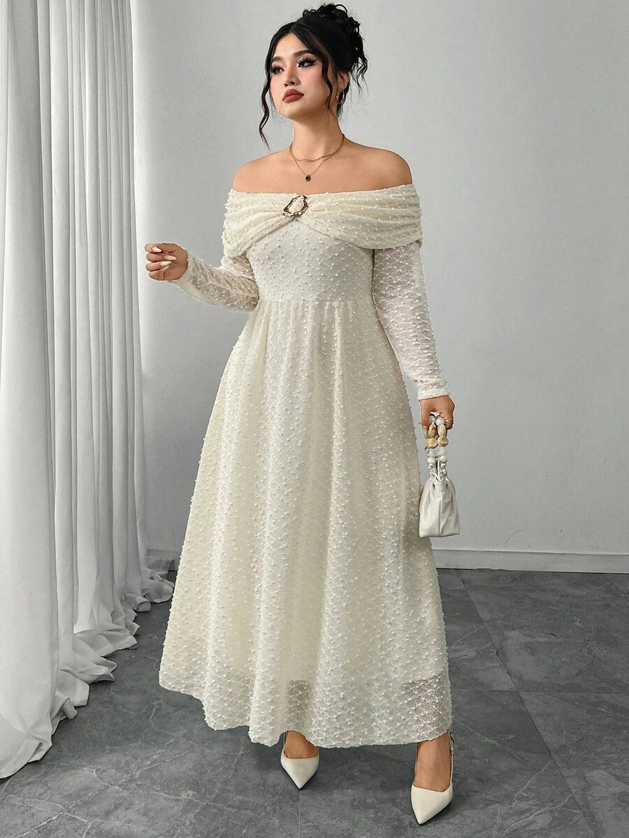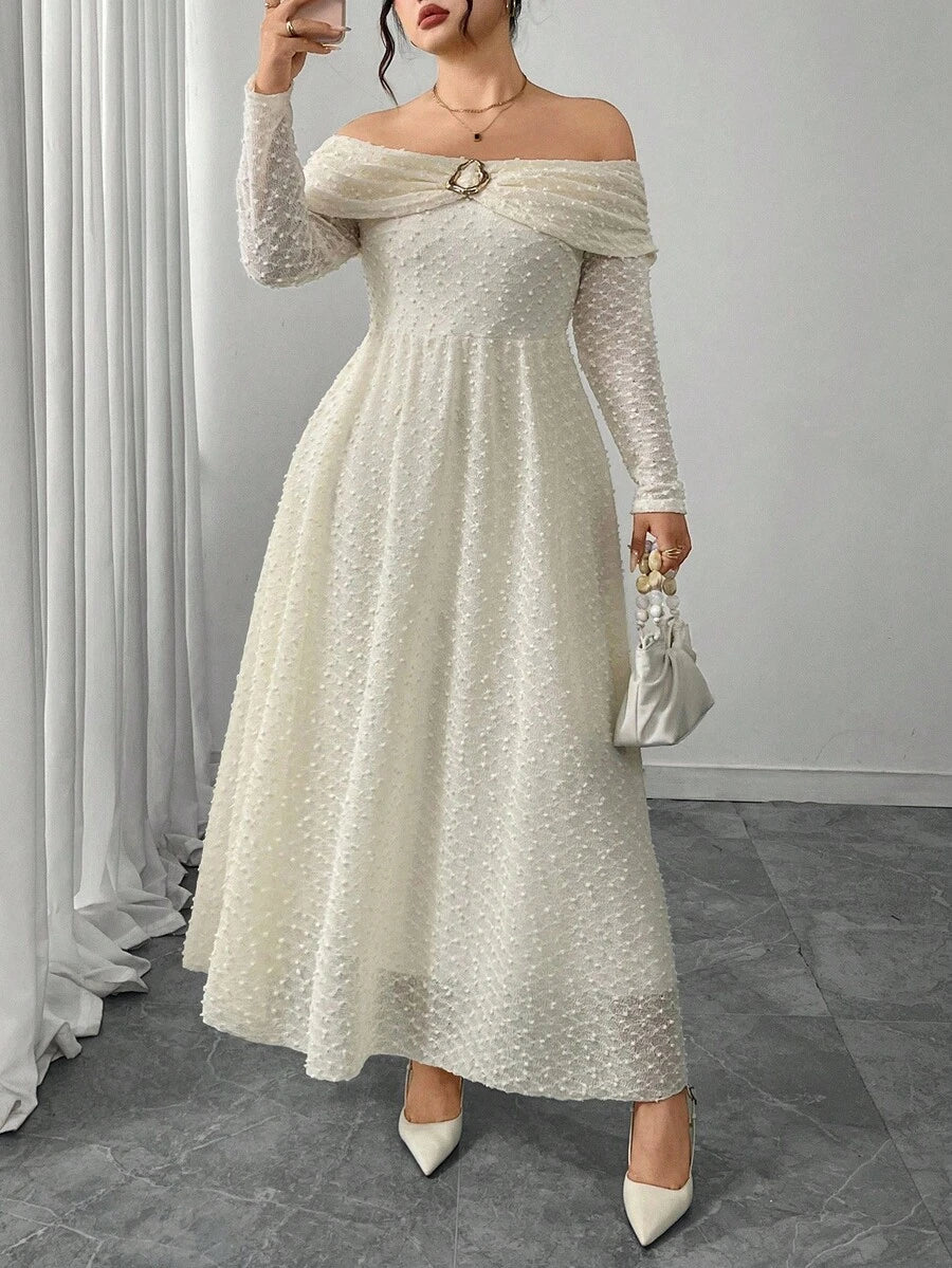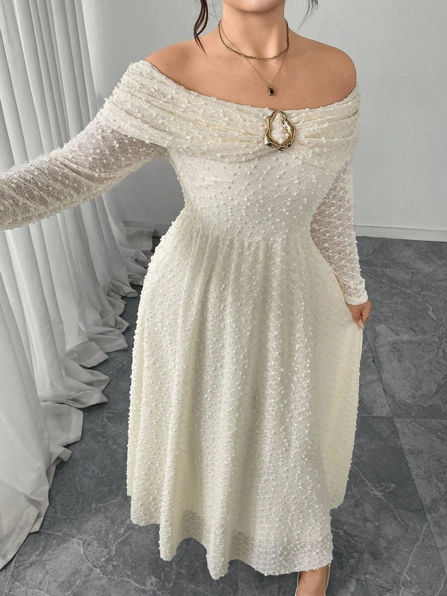 Vestido elegante de manga larga con hombros descubiertos y botones metalicos para mujer de talla grande