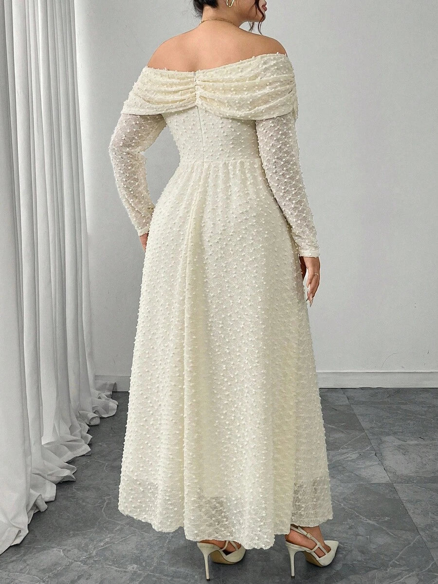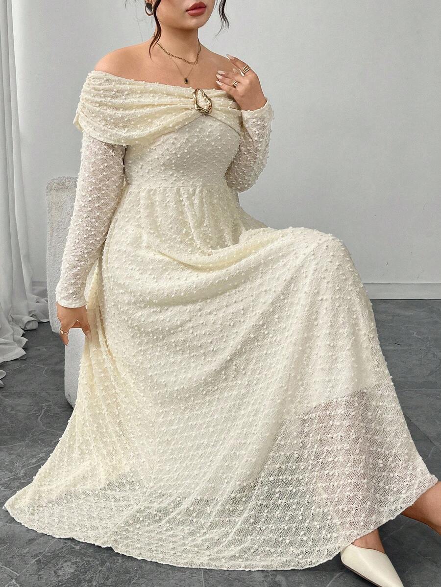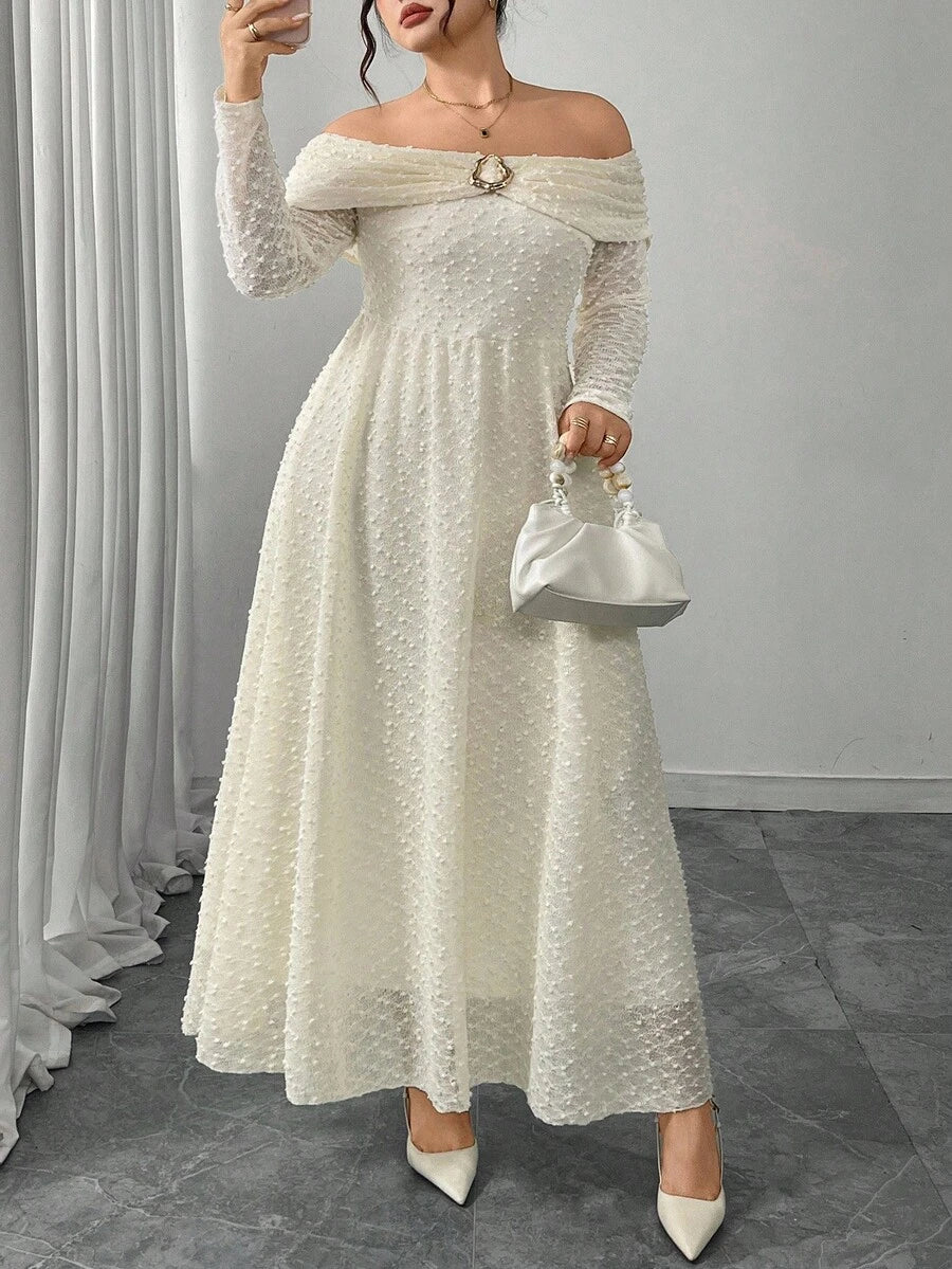 Vestido elegante de manga larga con hombros descubiertos y botones metalicos para mujer de talla grande