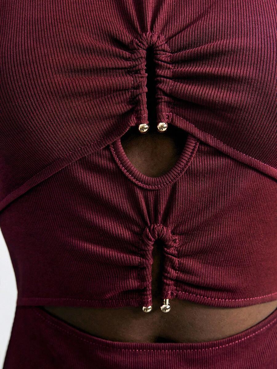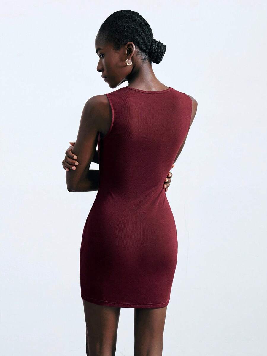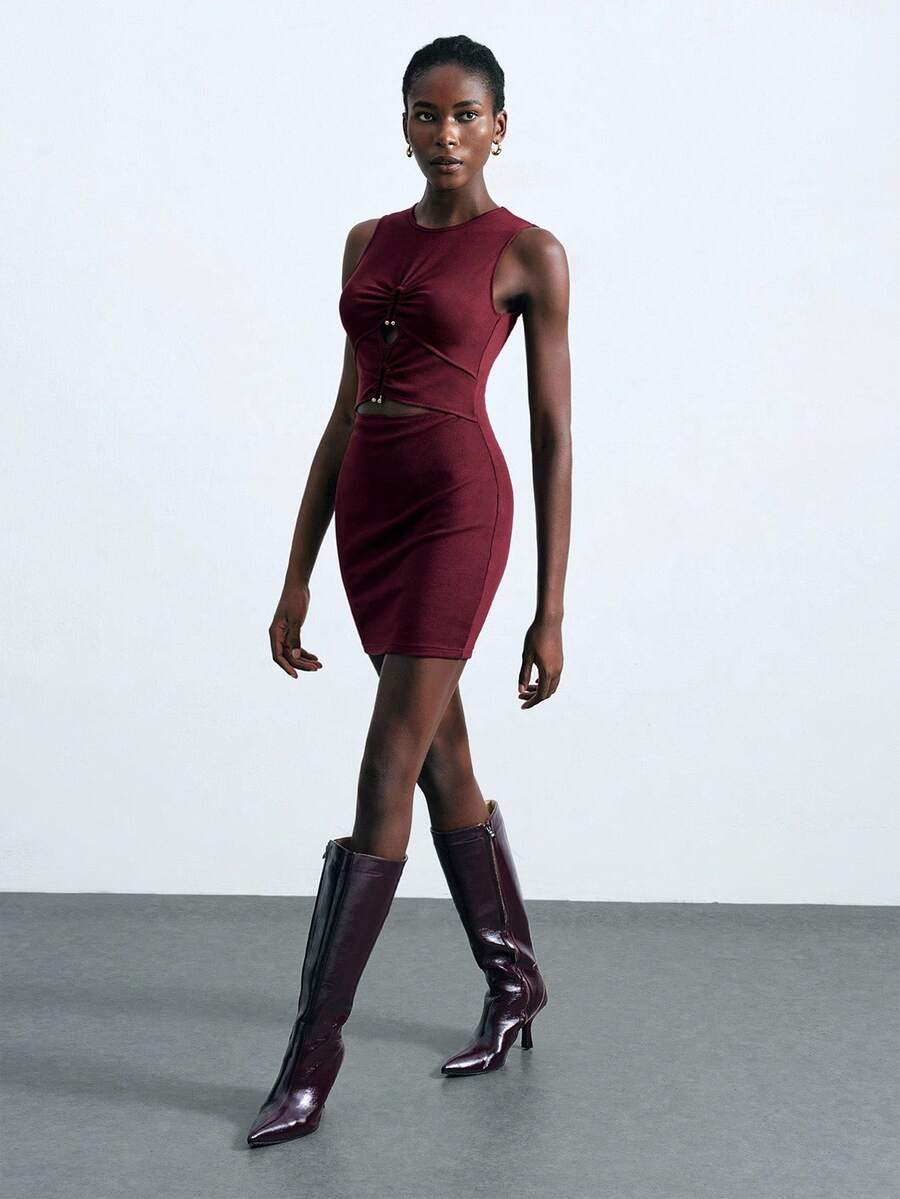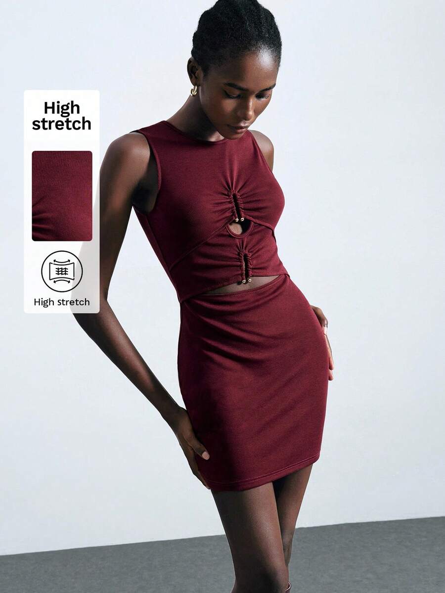 Vestido mini ajustado con diseno de hebilla metalica en forma de u y cuello redondo, adecuado para la temporada de fiestas a principios del otono