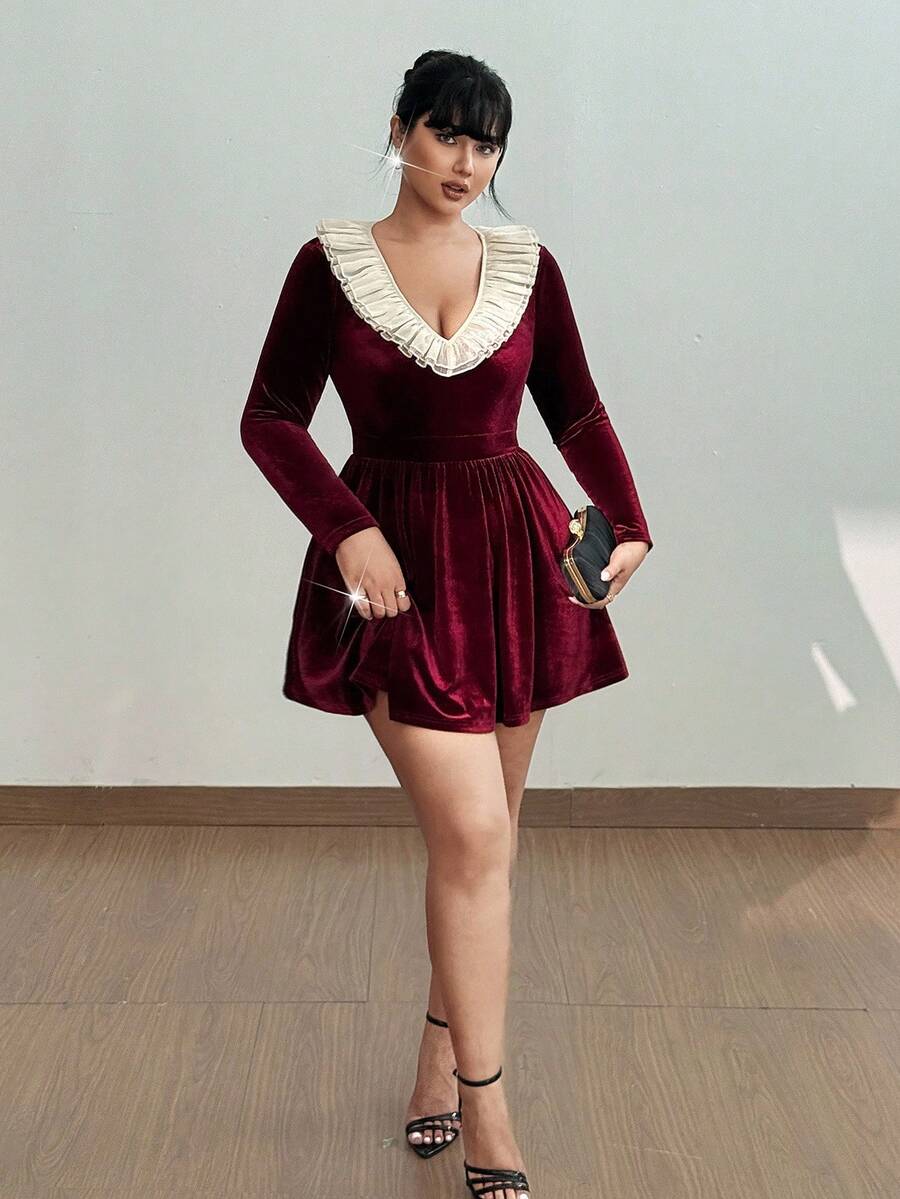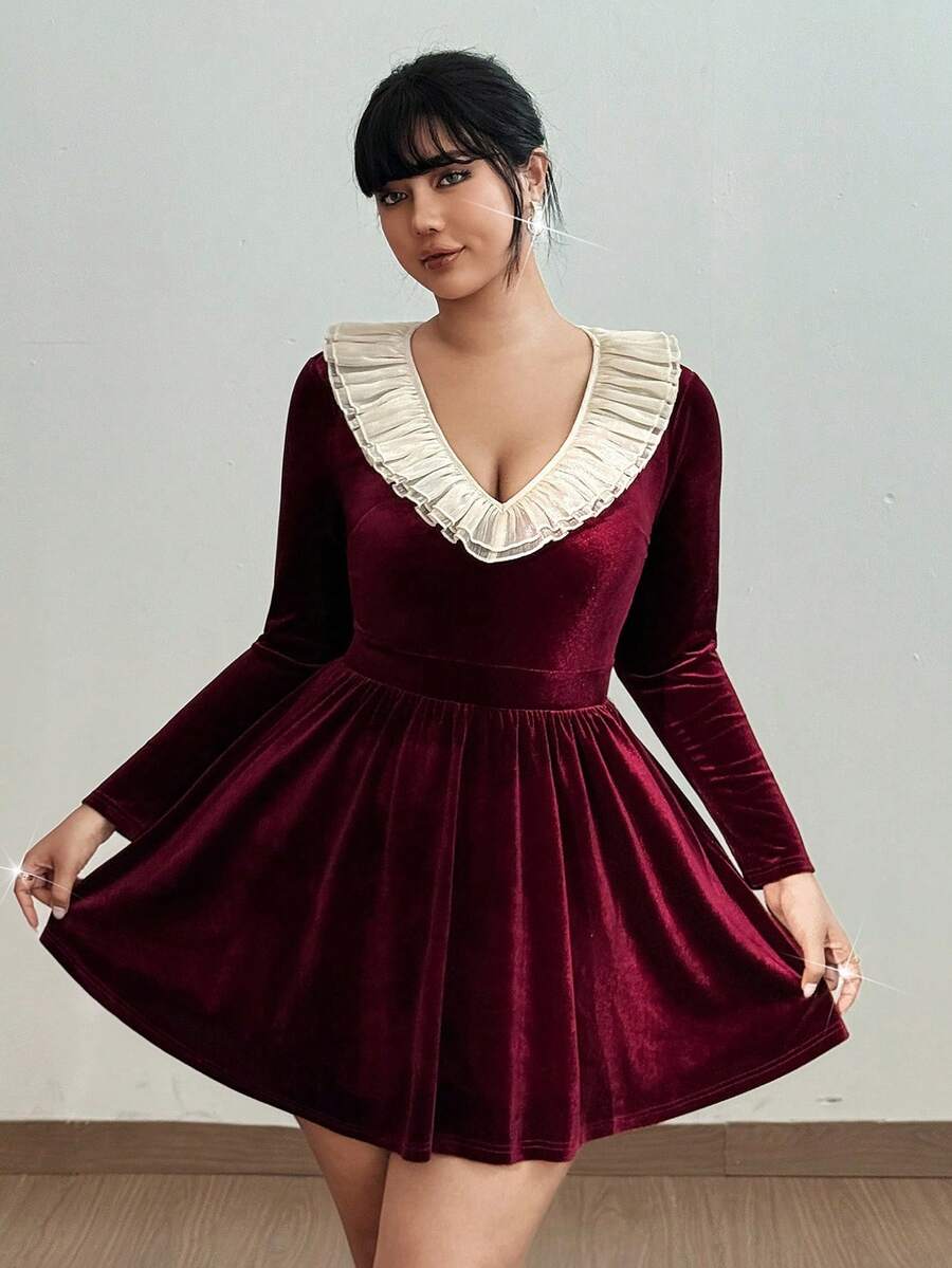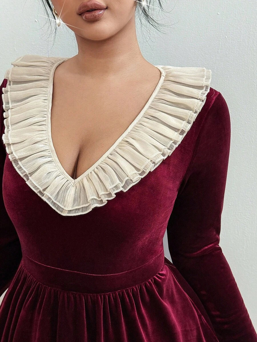 Viva relle vestido de fiesta de talla grande para mujer 2025 con cuello en v profundo, cintura de encaje y terciopelo, y falda acampanada en linea a