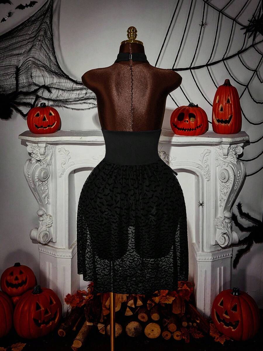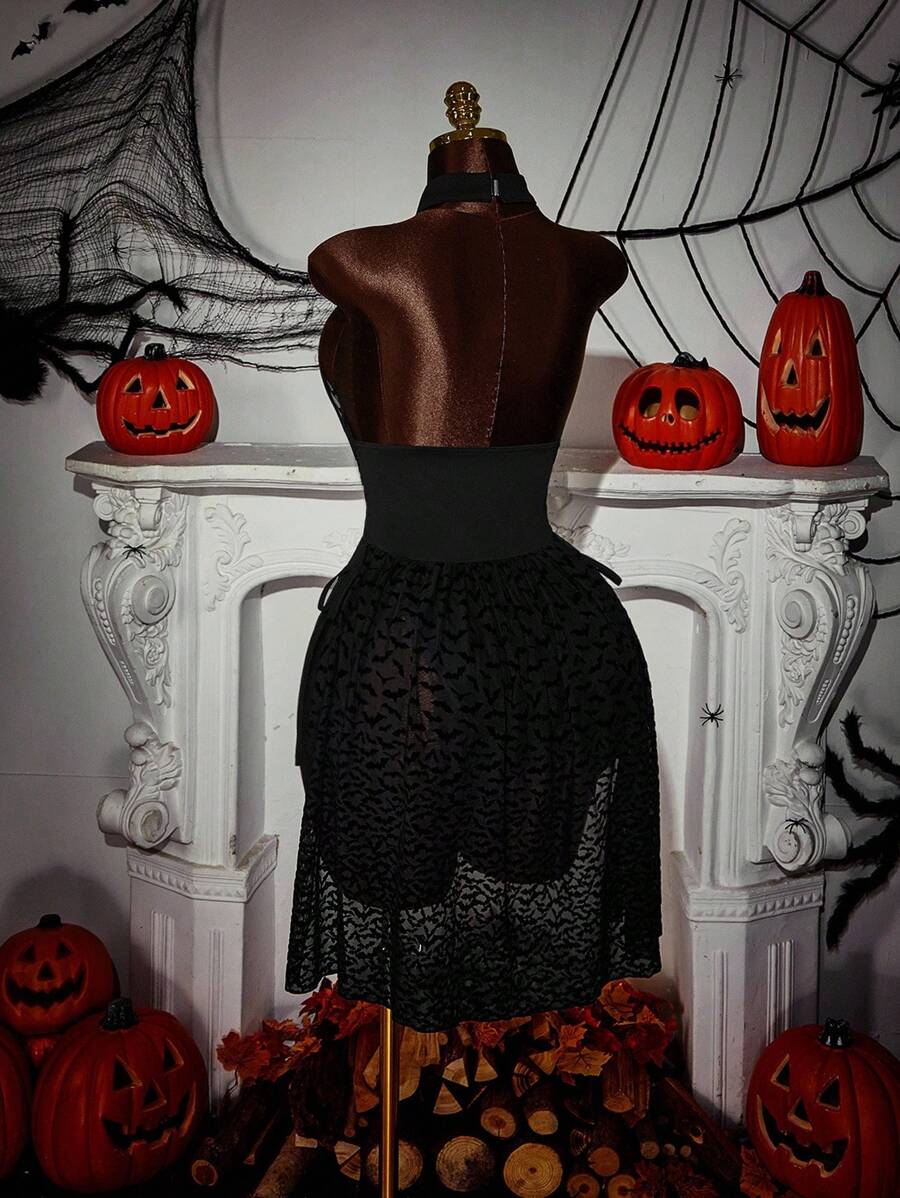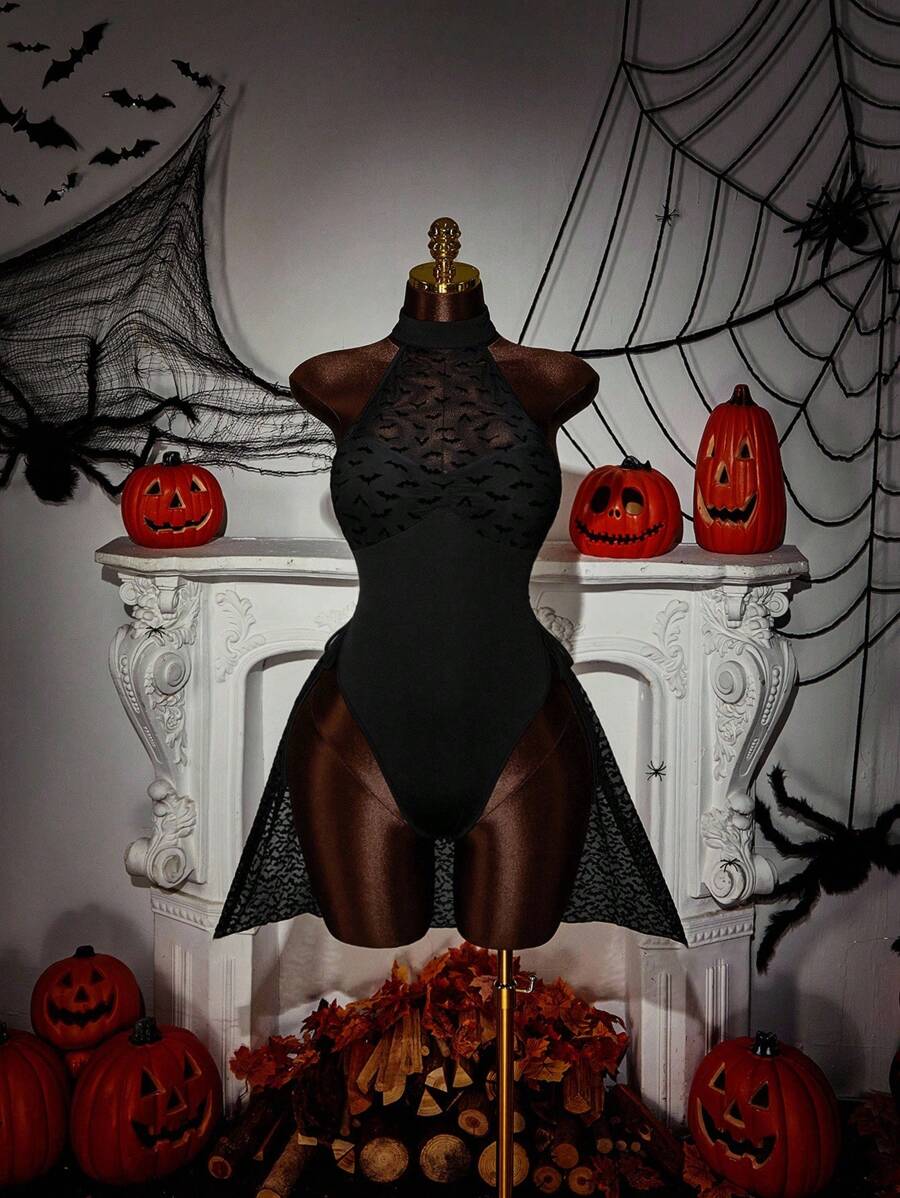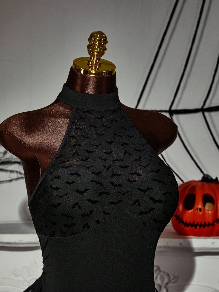 Amplova body de estilo gotico con estampado de murcielago, cuello halter y cordon lateral para mujer de talla grande