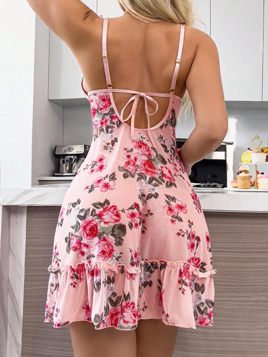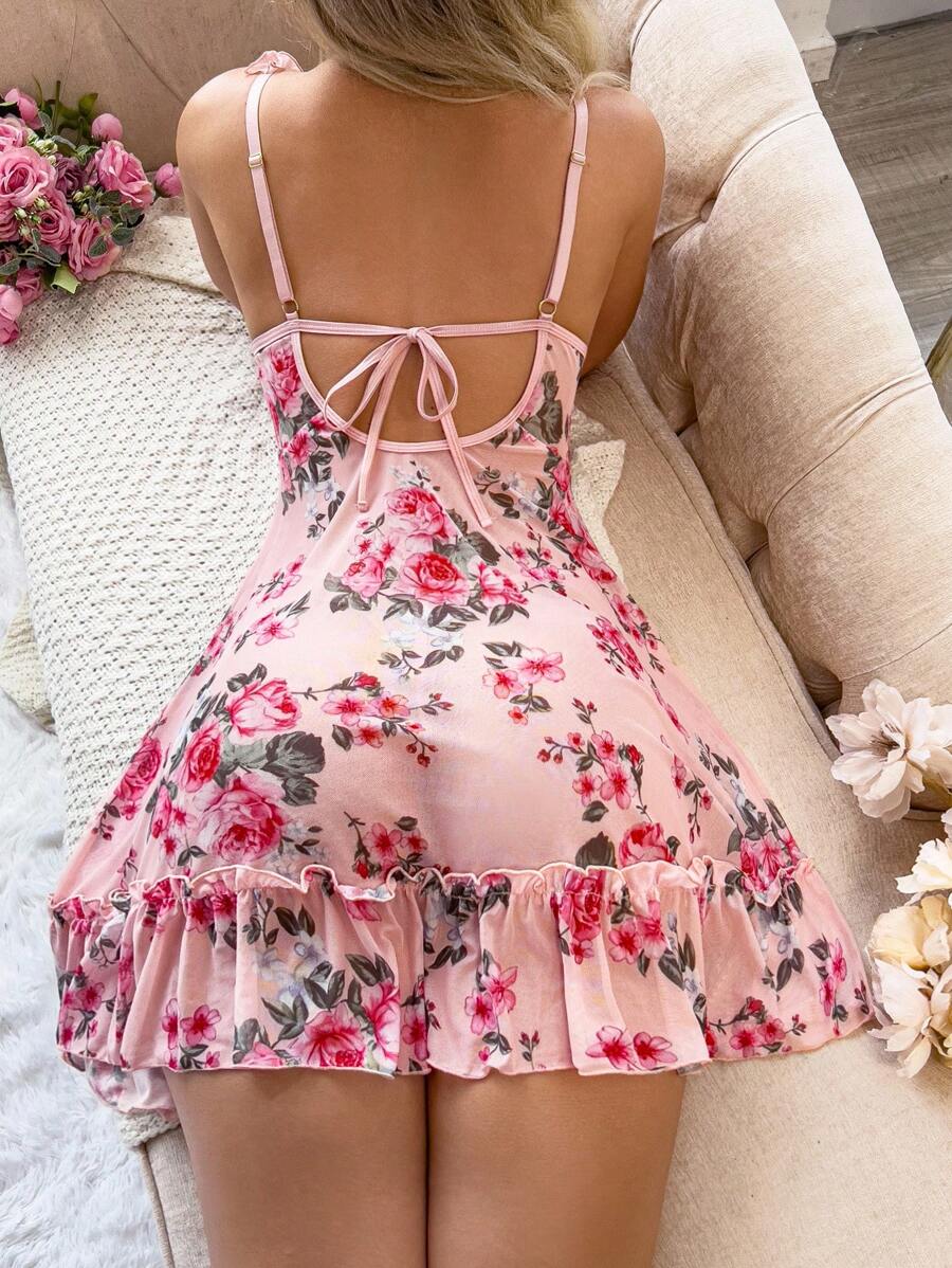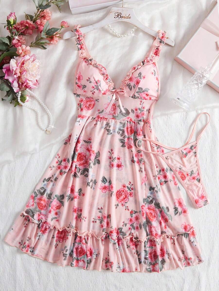 2 piezas camison sexy con volantes florales romanticos y lazo delantero sin espalda para mujeres, para salir