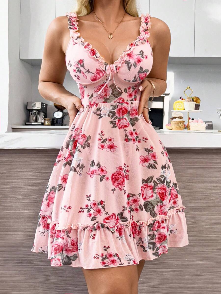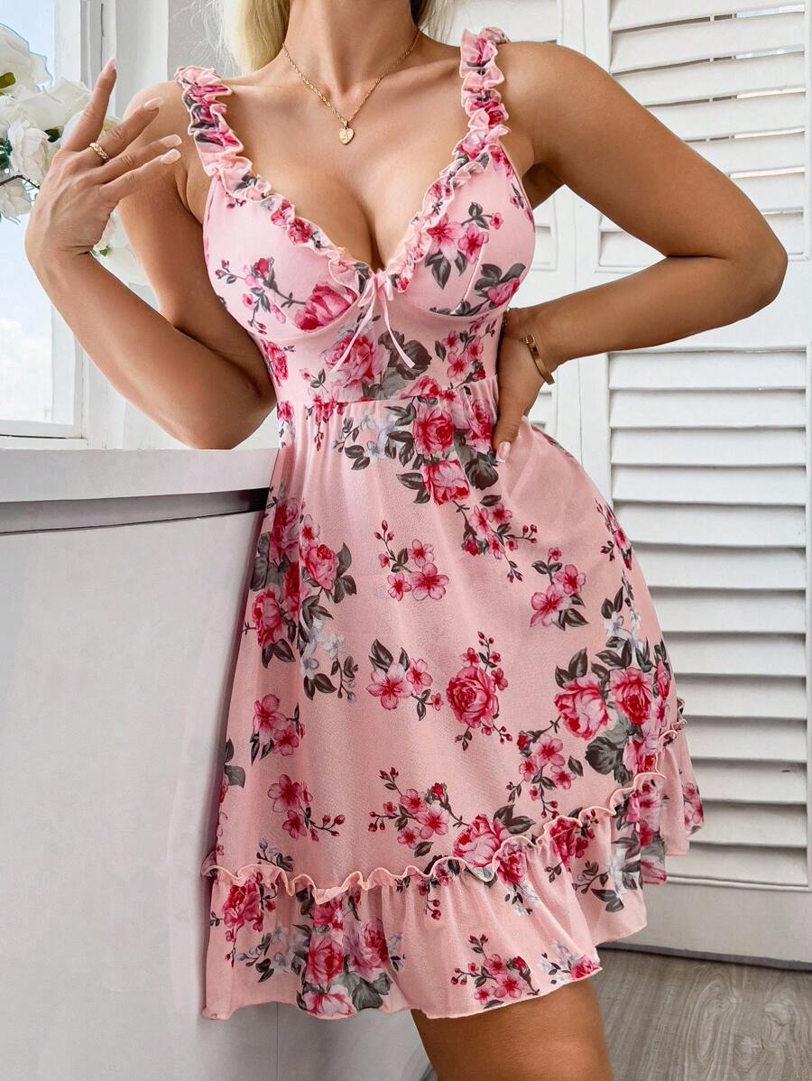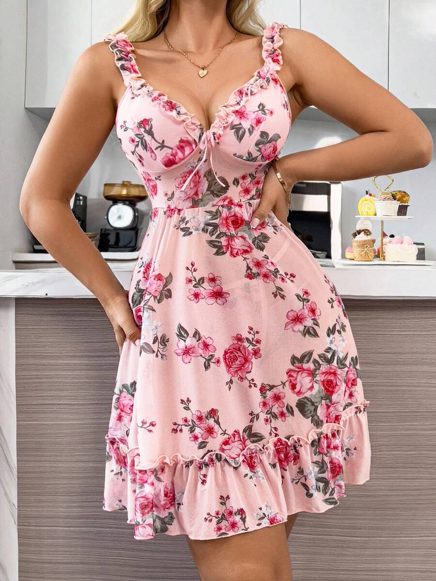 2 piezas camison sexy con volantes florales romanticos y lazo delantero sin espalda para mujeres, para salir