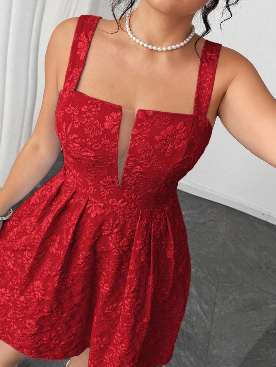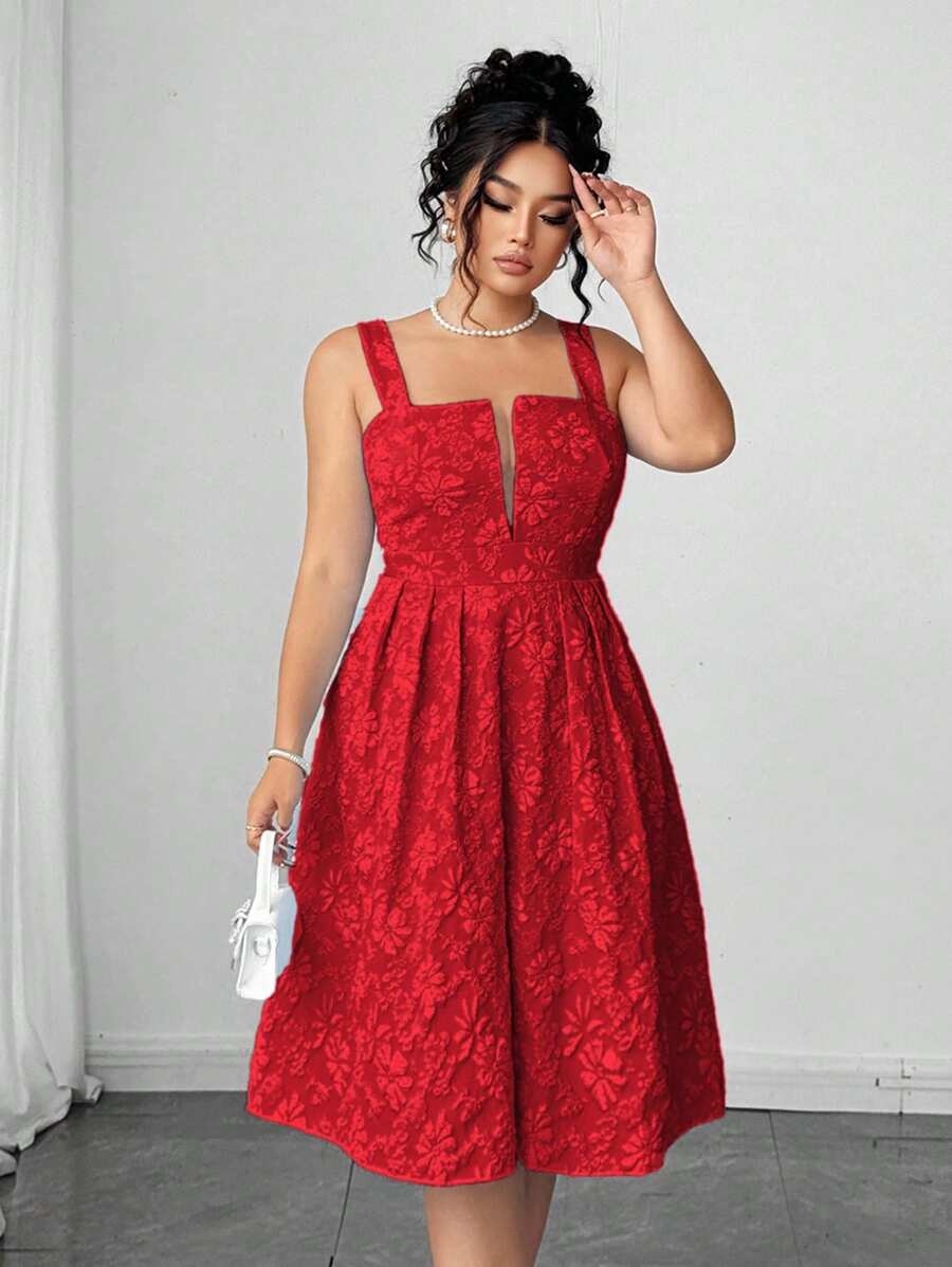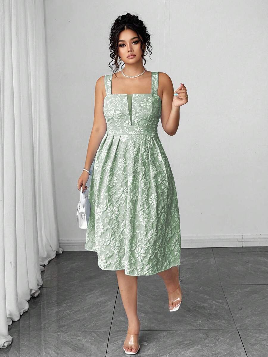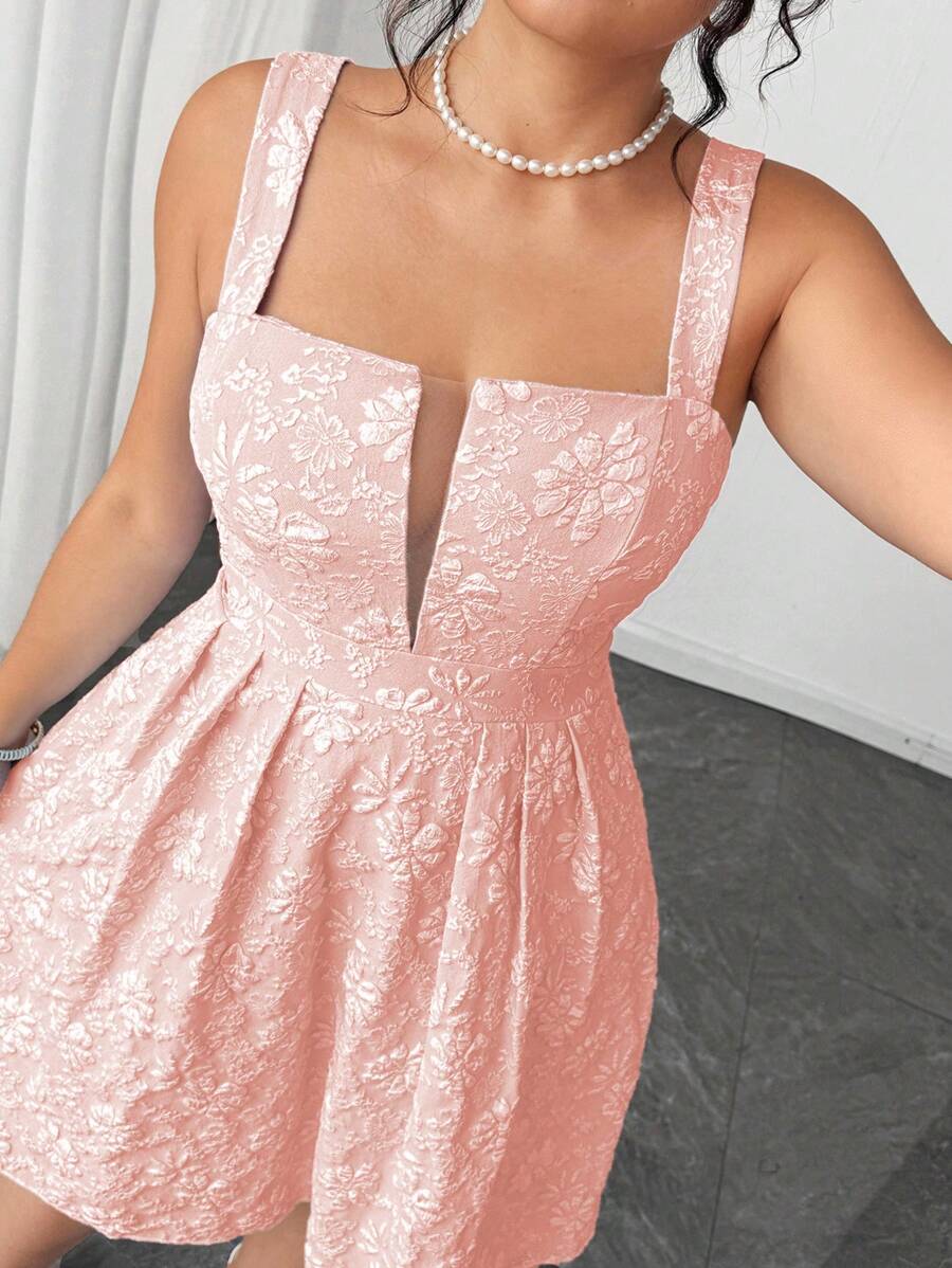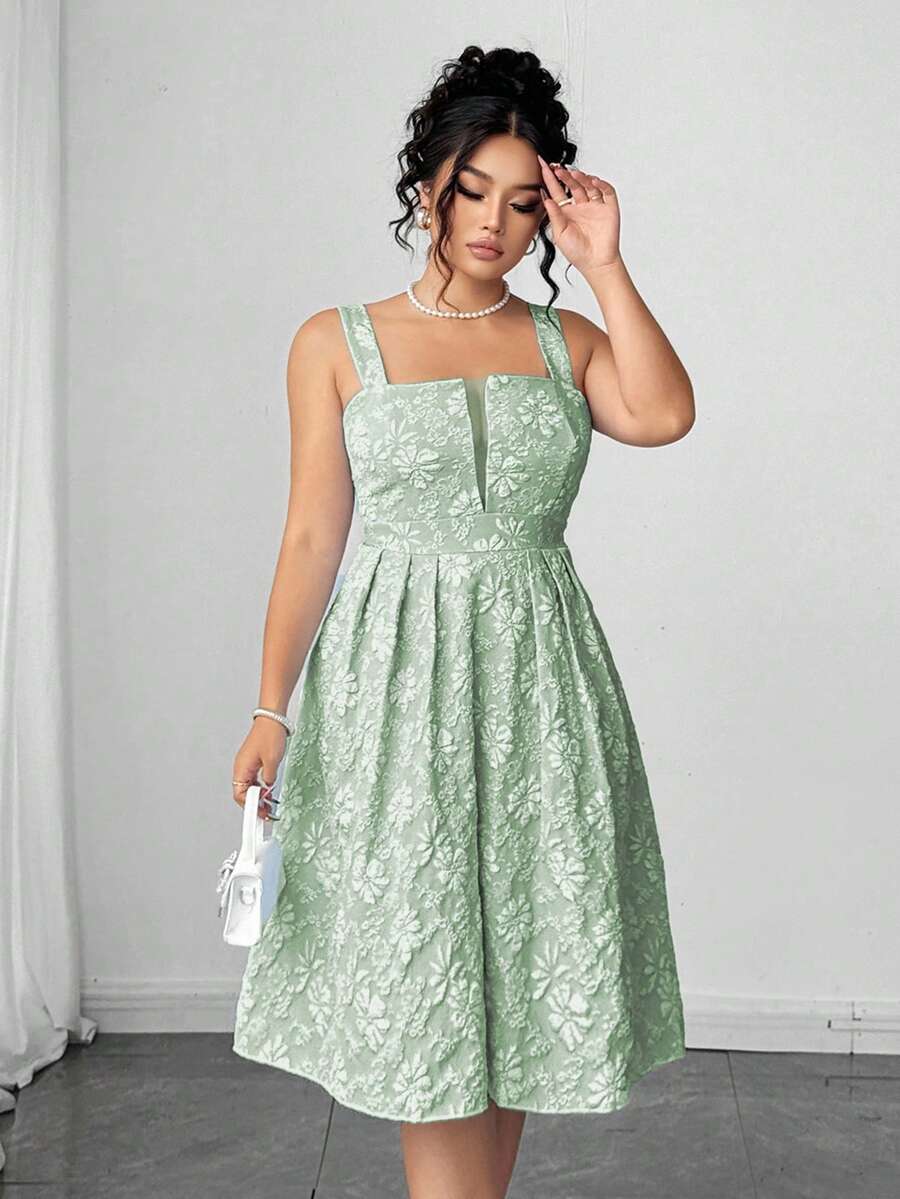 Vestido de tirantes casual de estilo vacacional para mujer talla grande con diseno de cintura en tejido jacquard con textura y escote en v