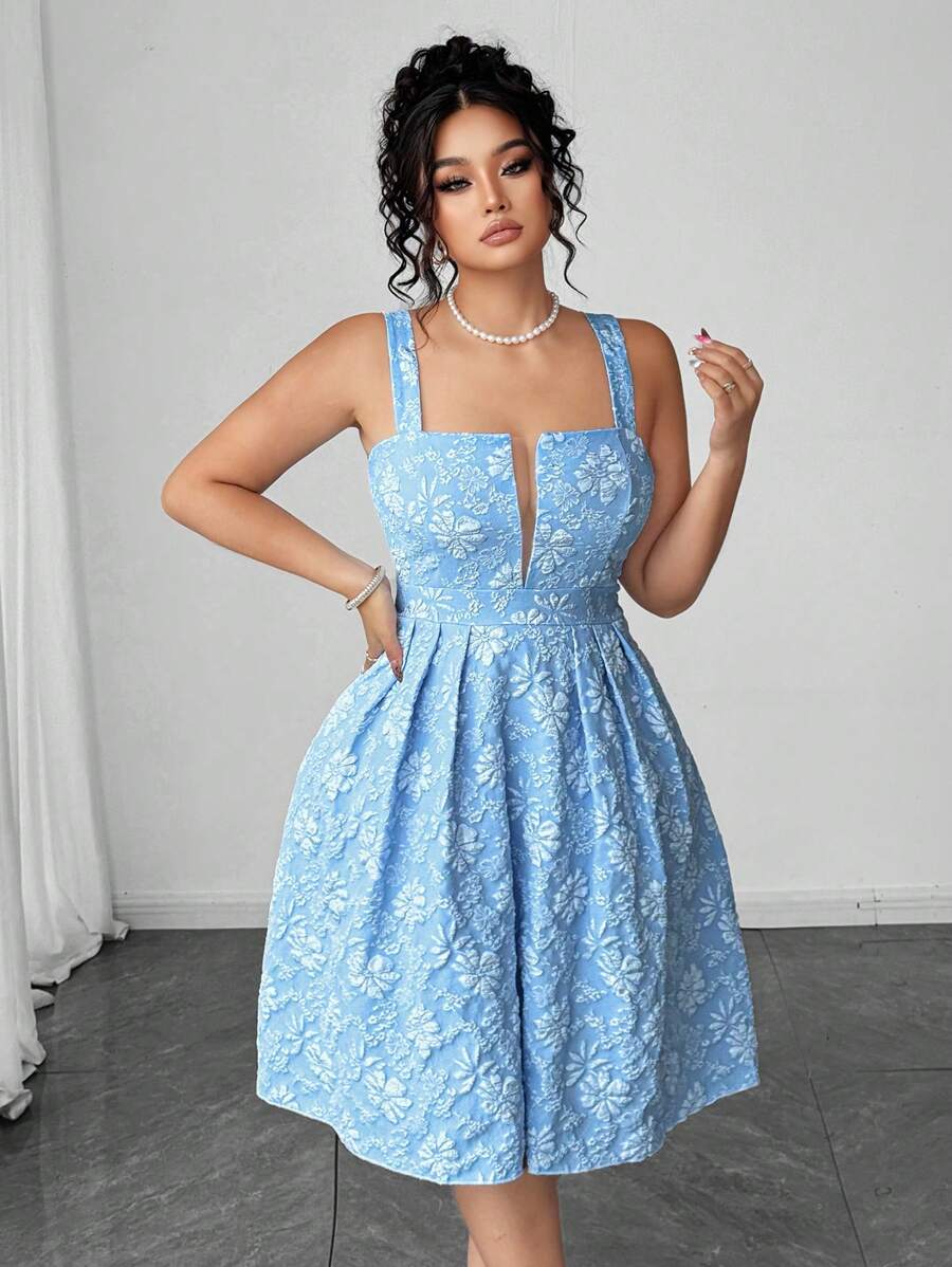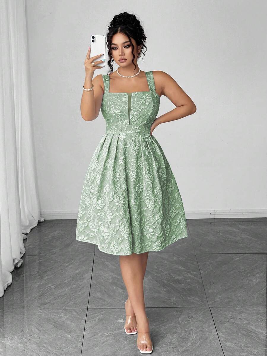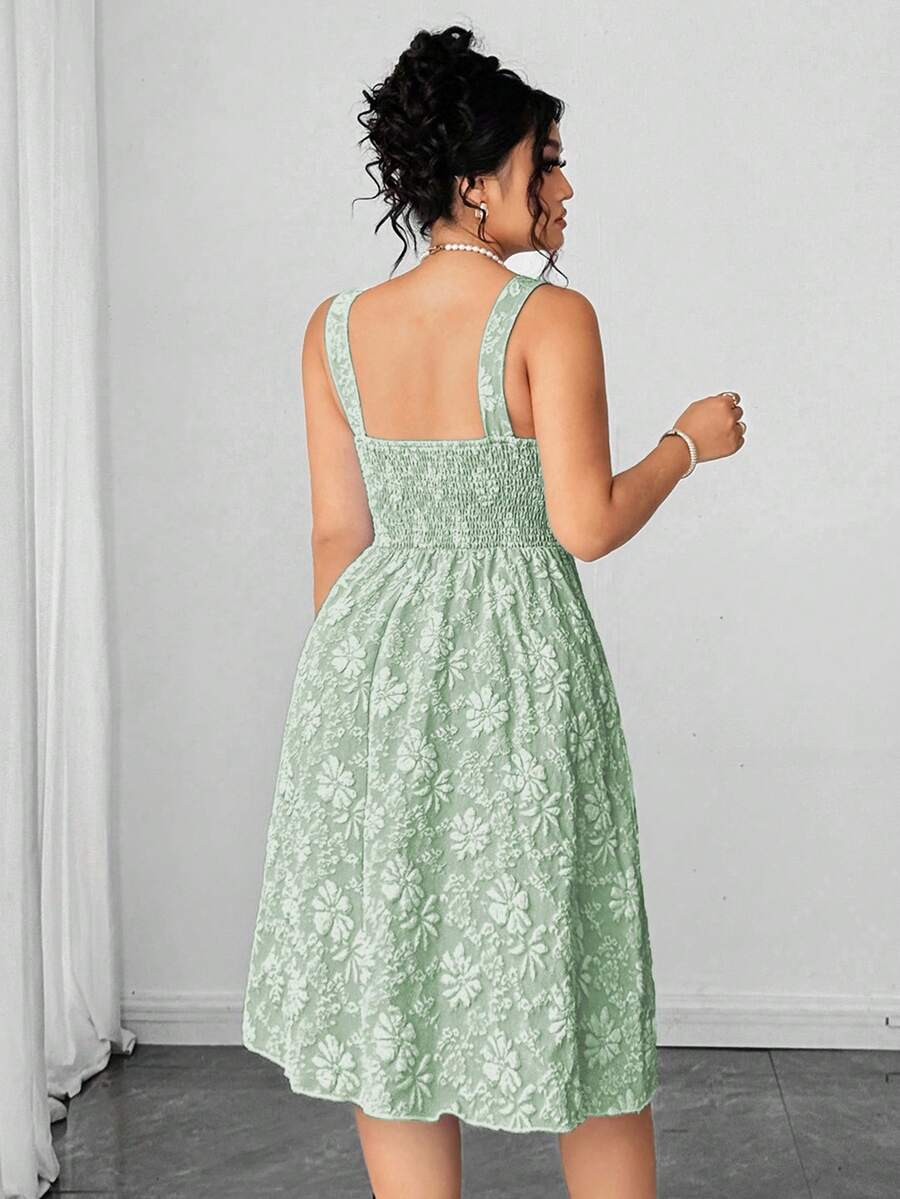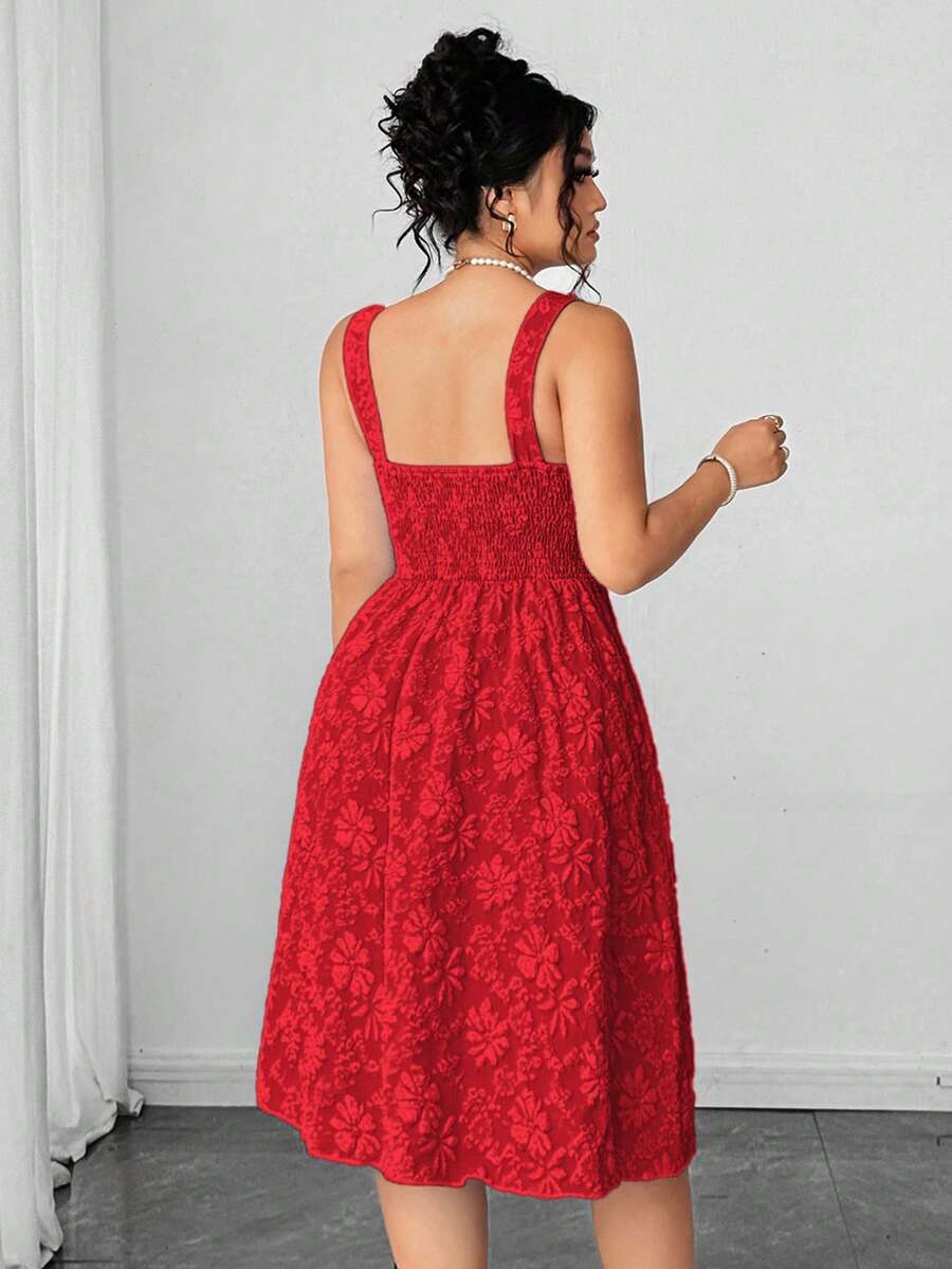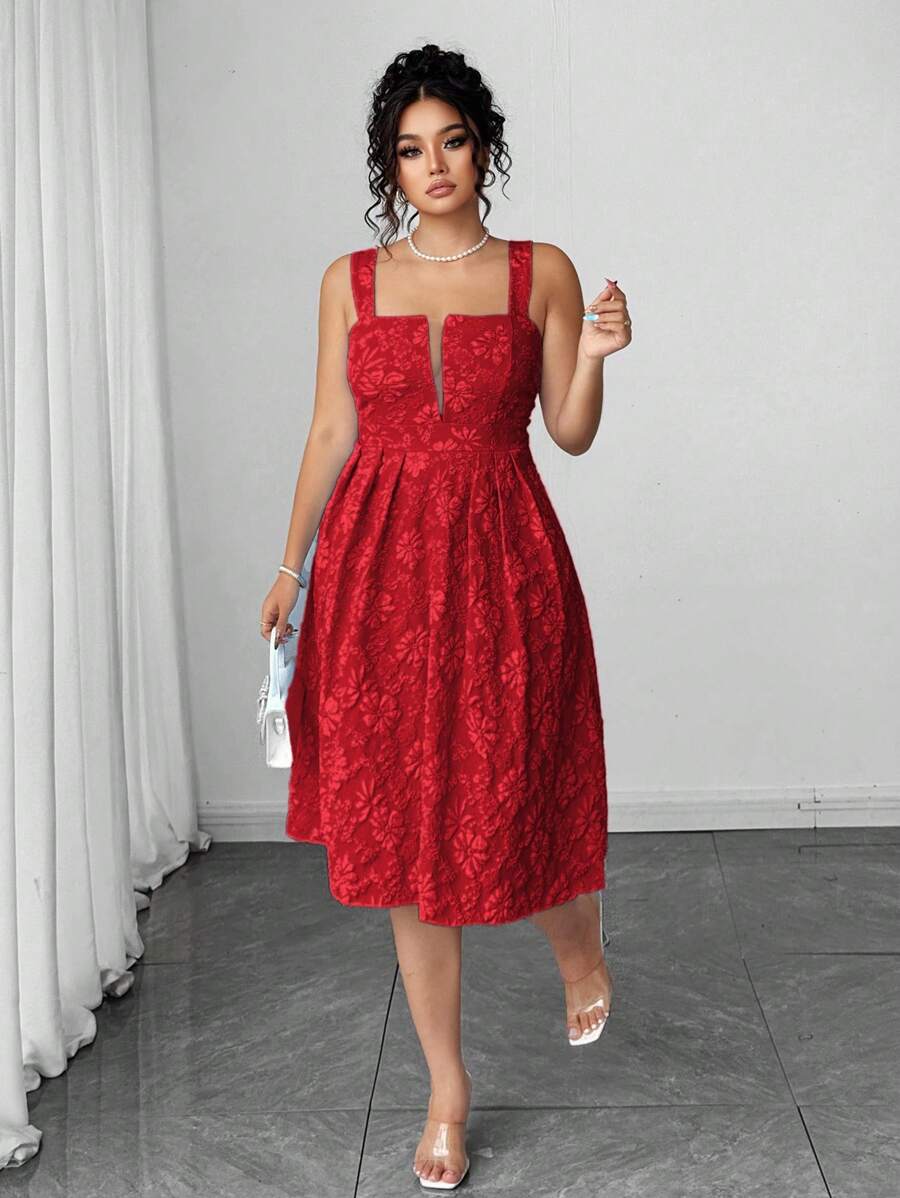 Vestido de tirantes casual de estilo vacacional para mujer talla grande con diseno de cintura en tejido jacquard con textura y escote en v