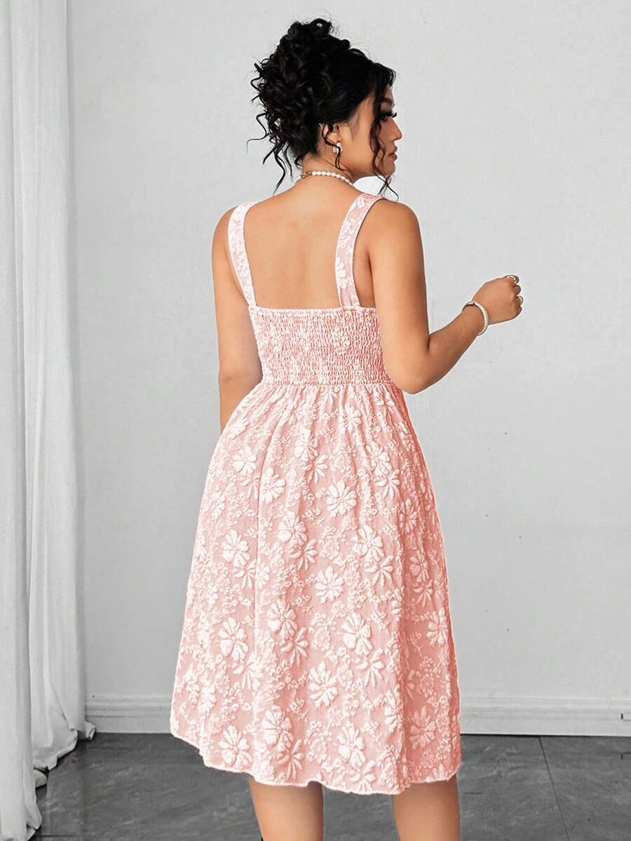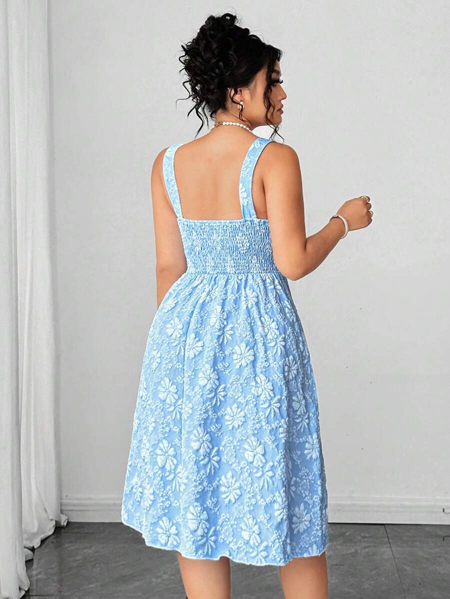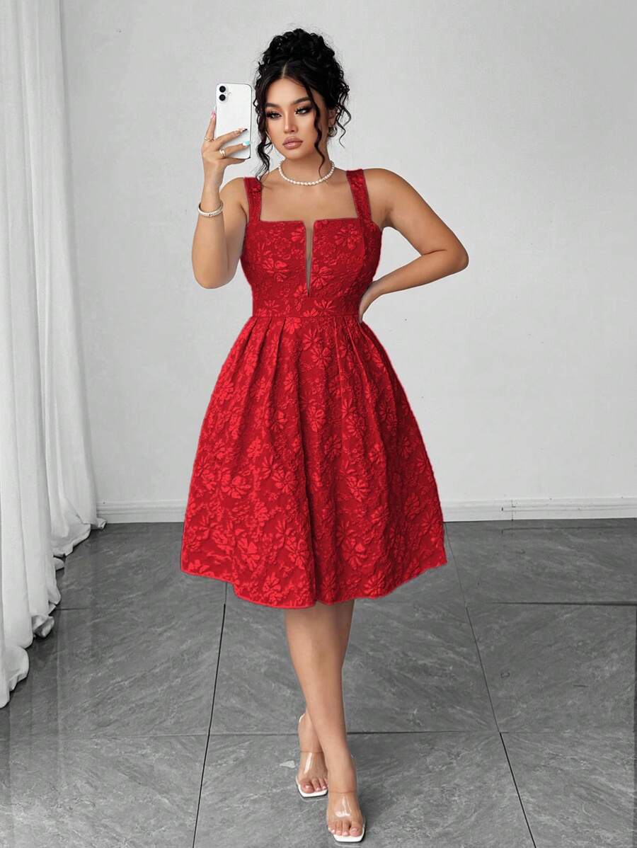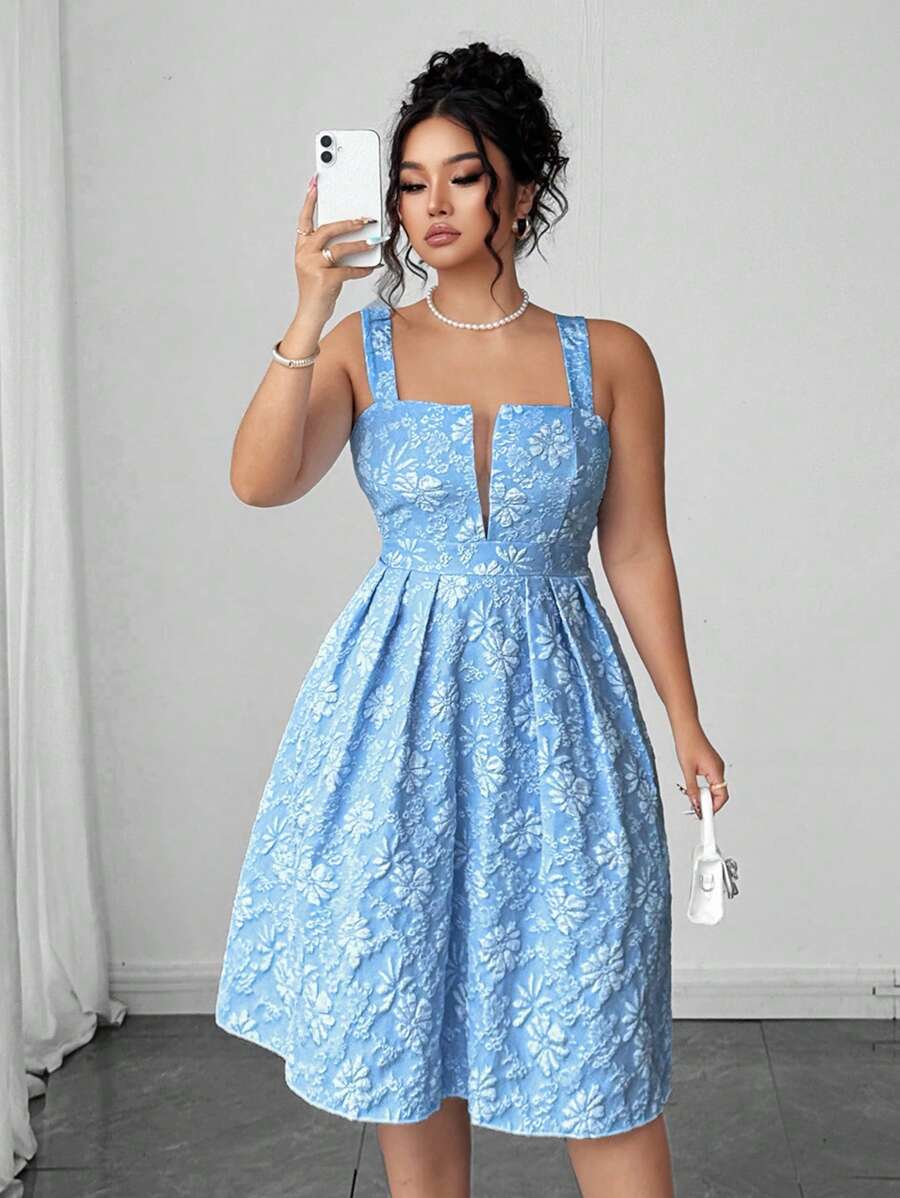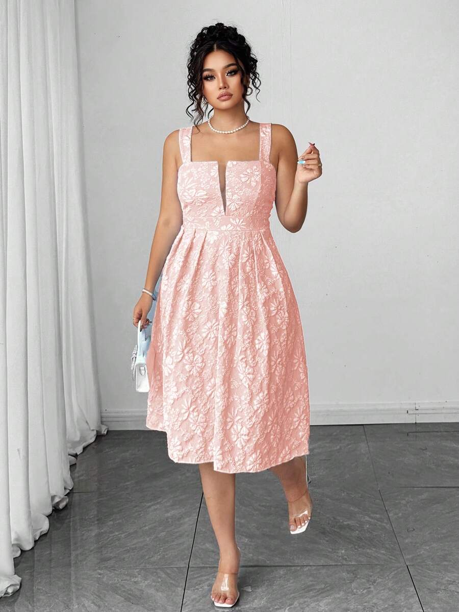 Vestido de tirantes casual de estilo vacacional para mujer talla grande con diseno de cintura en tejido jacquard con textura y escote en v