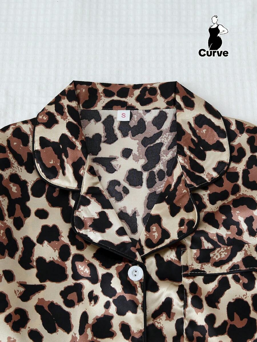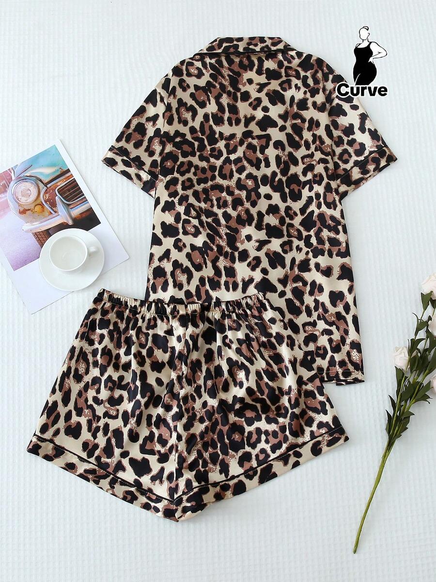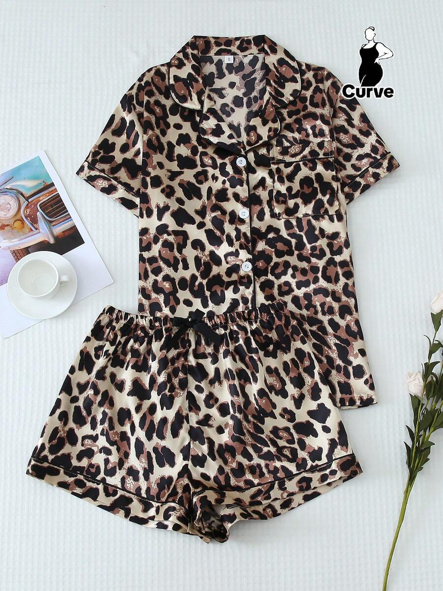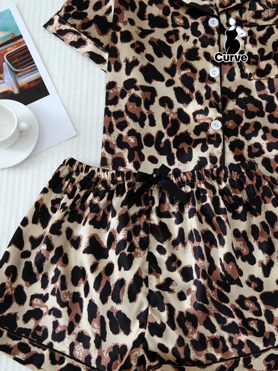 2 piezas conjunto de pijama de saten con estampado de leopardo talla grande, top de manga corta con solapa y botones, y shorts con lazo, ropa de dormir y de estar por casa de verano