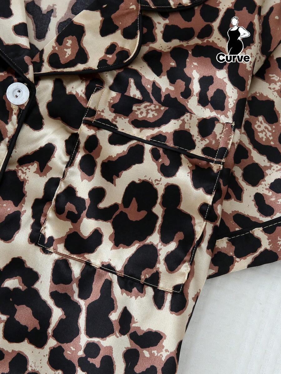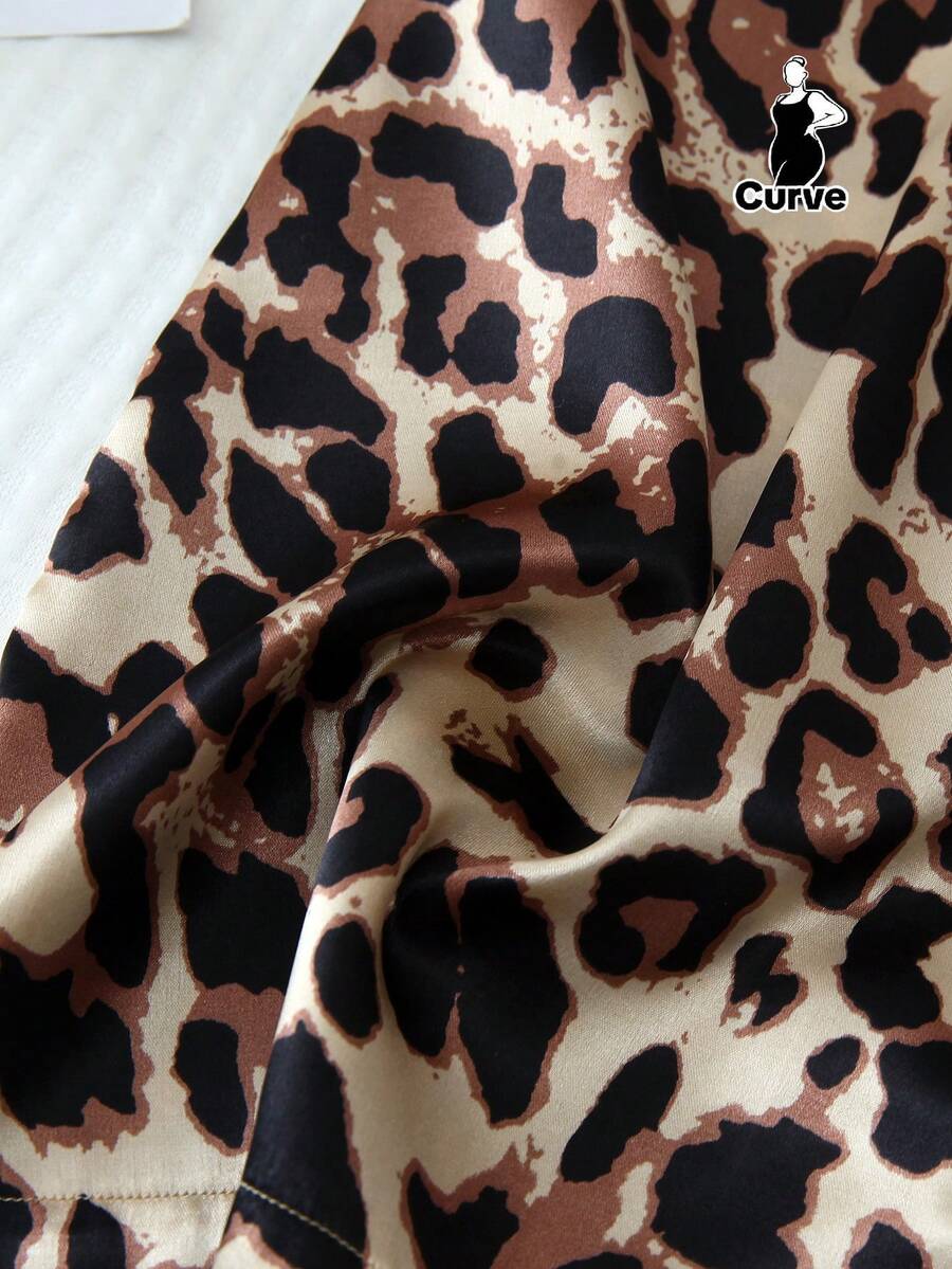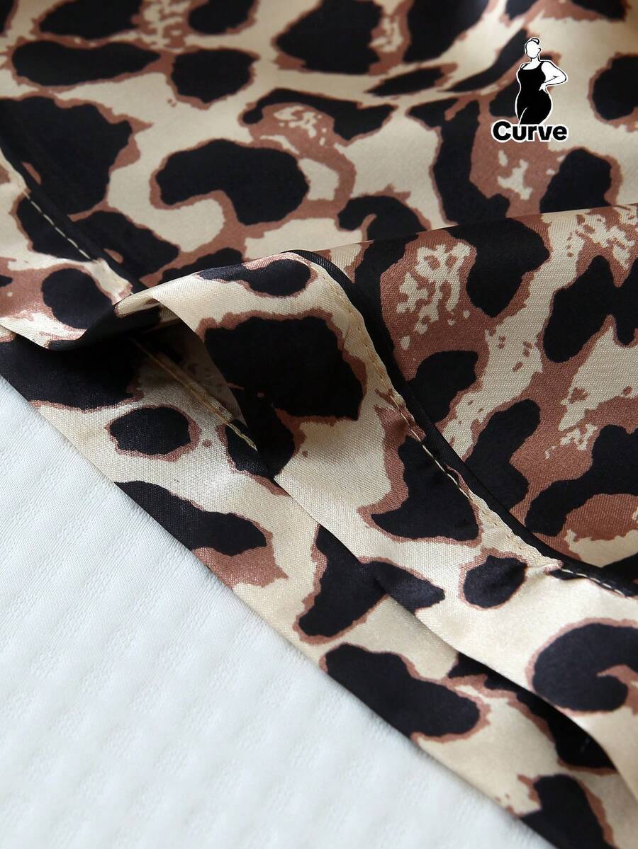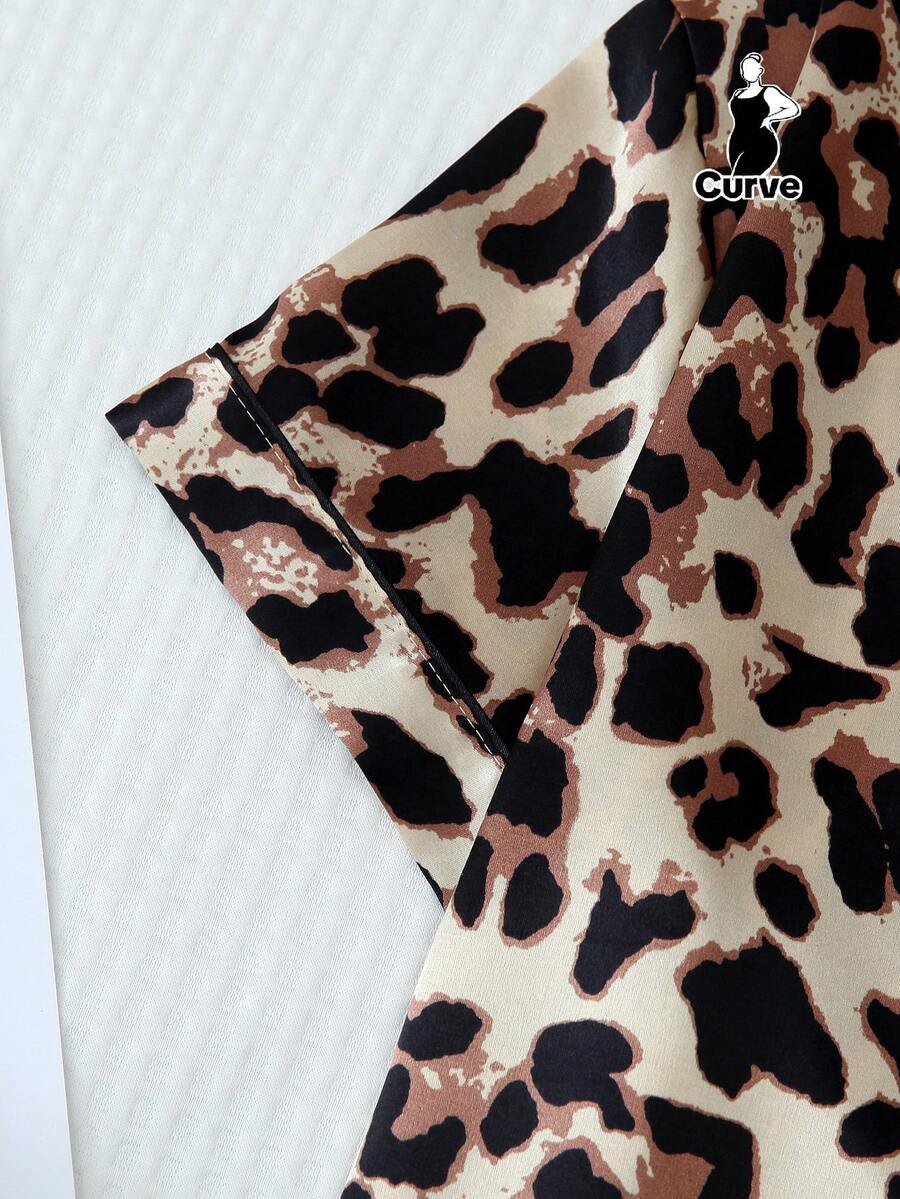 2 piezas conjunto de pijama de saten con estampado de leopardo talla grande, top de manga corta con solapa y botones, y shorts con lazo, ropa de dormir y de estar por casa de verano