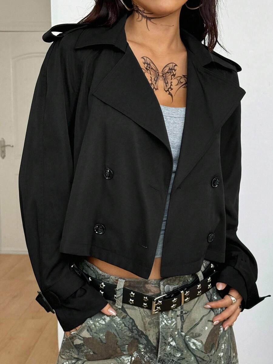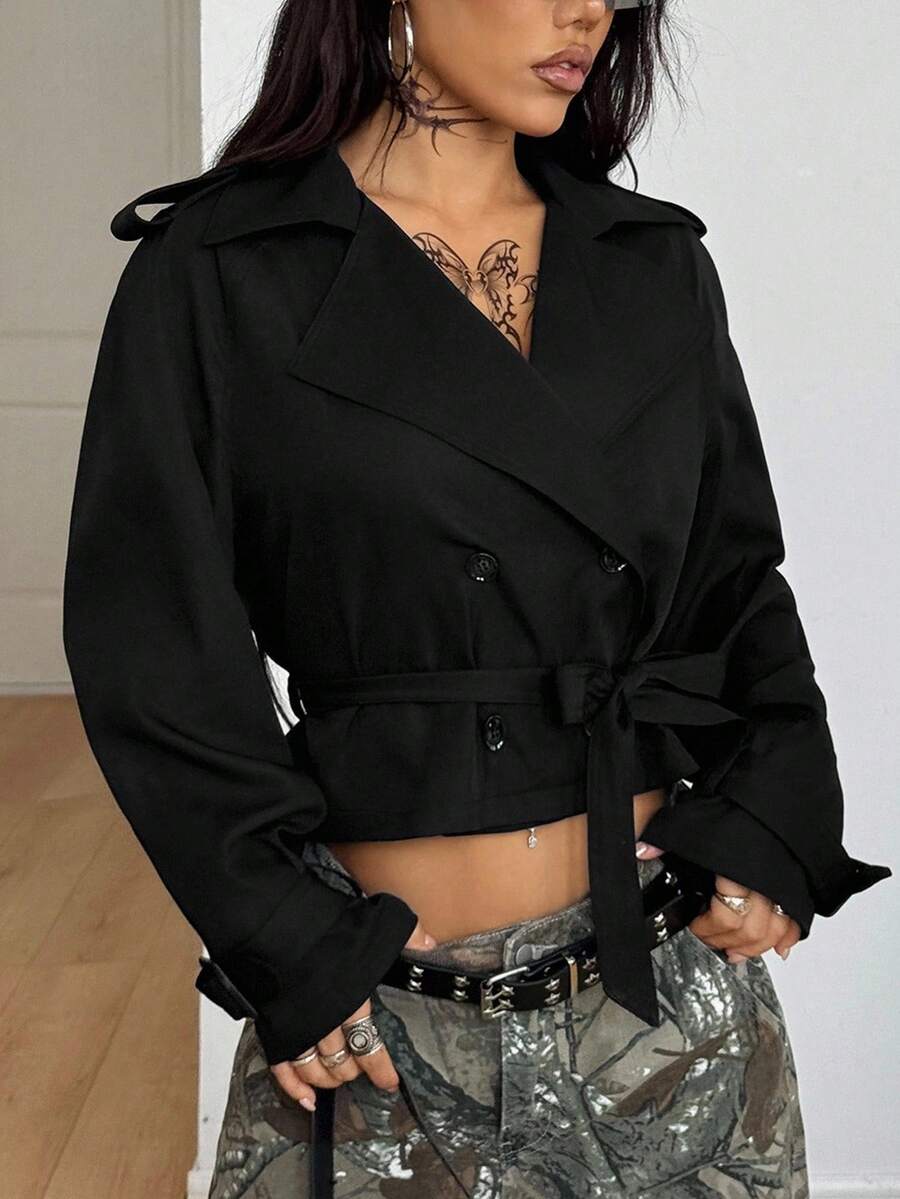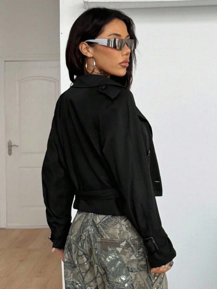 Abrigo de trinchera negro holgado, comodo, de uso diario, de estilo casual y deportivo para mujer, adecuado para otono/invierno