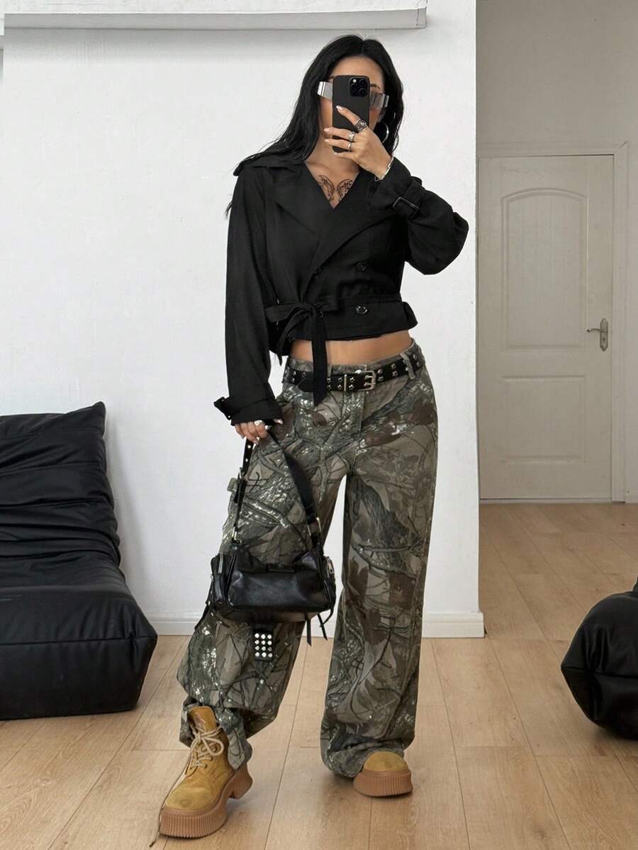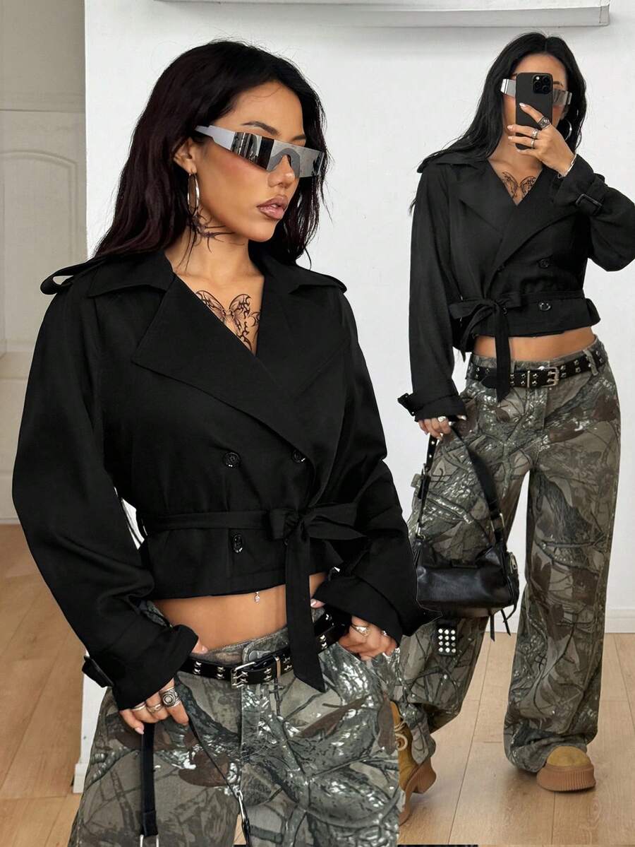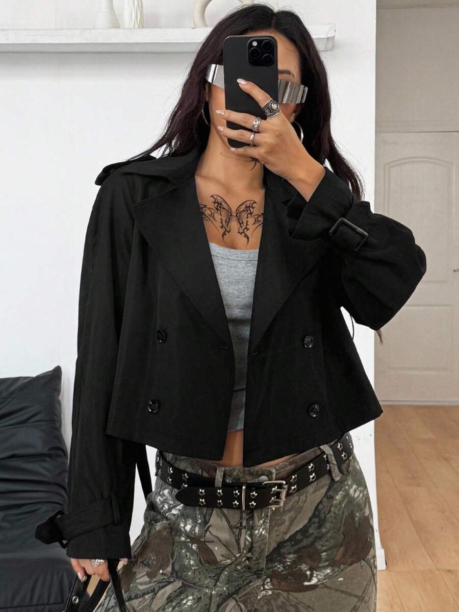 Abrigo de trinchera negro holgado, comodo, de uso diario, de estilo casual y deportivo para mujer, adecuado para otono/invierno