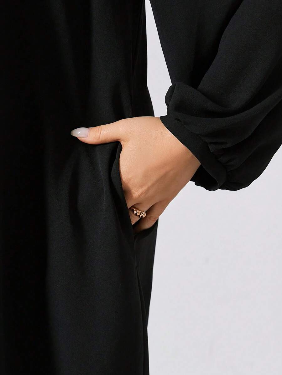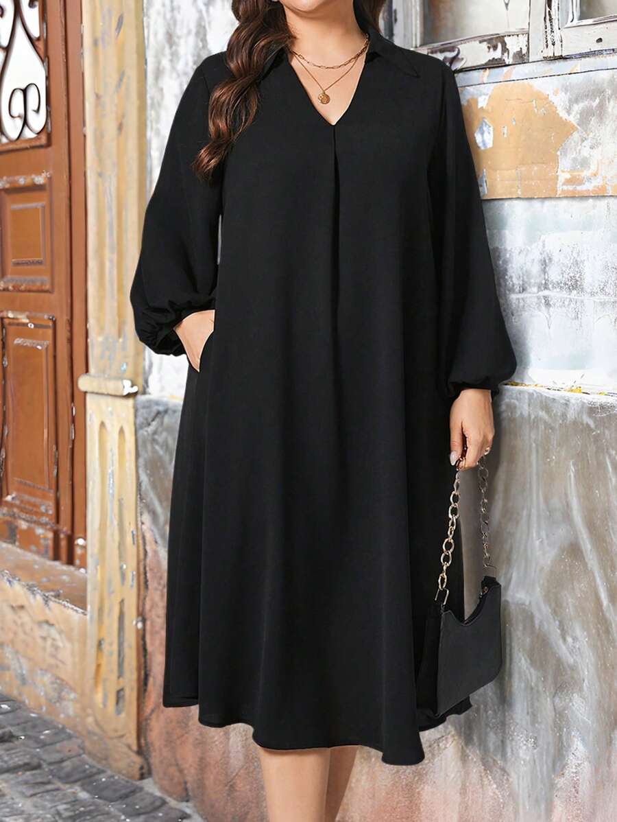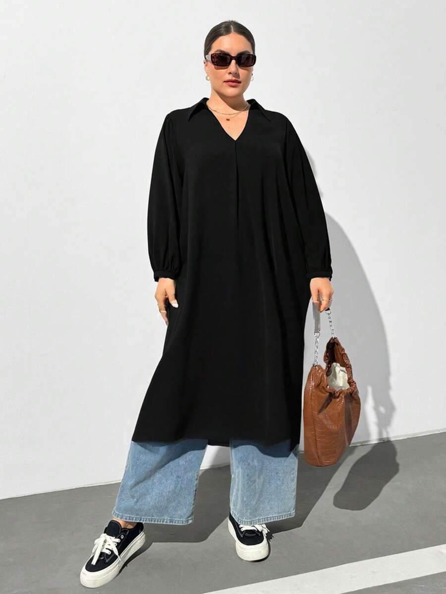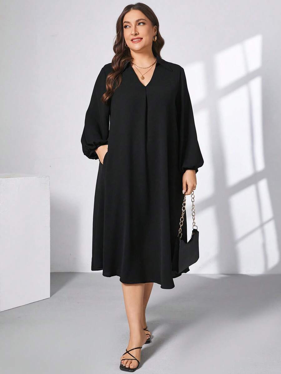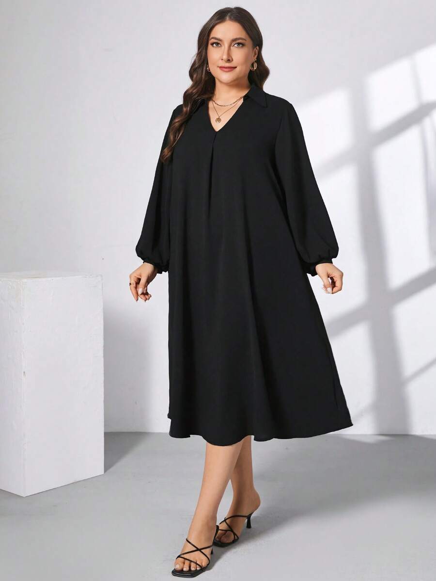 Vestido largo de manga larga con cuello en v negro, comodo y holgado, de estilo conservador y modesto, ideal para la iglesia y el estilo "old money", para mujeres de talla grande en primavera y verano