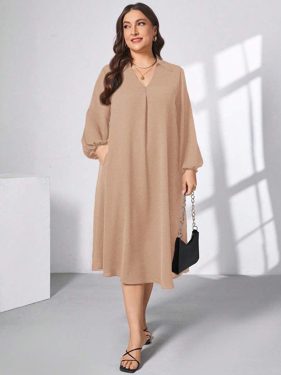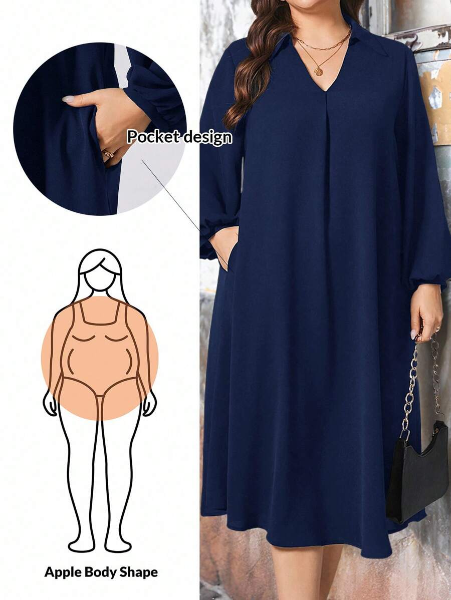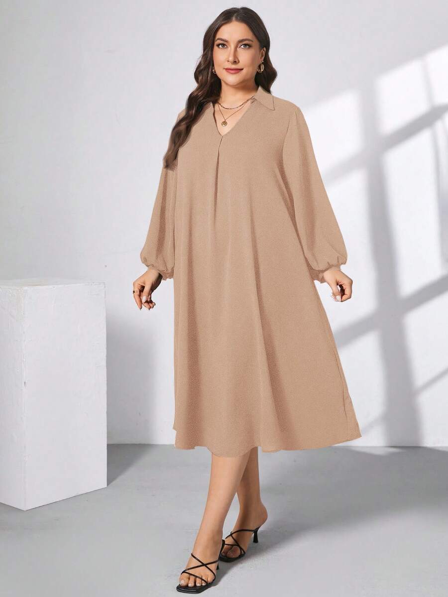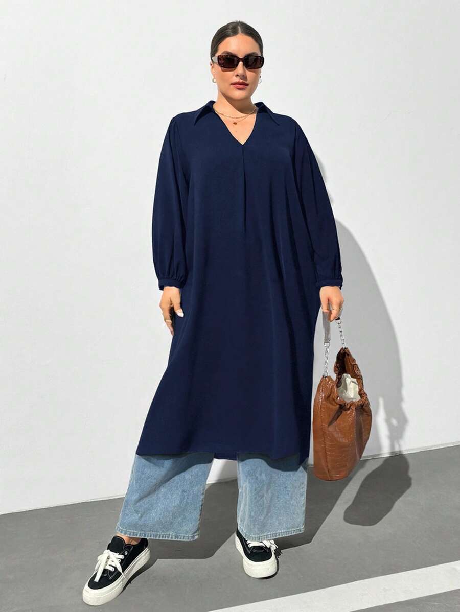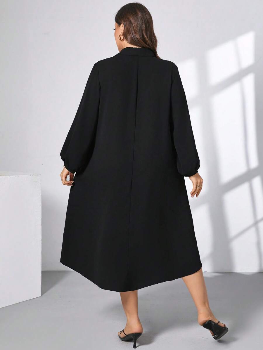Vestido largo de manga larga con cuello en v negro, comodo y holgado, de estilo conservador y modesto, ideal para la iglesia y el estilo "old money", para mujeres de talla grande en primavera y verano