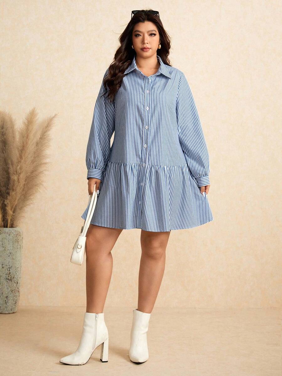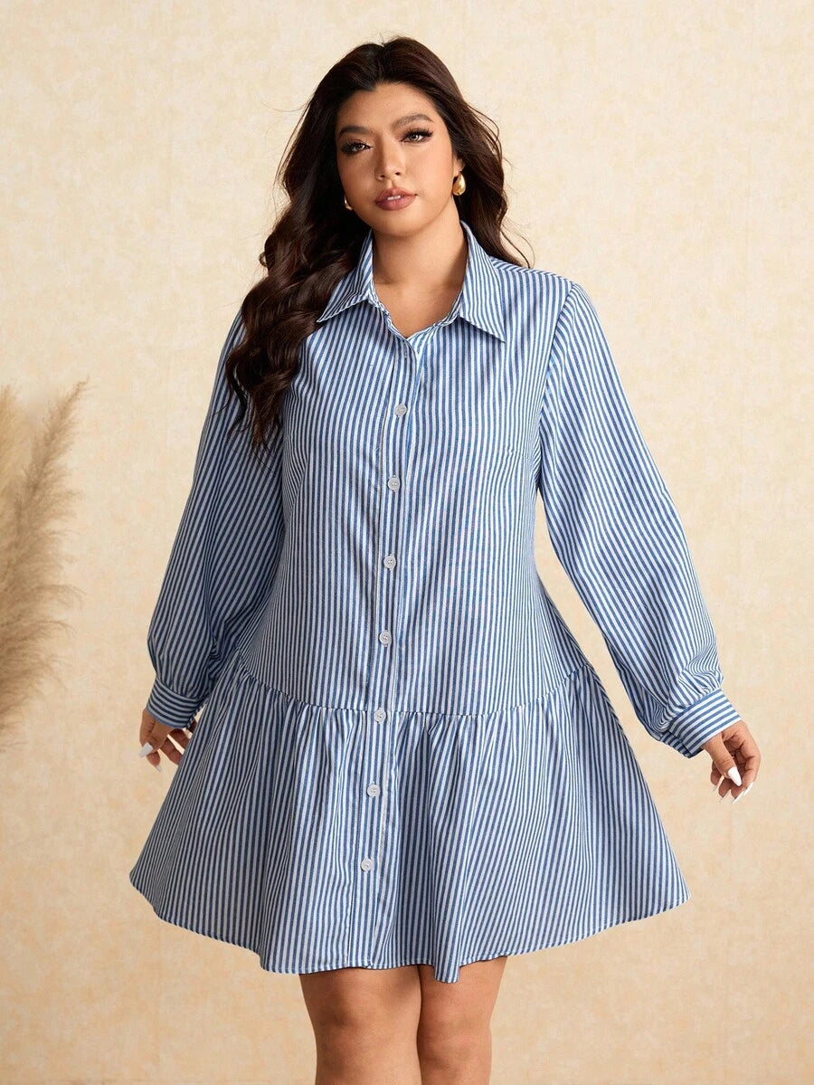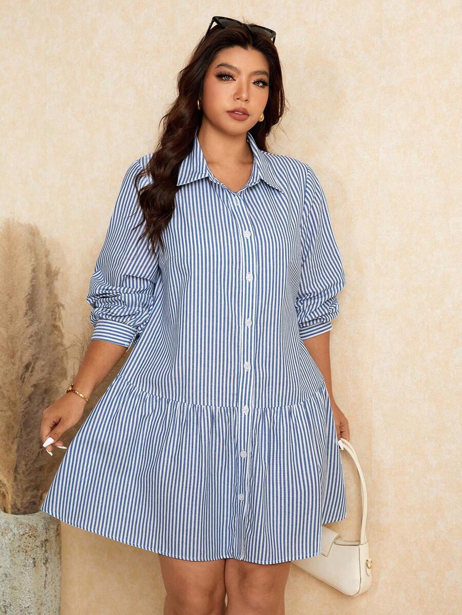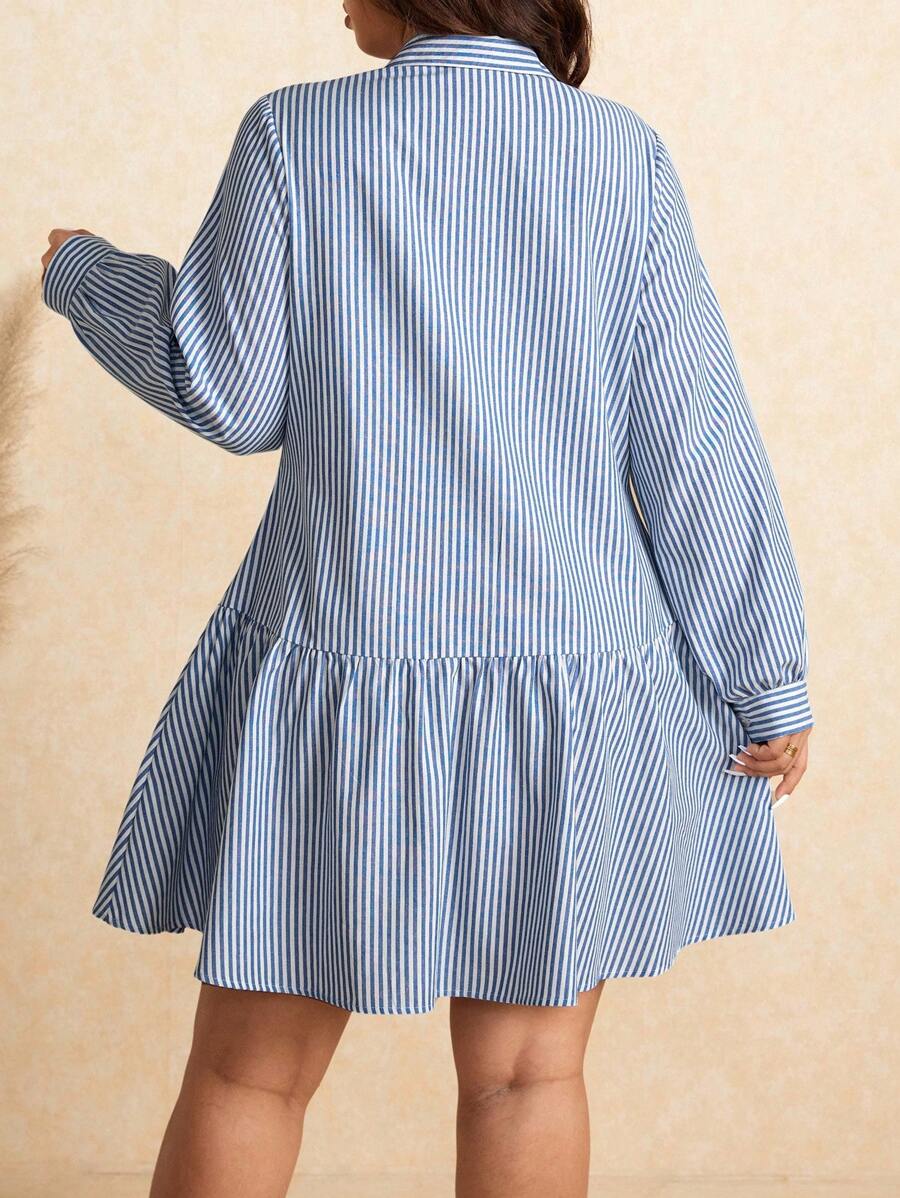Nubod vestido camisa deportivo y casual con cintura cenida y efecto estilizante, de manga larga y a rayas, talla grande. minifalda a rayas azules