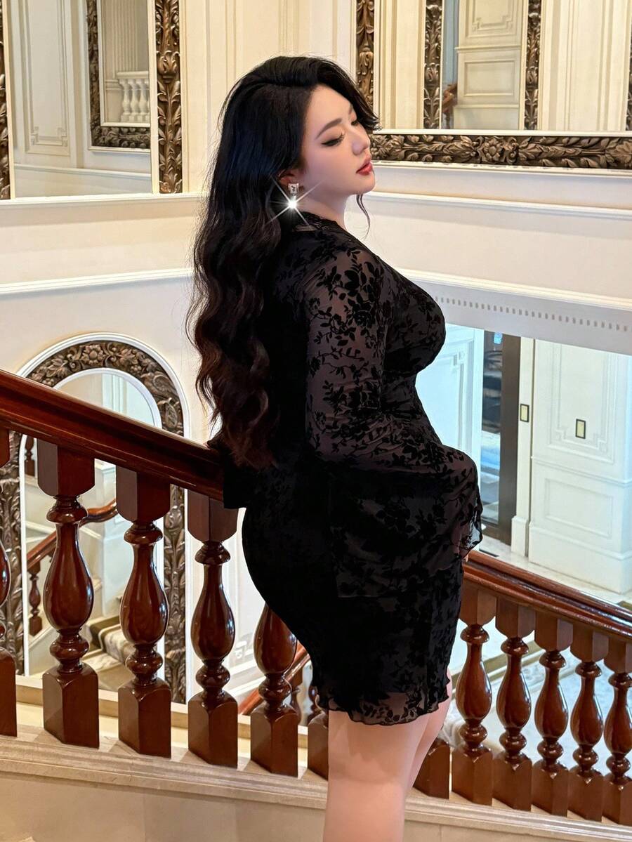 Vibekara vestido de coctel elegante, vintage y sexy de talla grande para mujer, con cuello en v profundo, encaje floral, parches, calado, mangas largas acampanadas, hasta la rodilla, transparente y ajustado, para fiestas y ocasiones casuales en color
