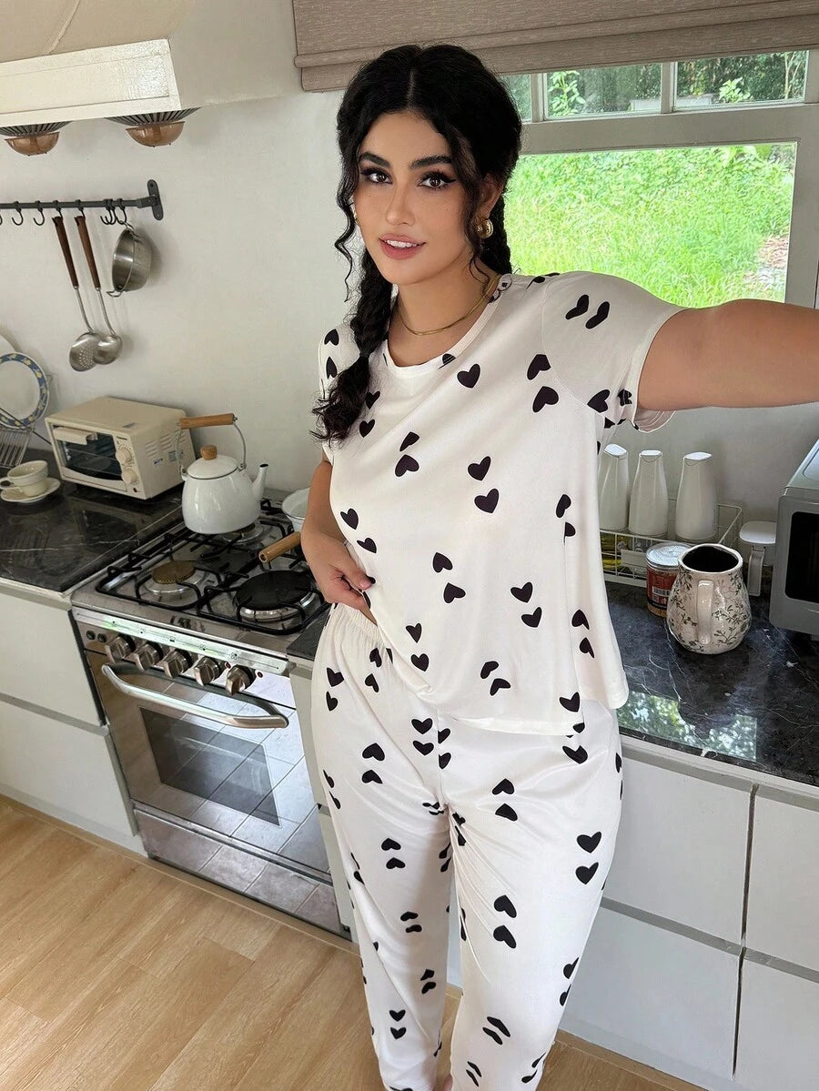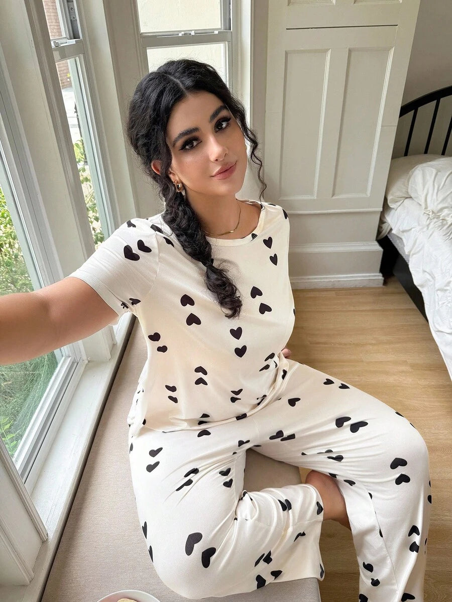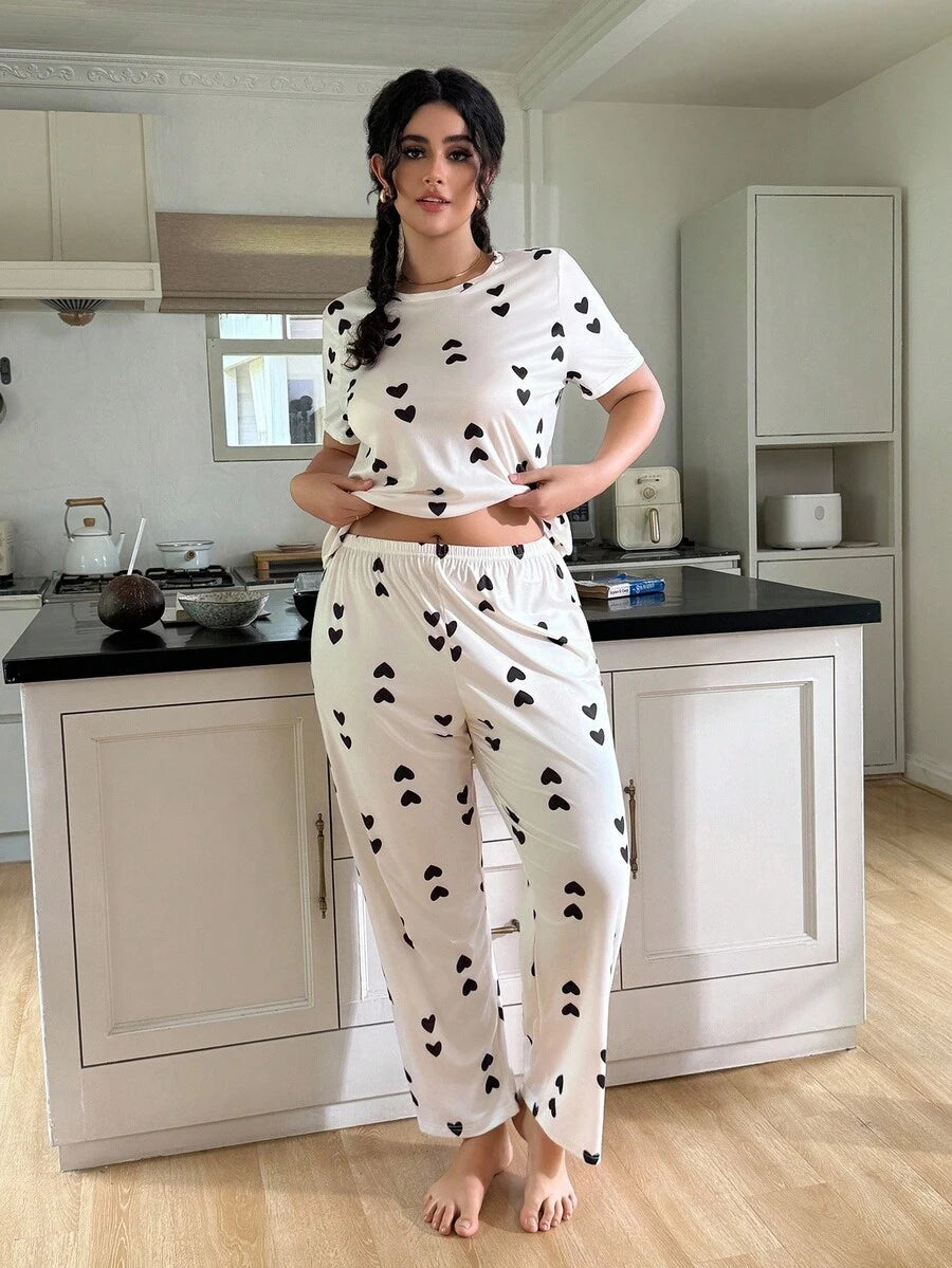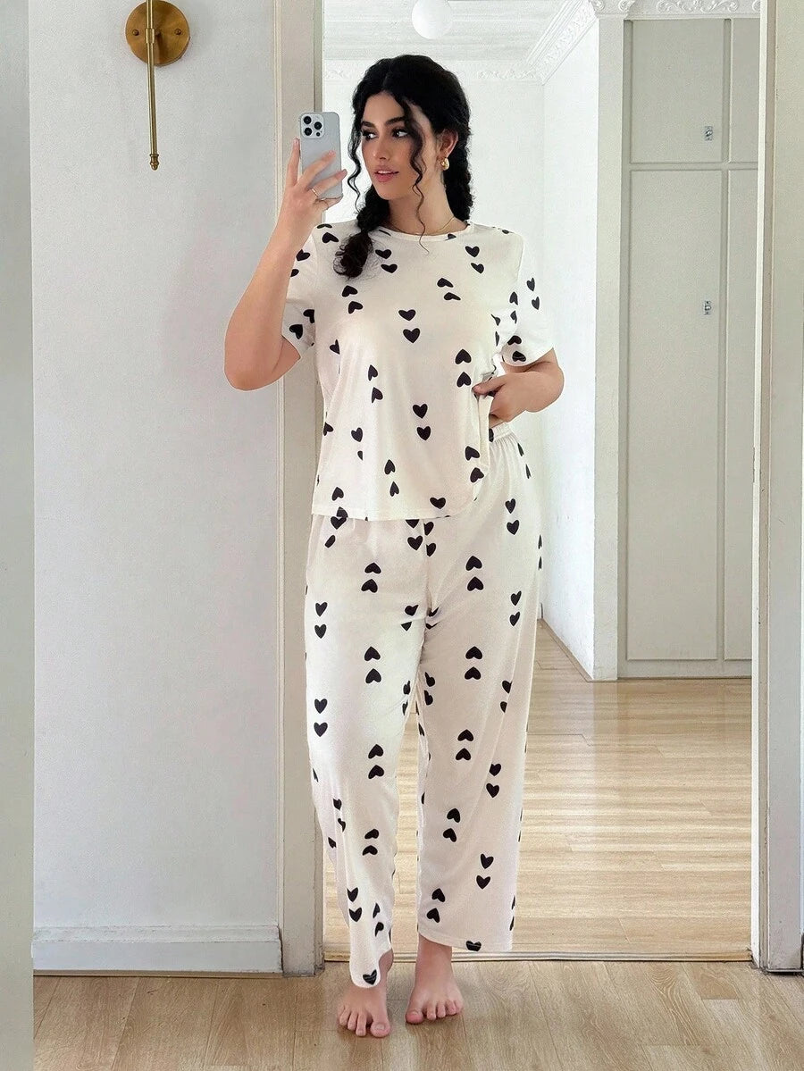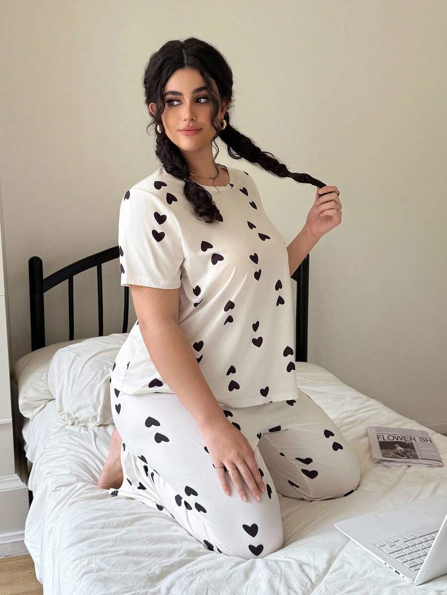Zzzcrew conjunto de pijama talla grande dream adore, estampado de corazones de punto casual de cuello redondo y manga corta con pantalon largo