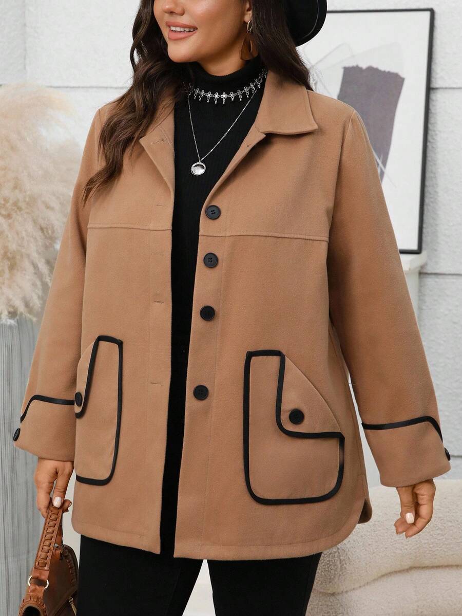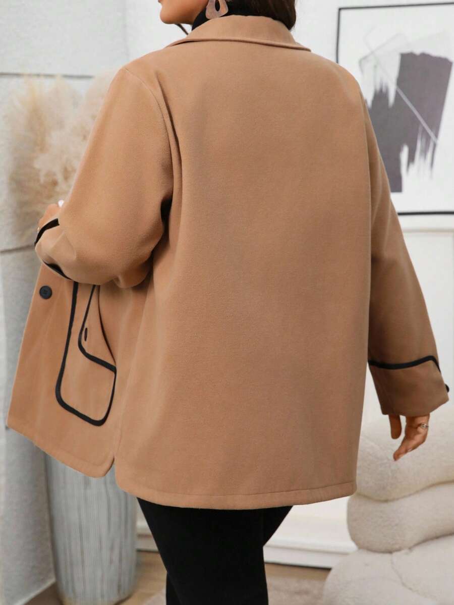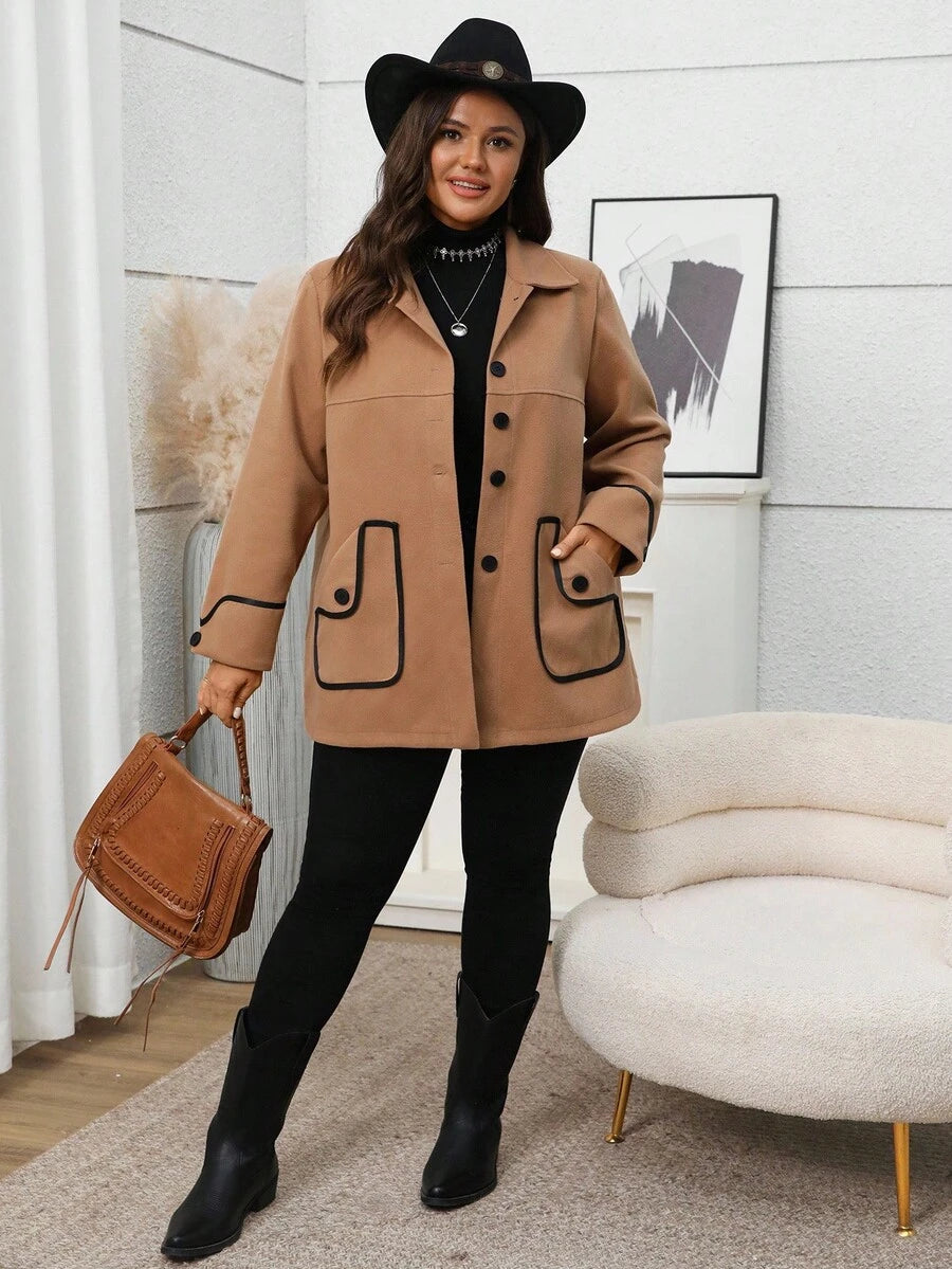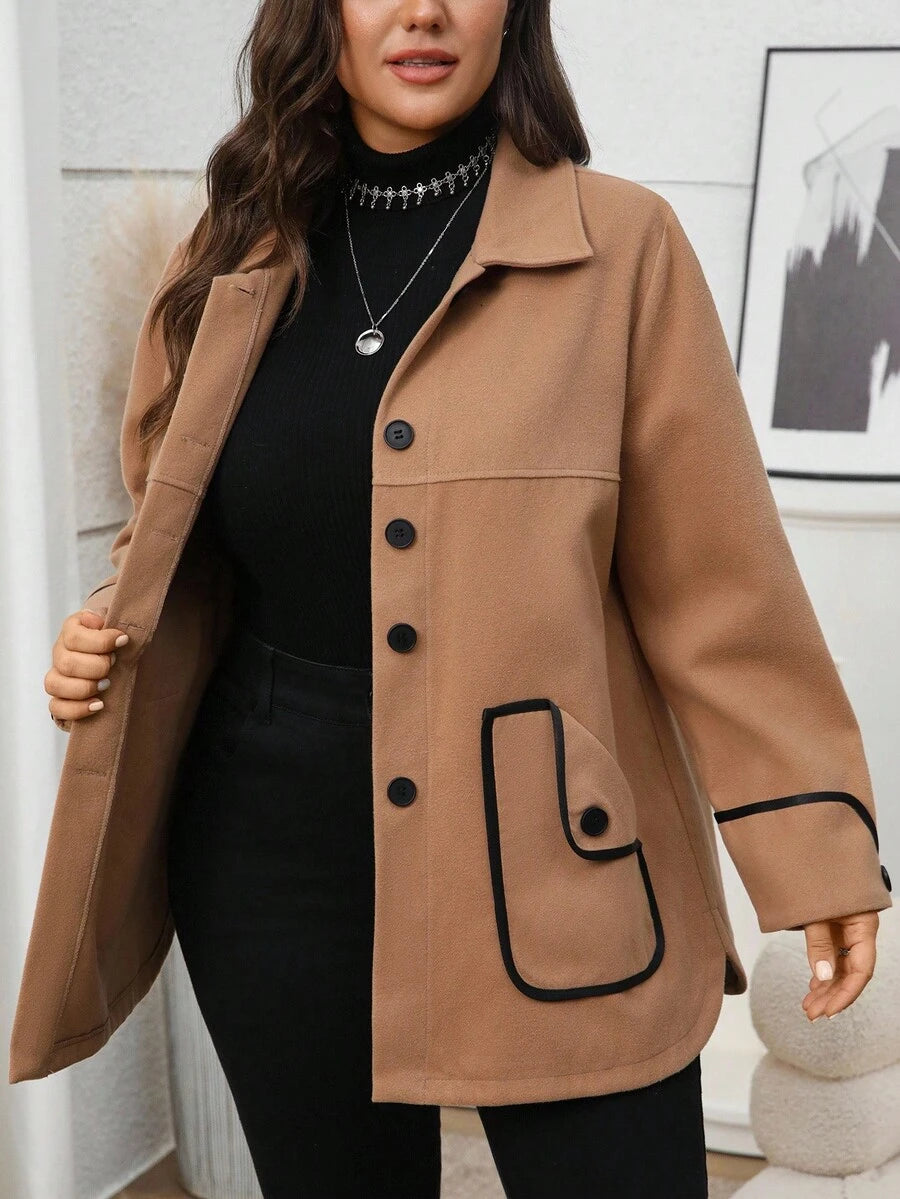 Abrigo de lana con mezcla de camel y ribete de contraste para mujer de talla grande, otono/invierno