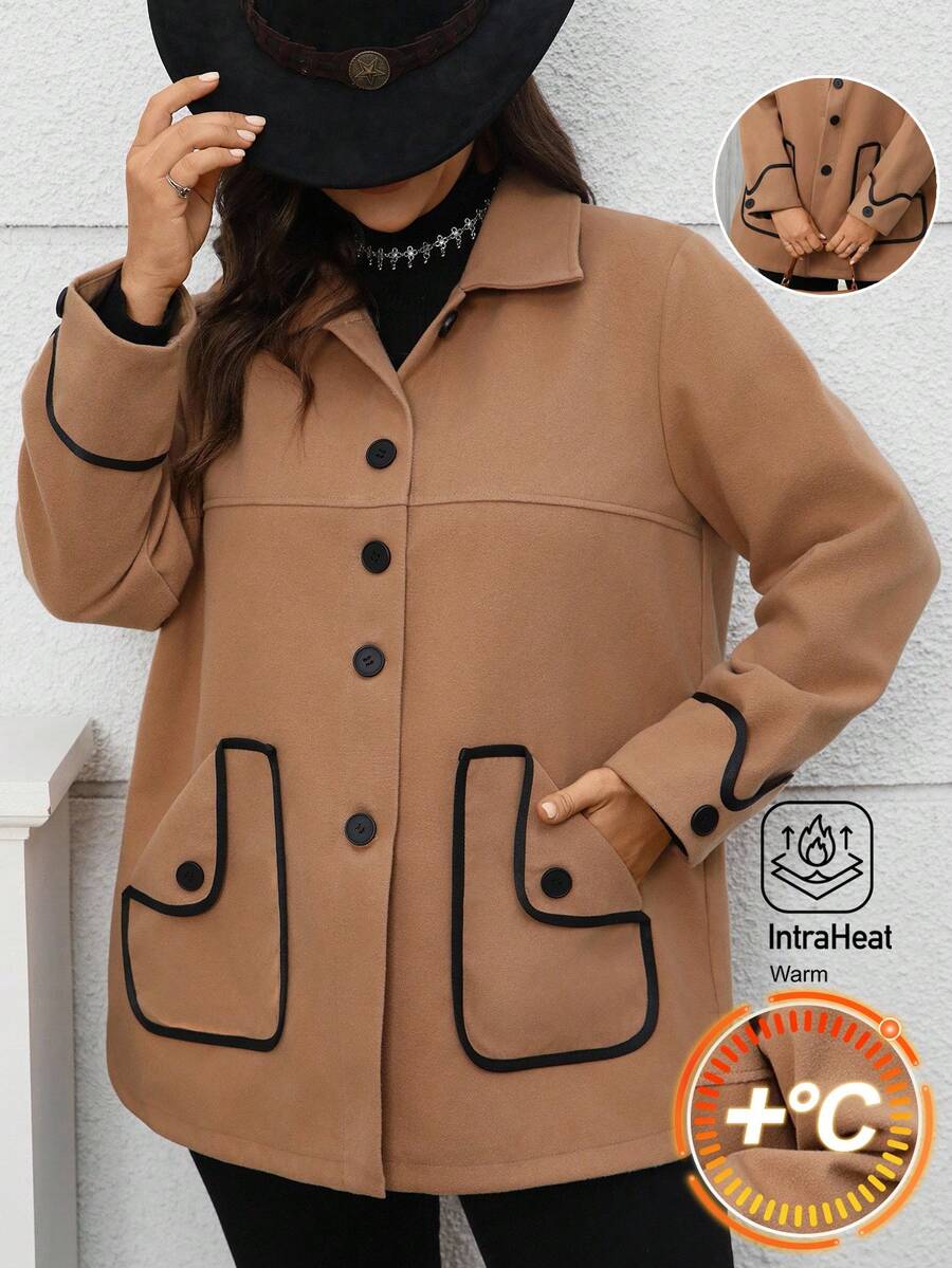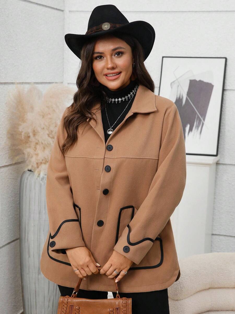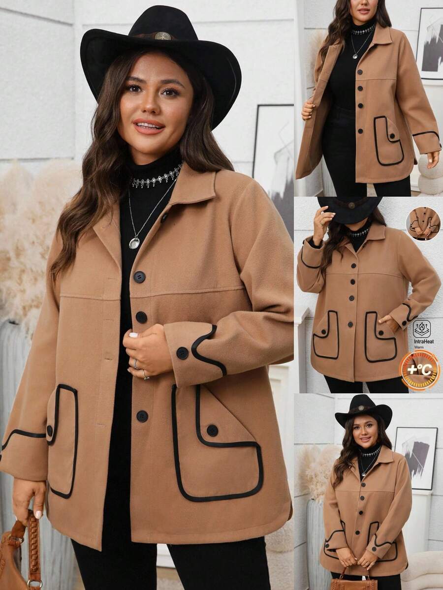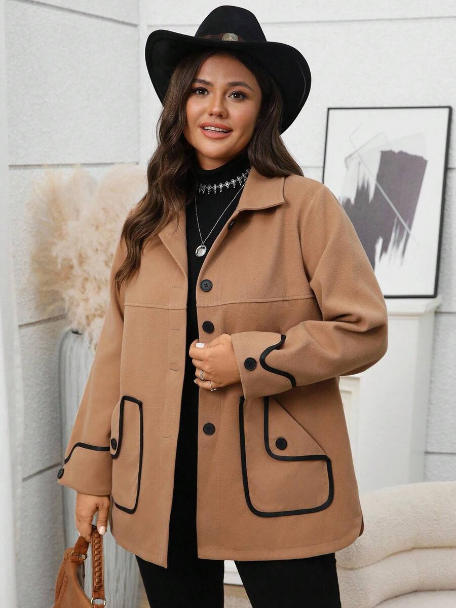 Abrigo de lana con mezcla de camel y ribete de contraste para mujer de talla grande, otono/invierno