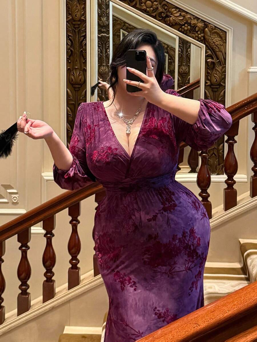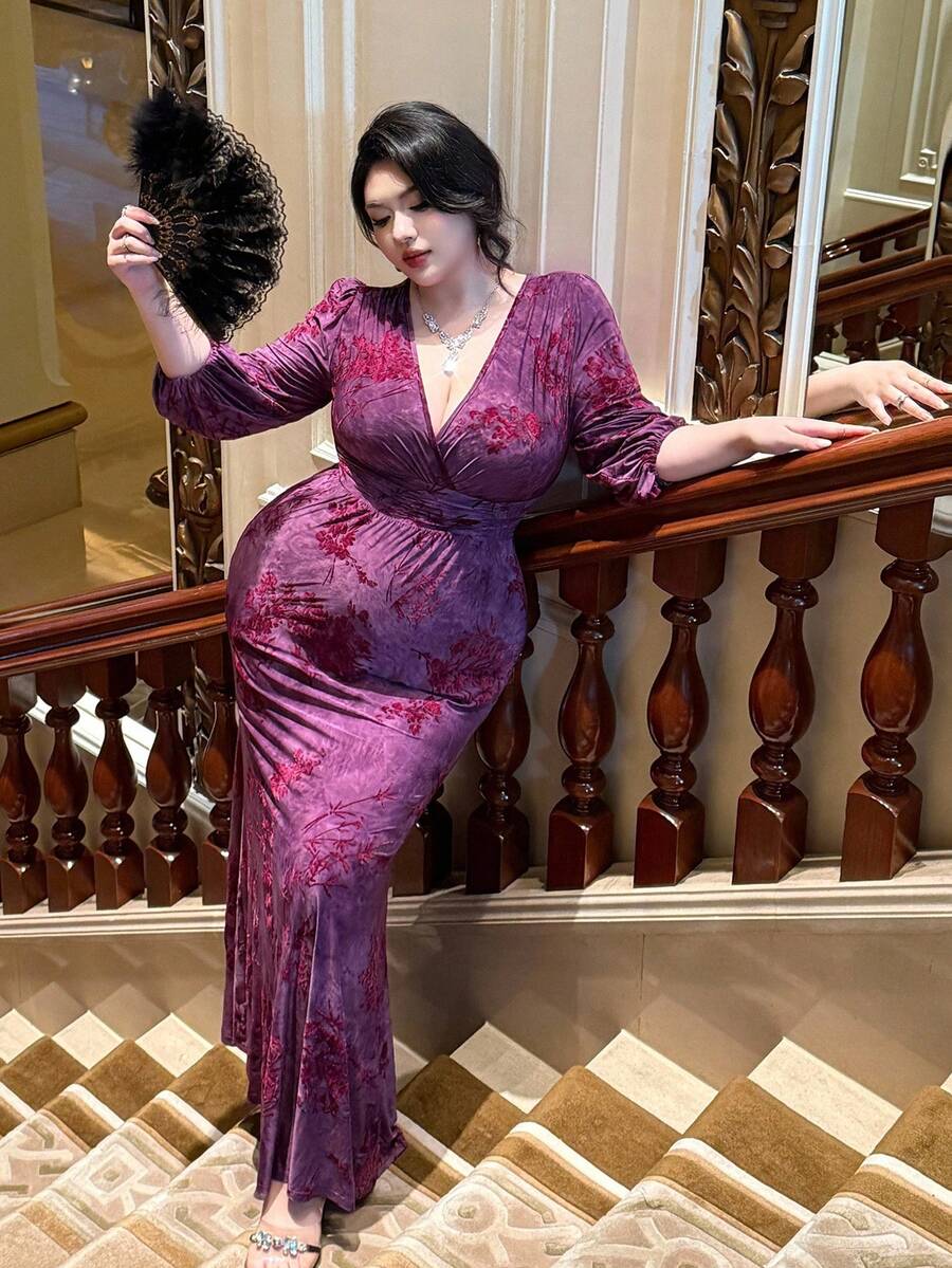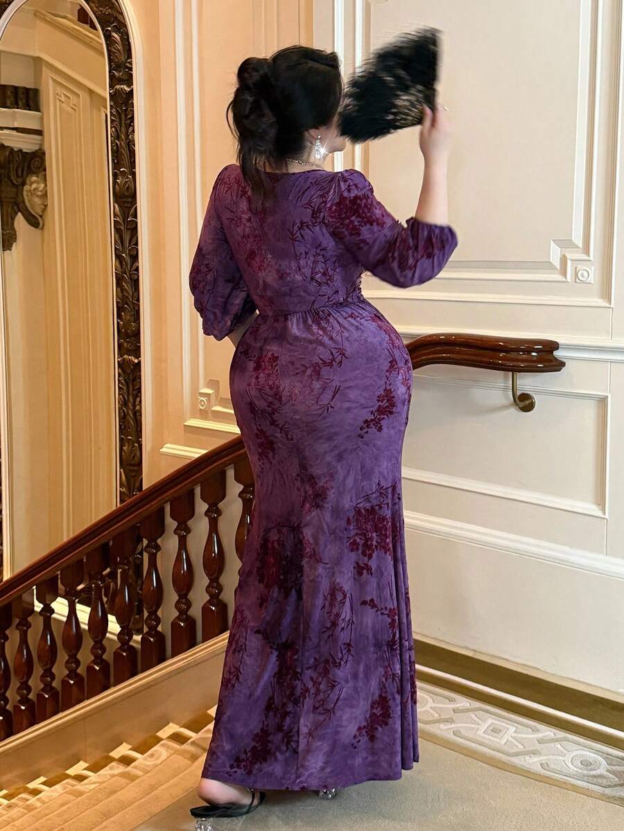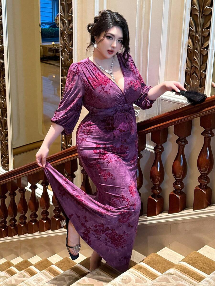 Vibekara vestido de fiesta y vacaciones de estilo vintage elegante para mujer talla grande, de terciopelo con efecto quemado, cuello en v y silueta ajustada, color morado