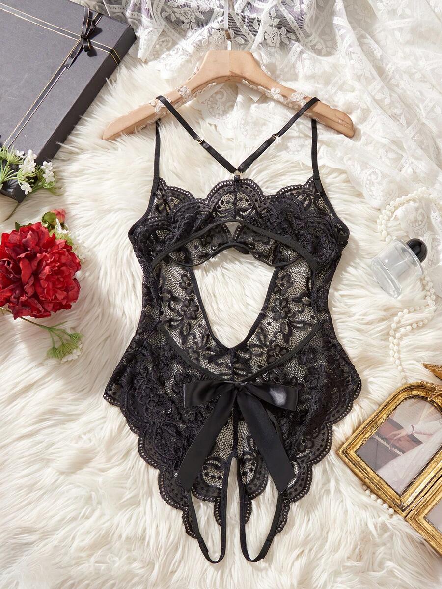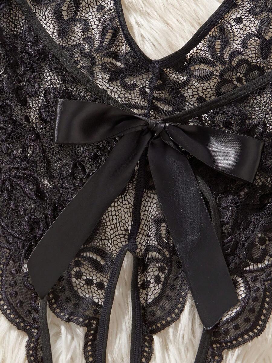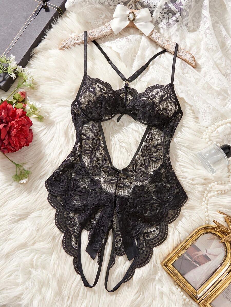 1 pieza body de encaje negro sexy con abertura en la entrepierna para mujer, body transparente sin espalda con mono, adecuado para usar en casa o en fiestas privadas, lenceria sexy