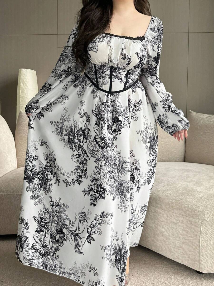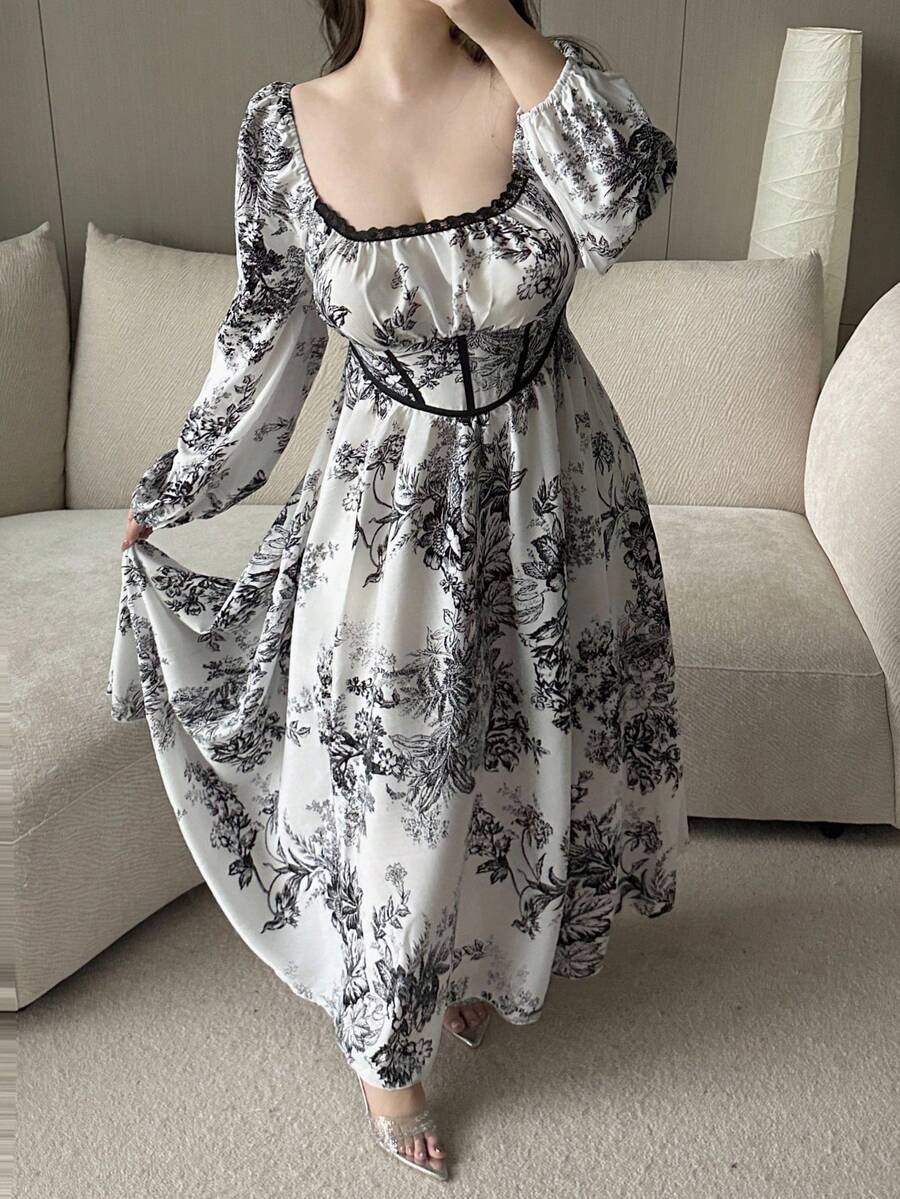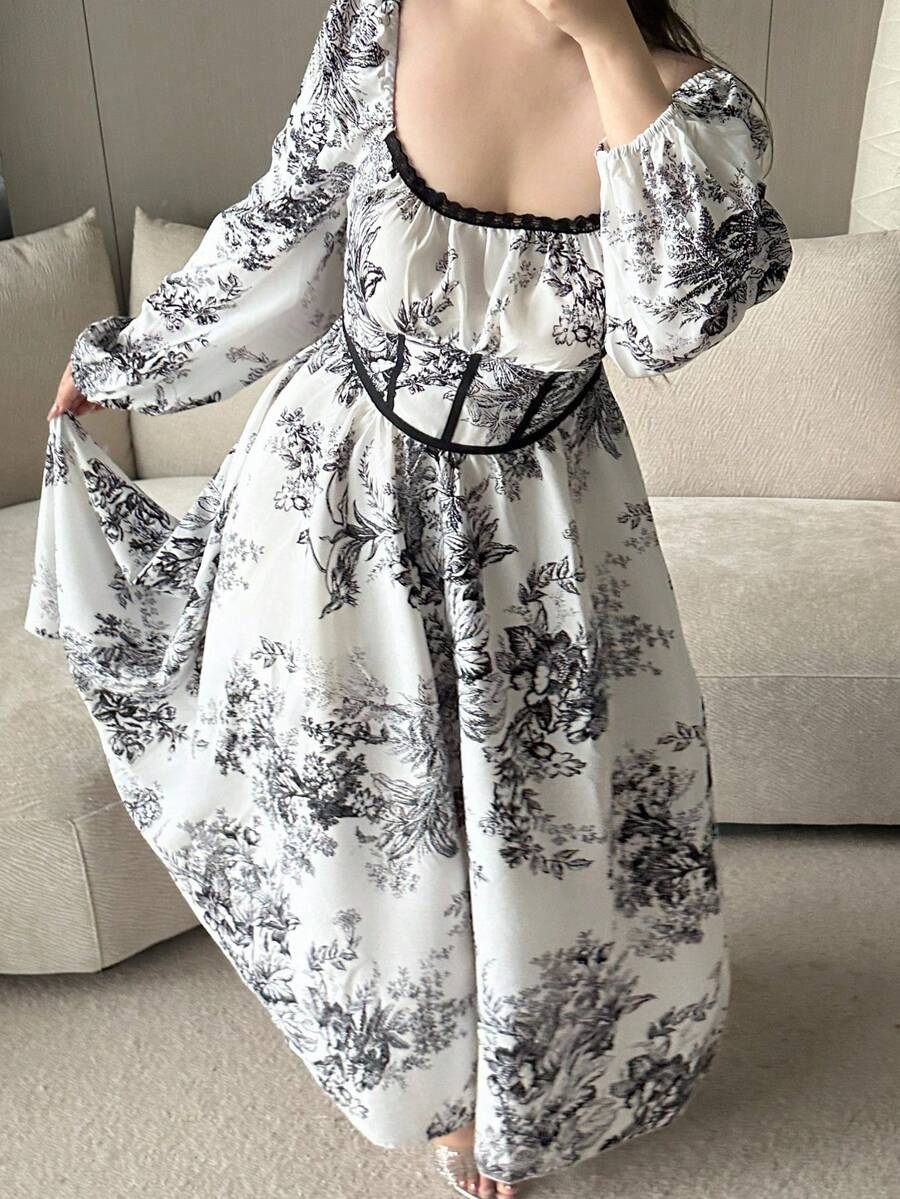 Vibekara vestido midi de manga abullonada con cuello cuadrado, estampado de flores, corazones, lunares, labios y cupido en estilo de pintura francesa de tinta 3d, con cintura ajustada y falda acampanada en linea a, con una hermosa cintura simulada de