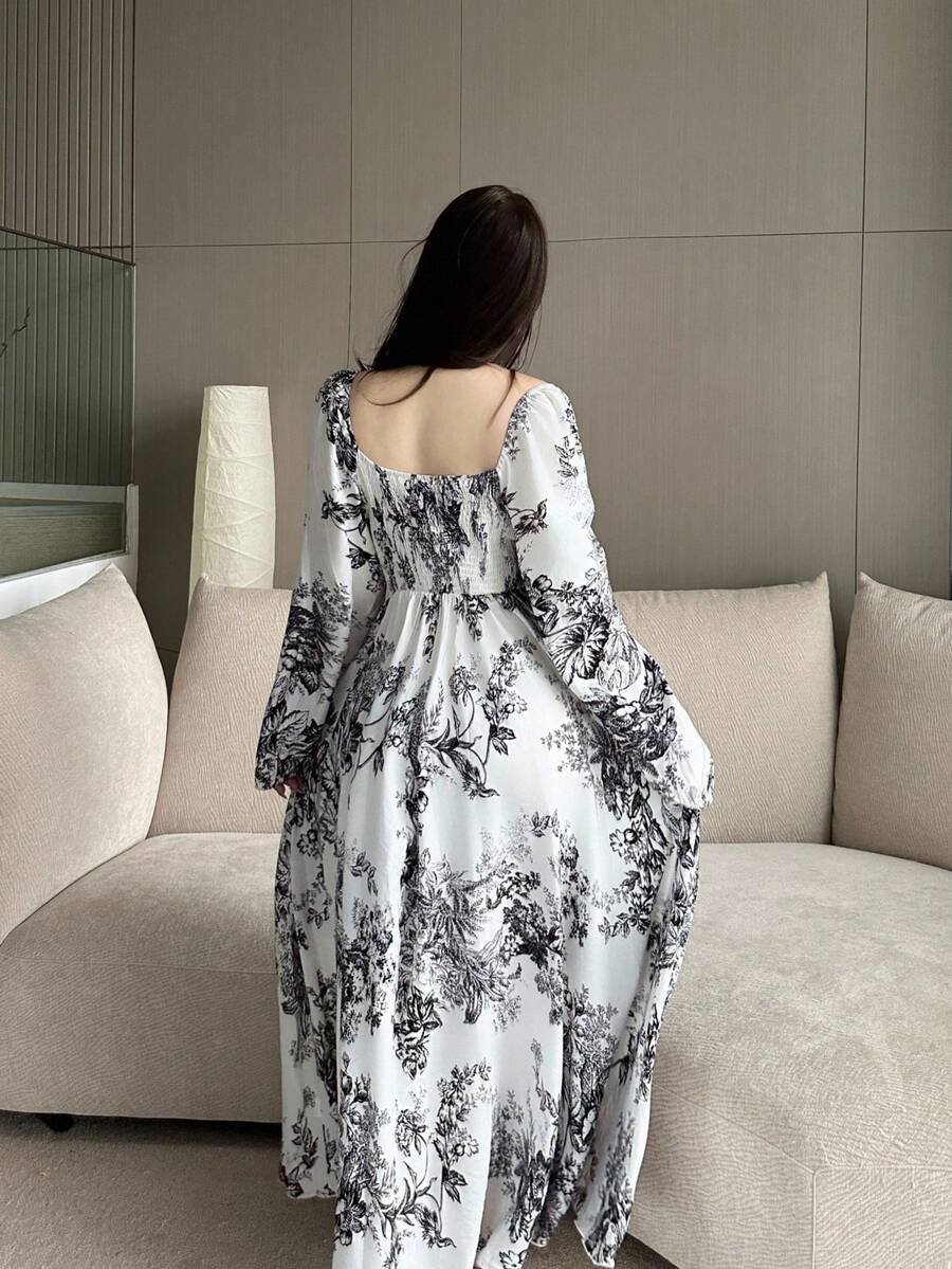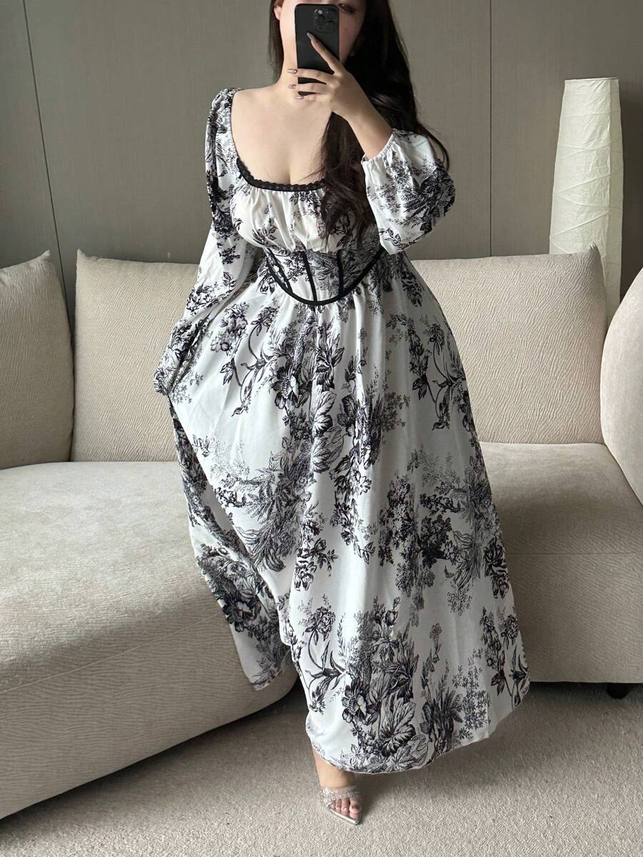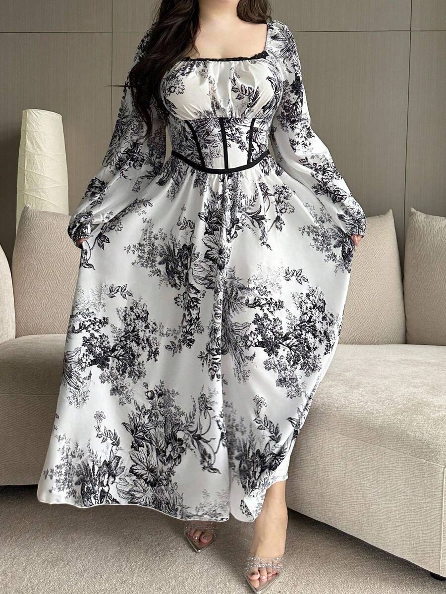 Vibekara vestido midi de manga abullonada con cuello cuadrado, estampado de flores, corazones, lunares, labios y cupido en estilo de pintura francesa de tinta 3d, con cintura ajustada y falda acampanada en linea a, con una hermosa cintura simulada de