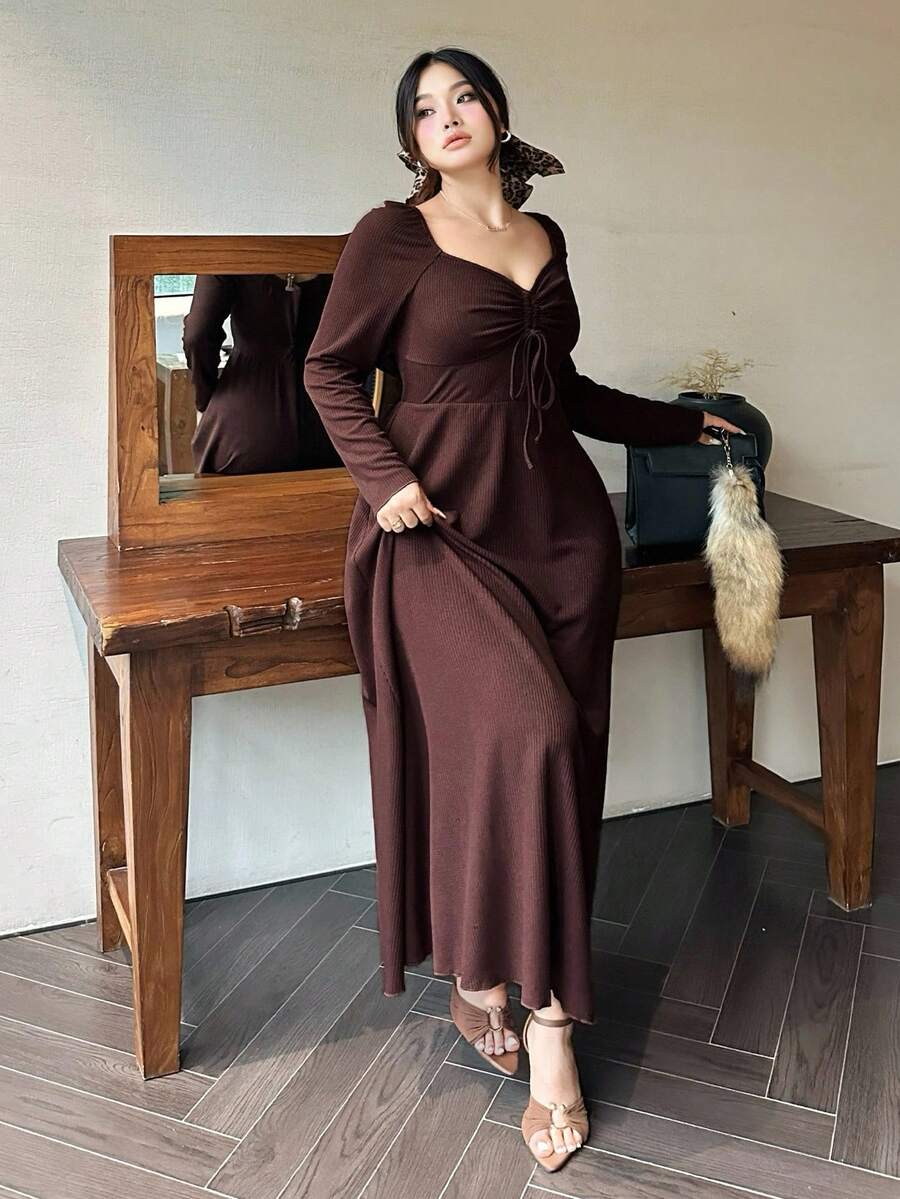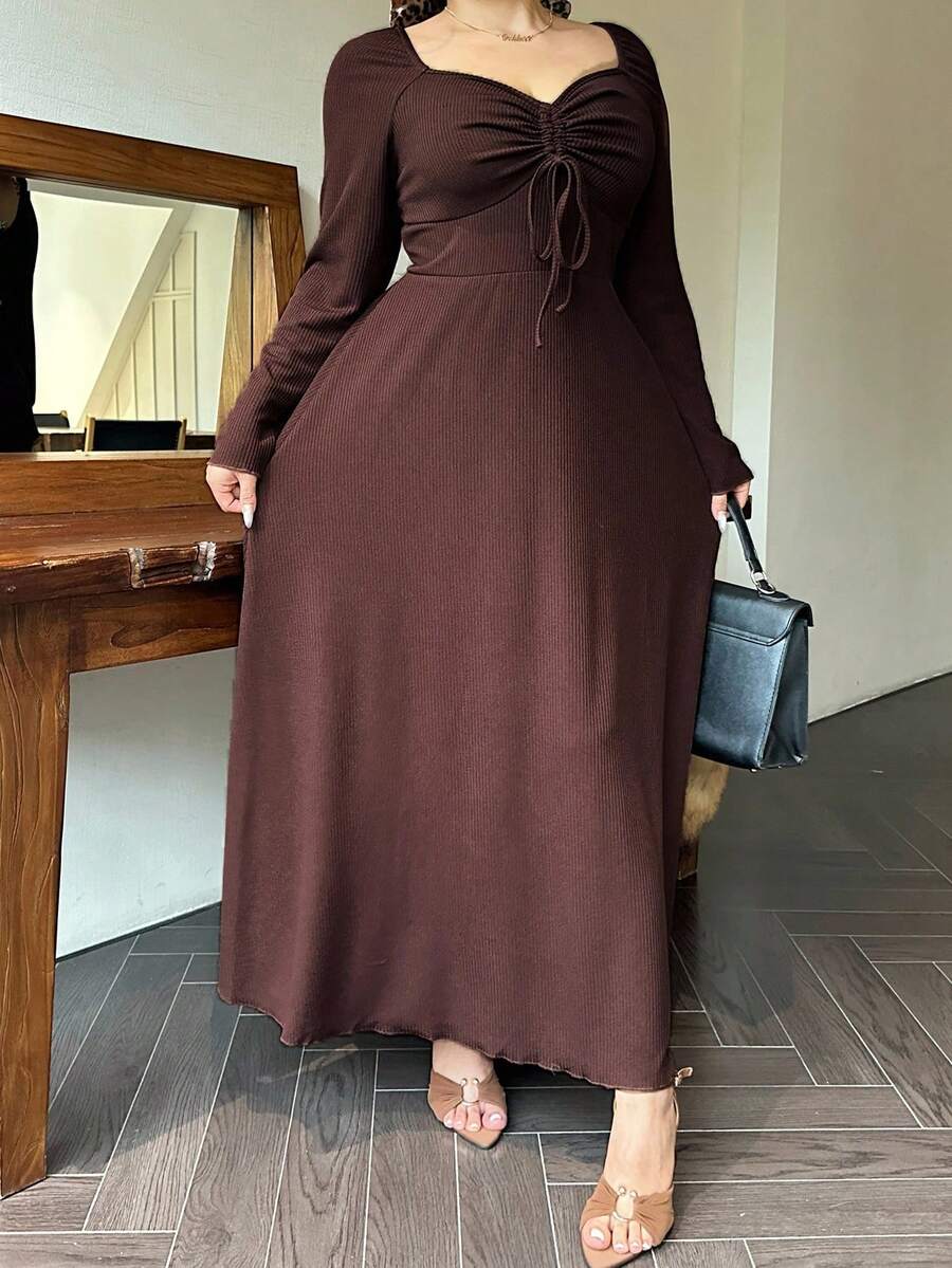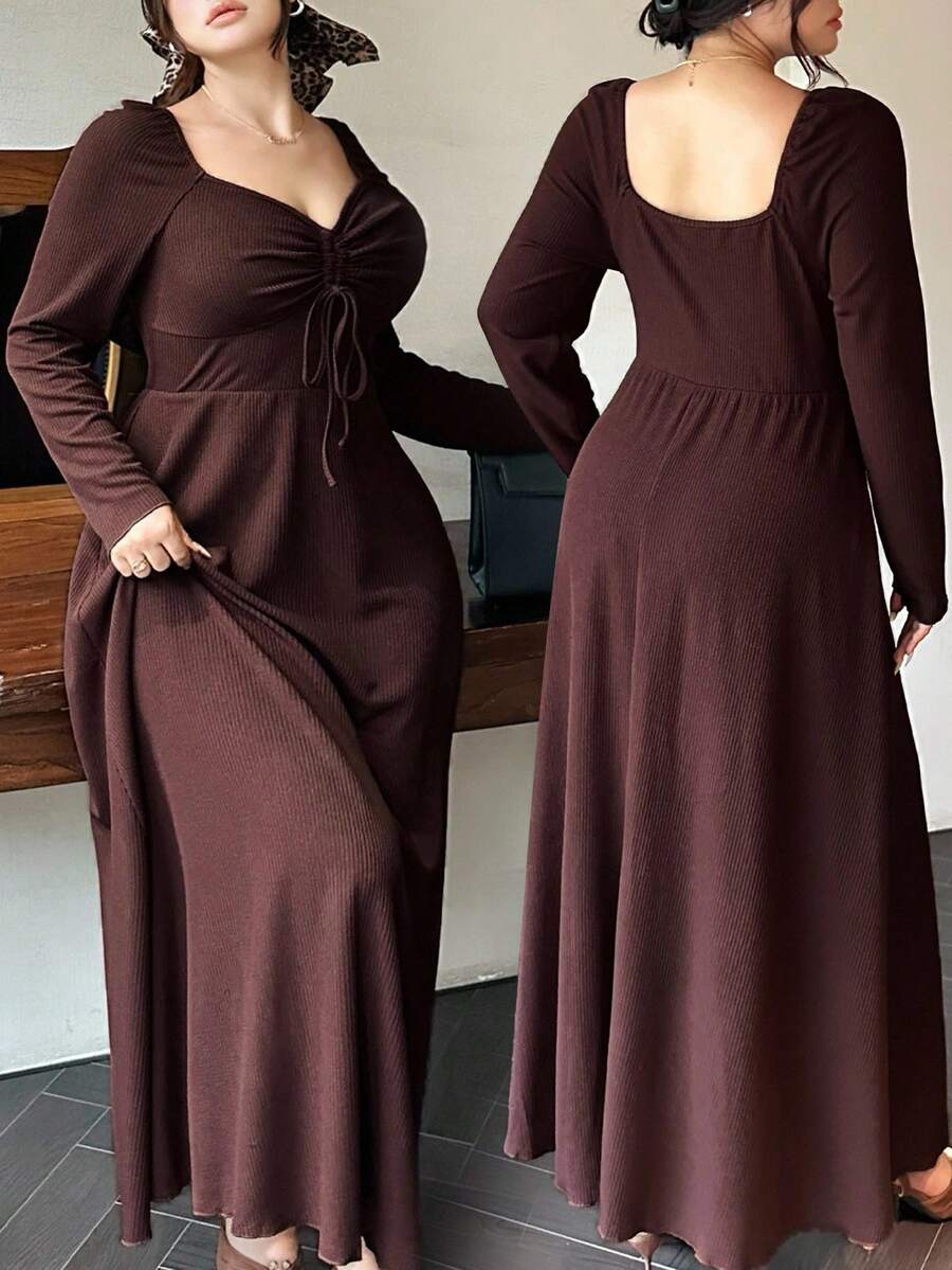 Vibekara vestido de manga larga con cuello de diamante, cordon frontal y costillas de talla grande