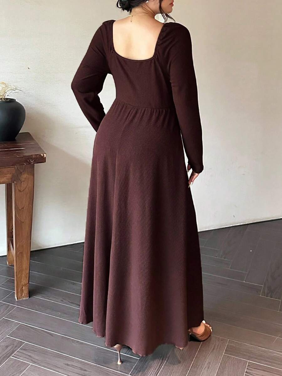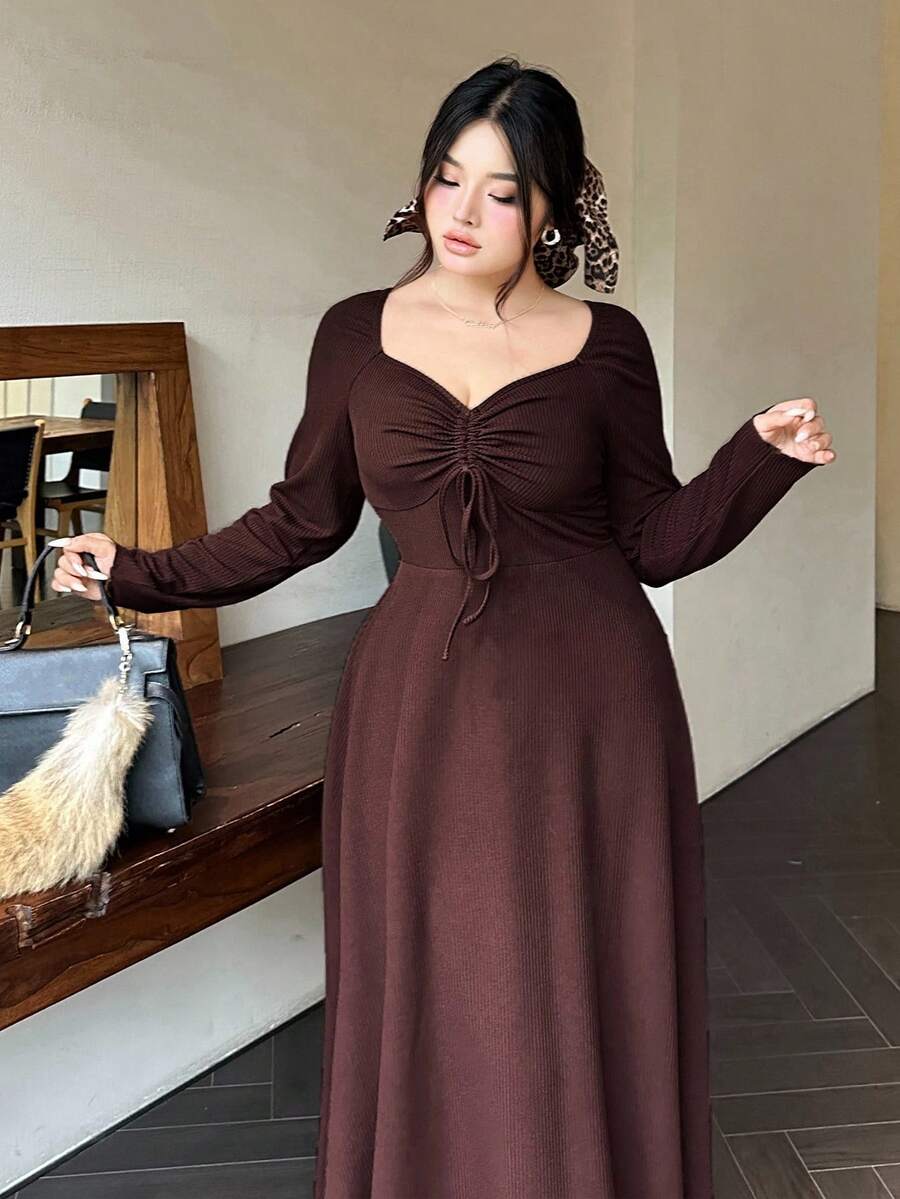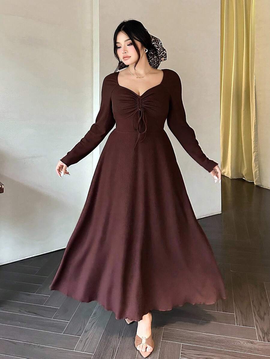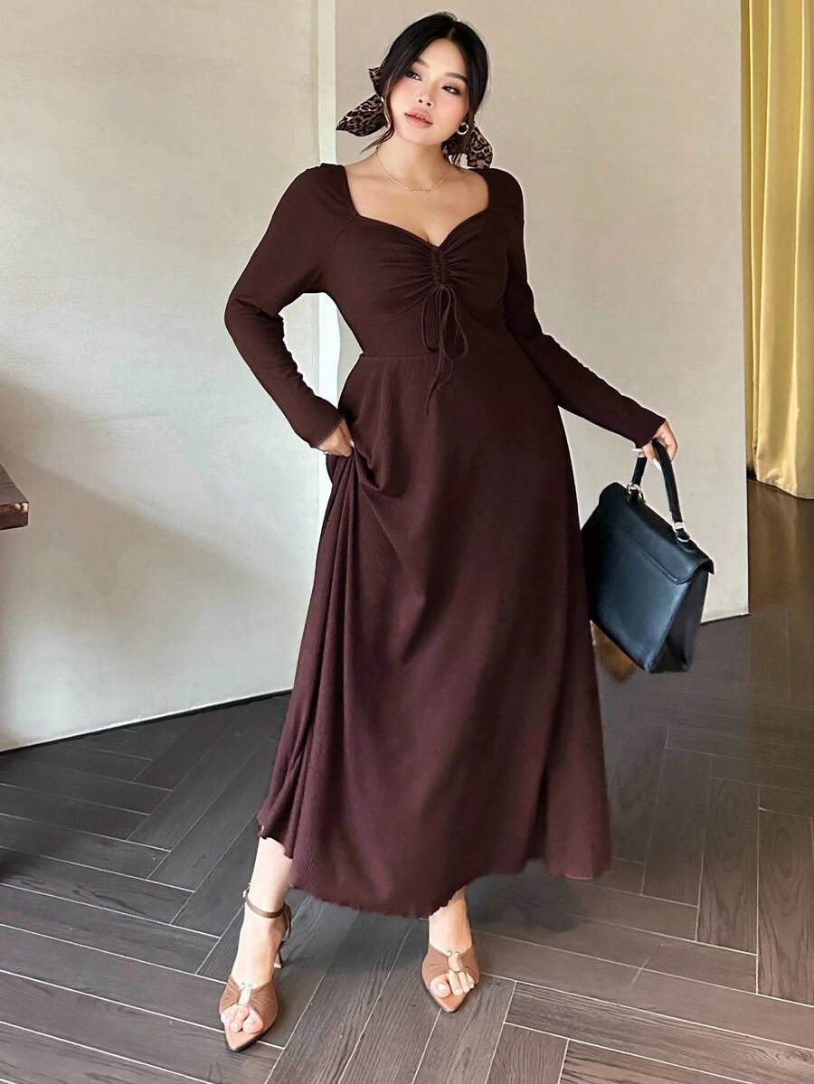 Vibekara vestido de manga larga con cuello de diamante, cordon frontal y costillas de talla grande