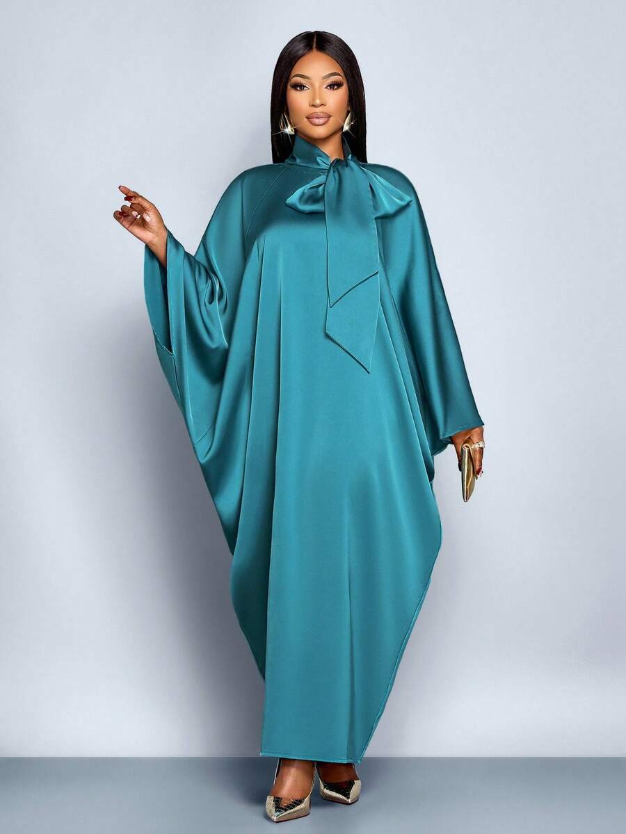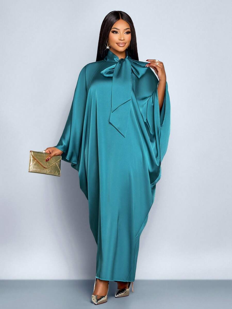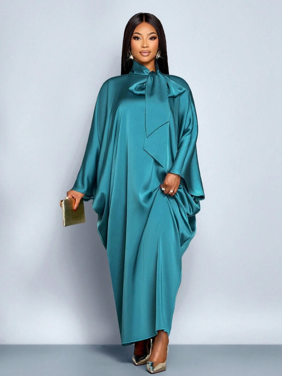 Vestido largo suelto de mujer de talla grande, elegante, de unicolor, con tela satinada brillante, de estilo murcielago, nuevos estilos para otono, invierno y primavera, con cuello medio tortuga y lazo, para fiesta, coctel, cena y moda