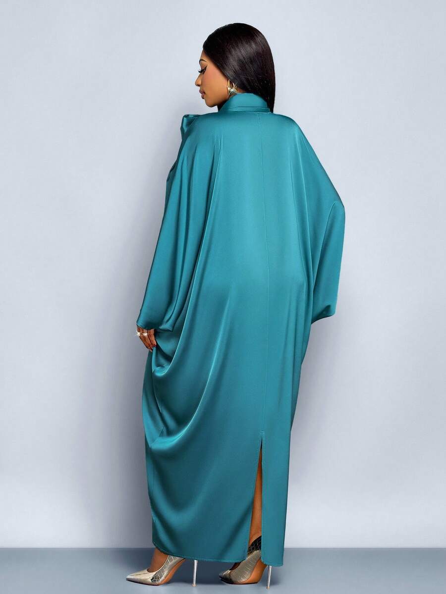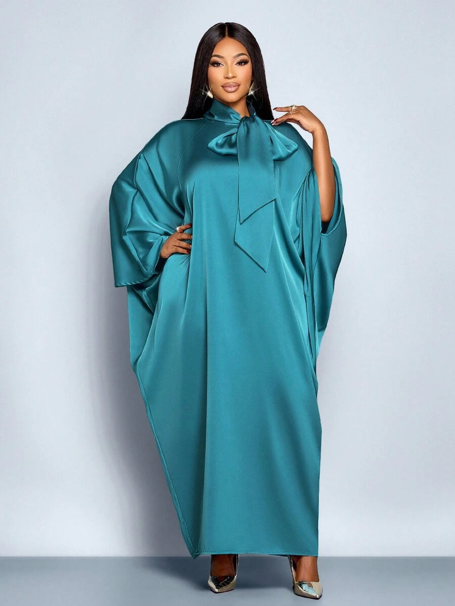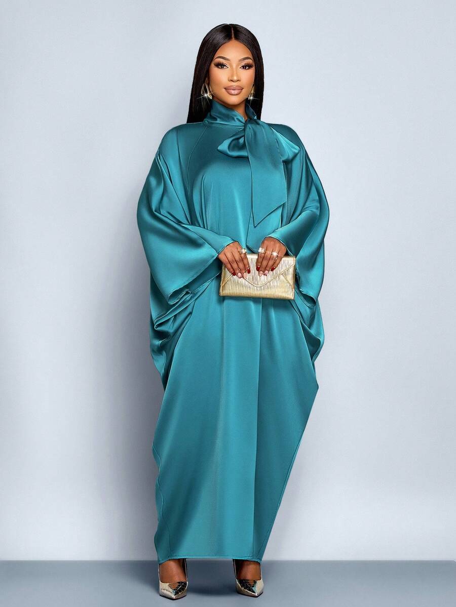 Vestido largo suelto de mujer de talla grande, elegante, de unicolor, con tela satinada brillante, de estilo murcielago, nuevos estilos para otono, invierno y primavera, con cuello medio tortuga y lazo, para fiesta, coctel, cena y moda