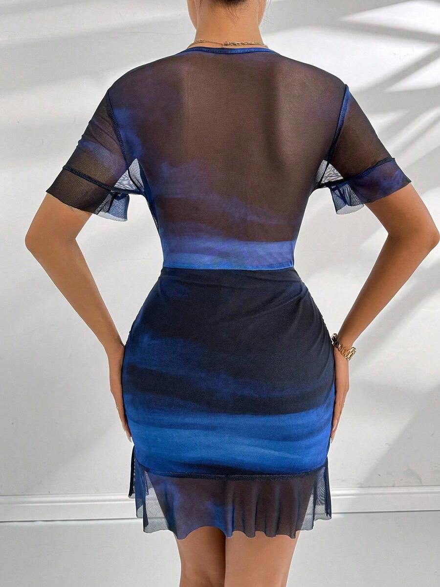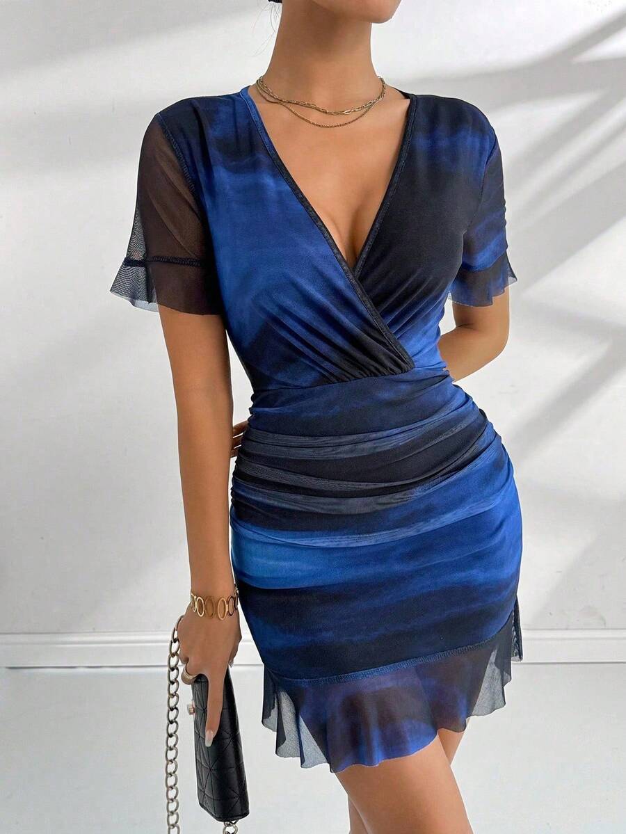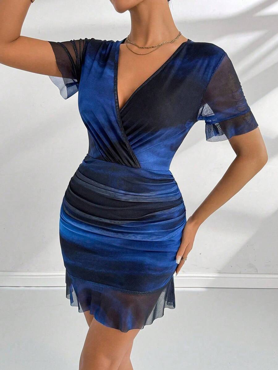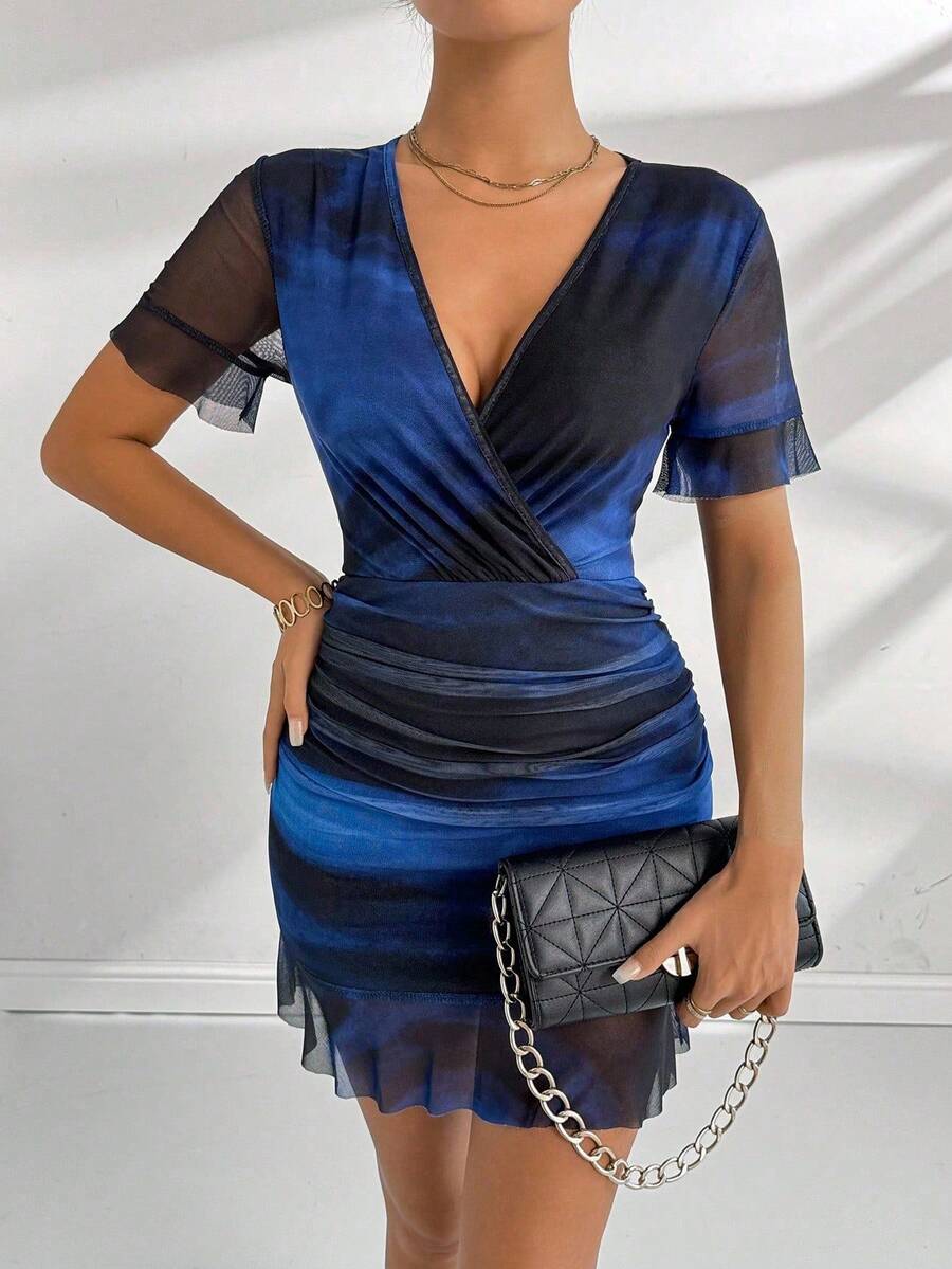 Zolique vestido corto de mujer con escote en v cruzado, manga corta y volantes, con estampado de tie-dye y patron floral aleatorio
