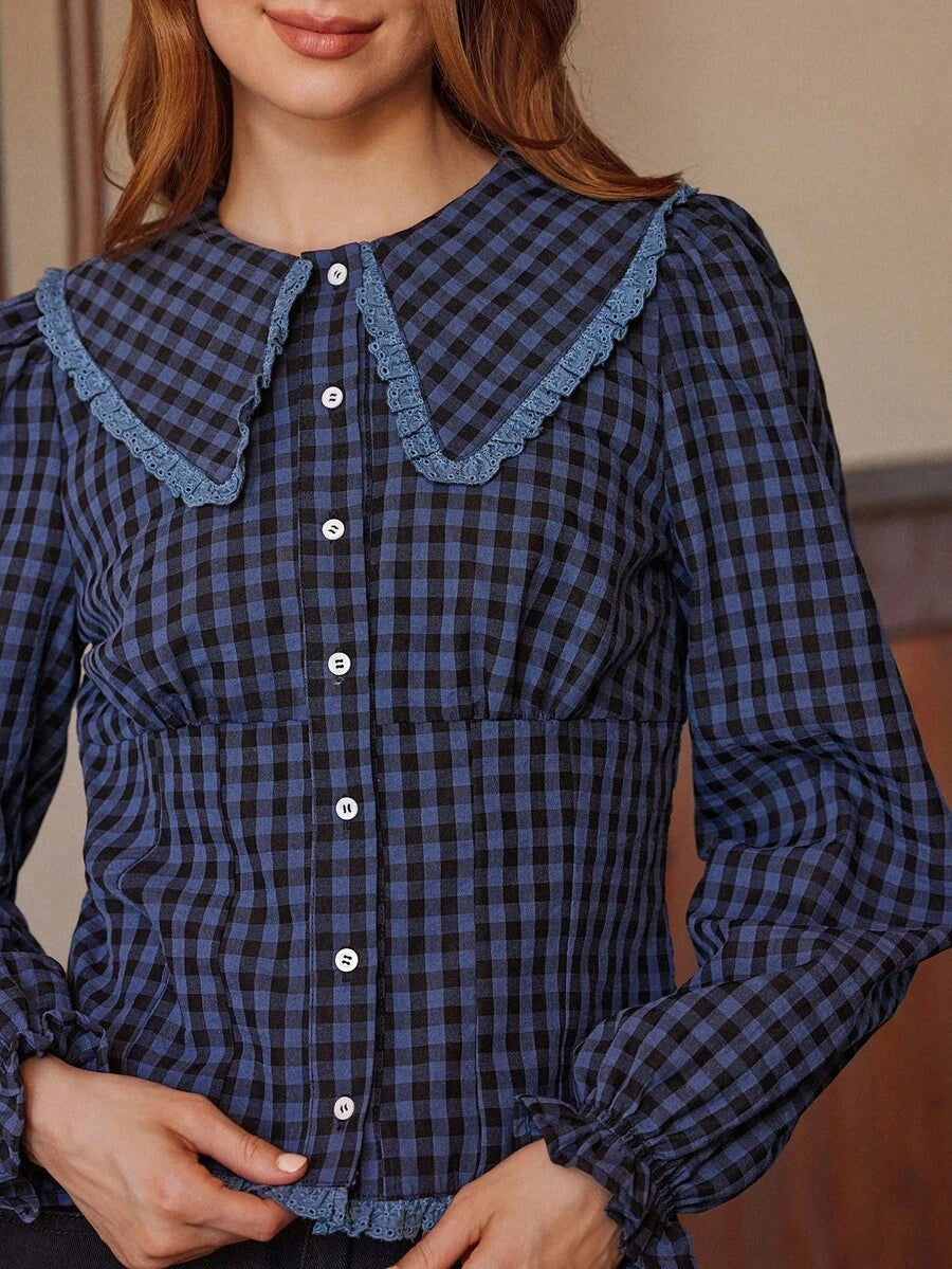 Westfade camisa de manga larga ajustada con cuello de volantes y botones con estampado de cuadros, linda para otono y conciertos de musica country para mujeres