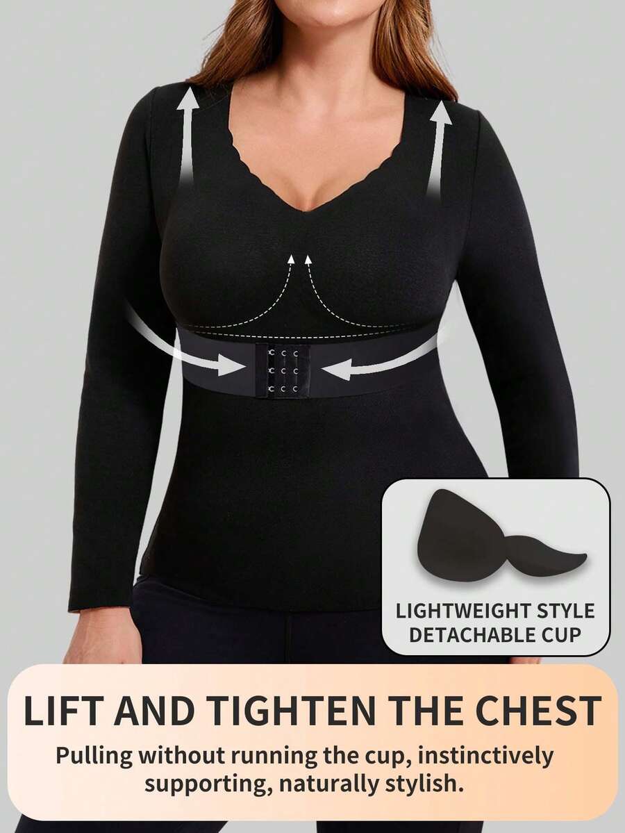 1 pieza camiseta sin mangas con cuello en v y forro polar, 2 en 1 con portavasos incorporado, cierre frontal, levantamiento y moldeado, capa deportiva casual para mujer, calida y versatil para otono/invierno, talla grande