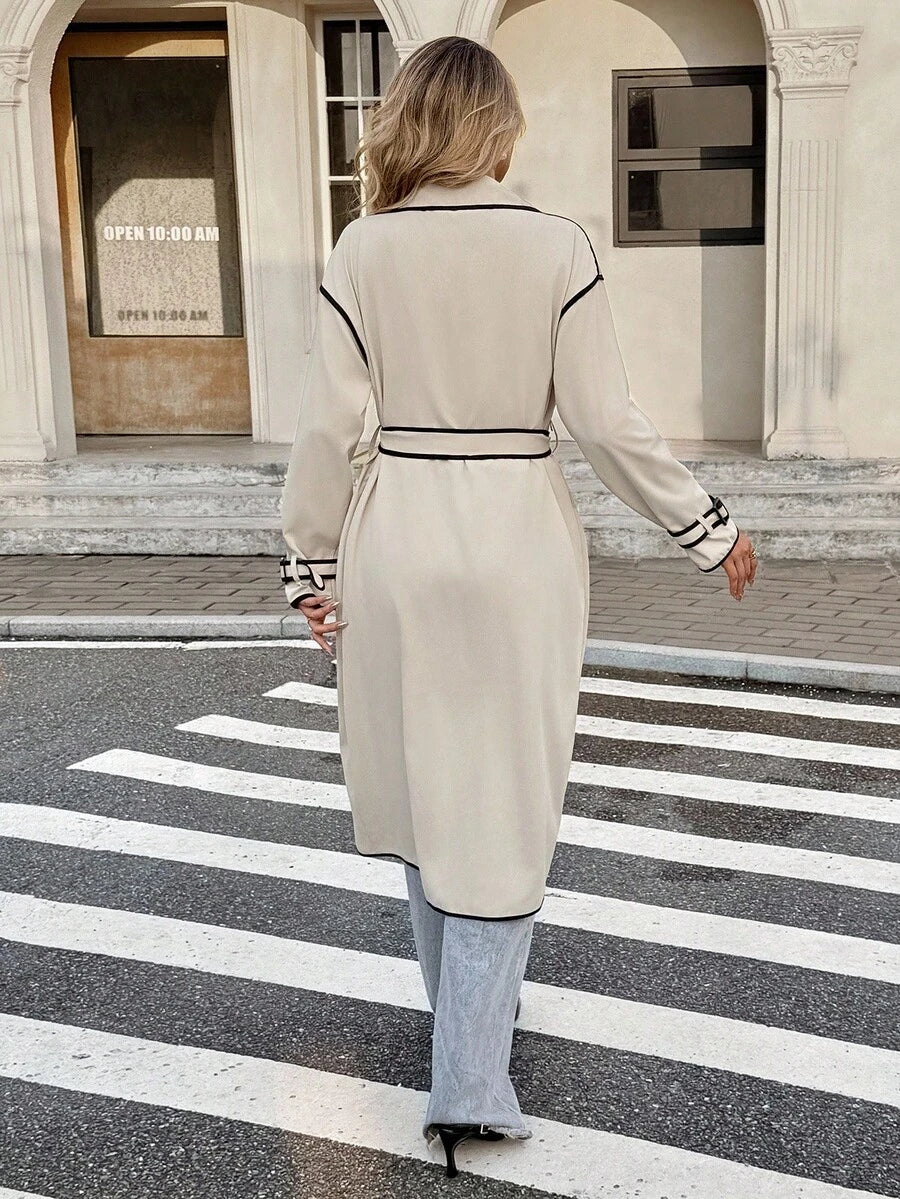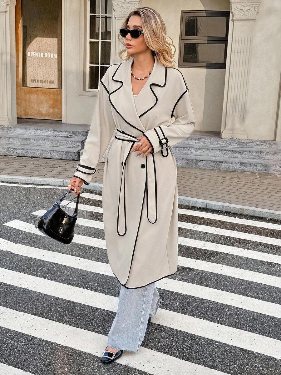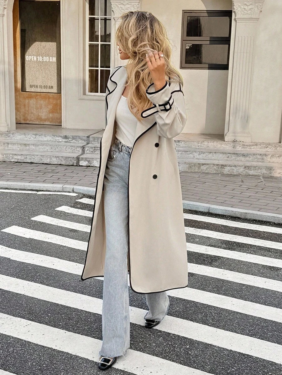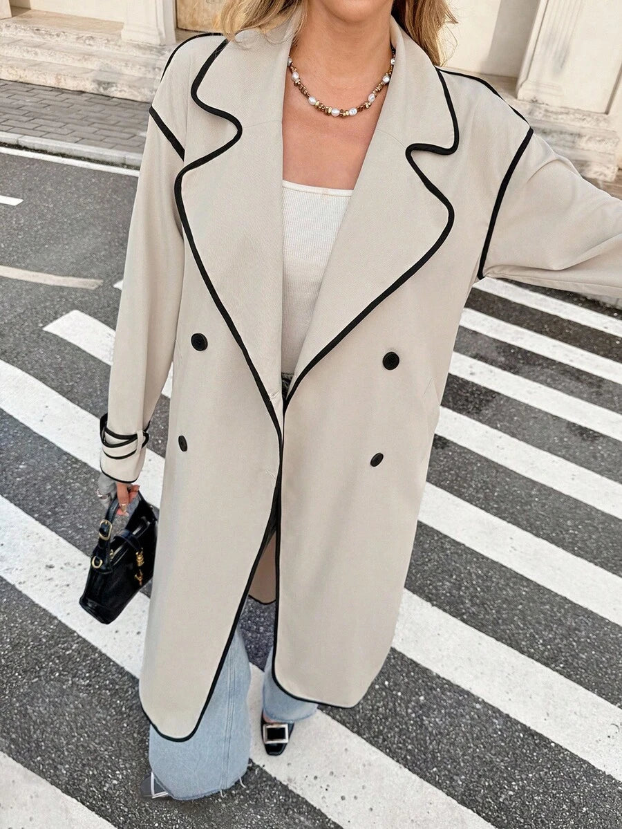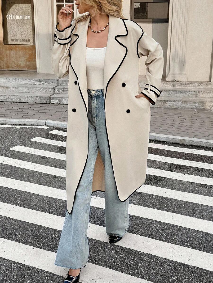 Abrigo de trinchera de moda de doble botonadura con hombros caidos y ribete de contraste para mujer