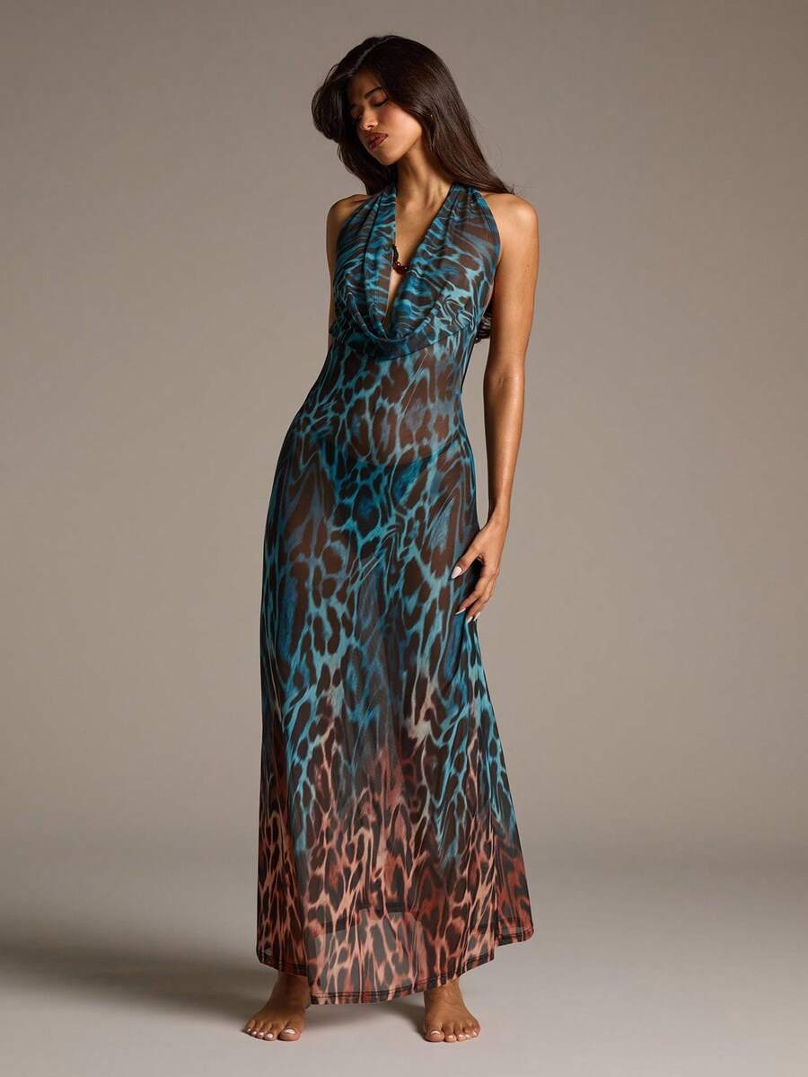 Vestido largo de mujer con estampado de leopardo y tenido anudado para vacaciones, con cuello en pico, espalda descubierta y elegante vestido de playa bohemio con tiras de atar en el cuello y la espalda descubierta