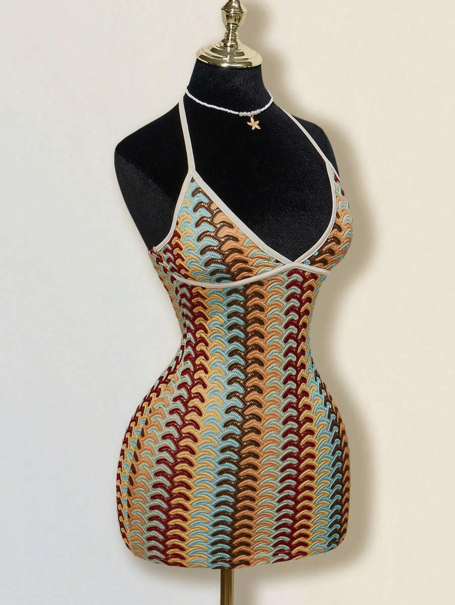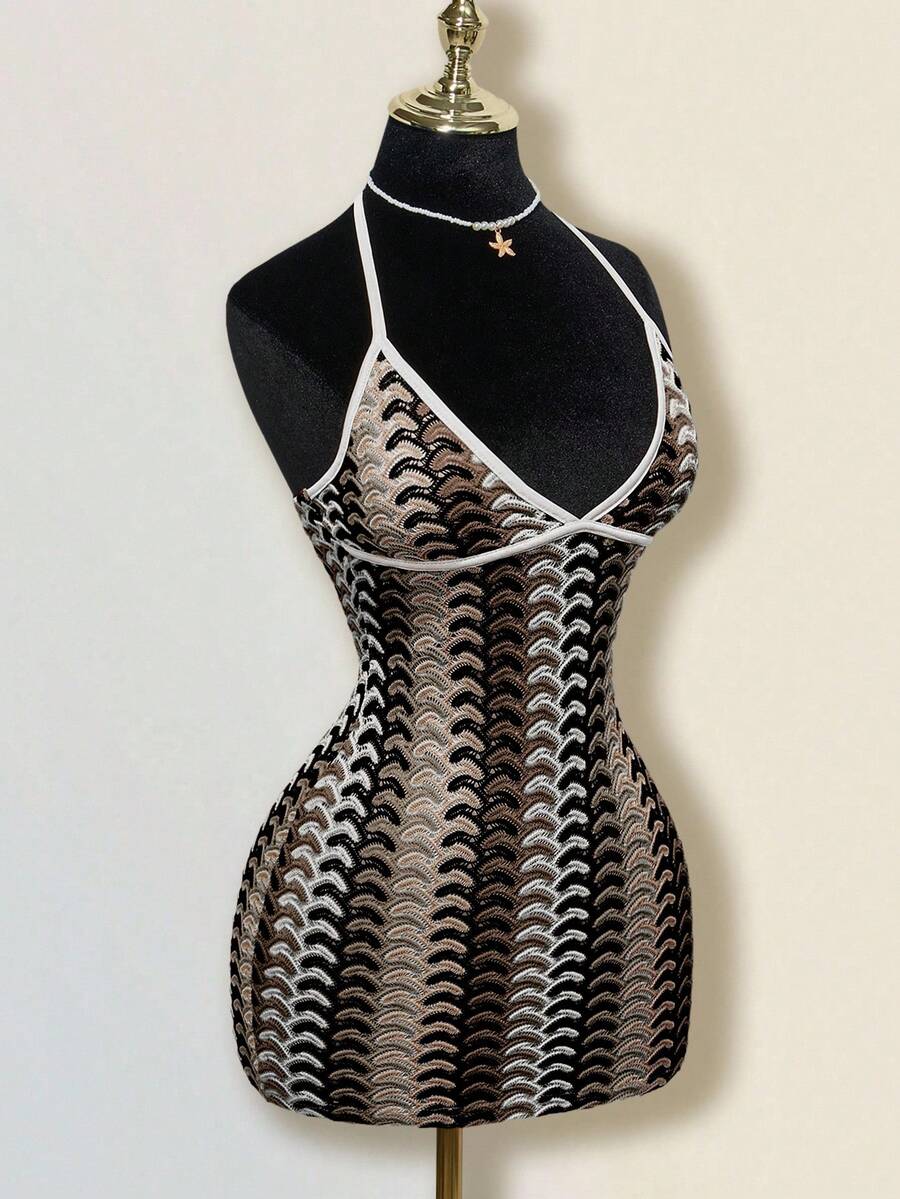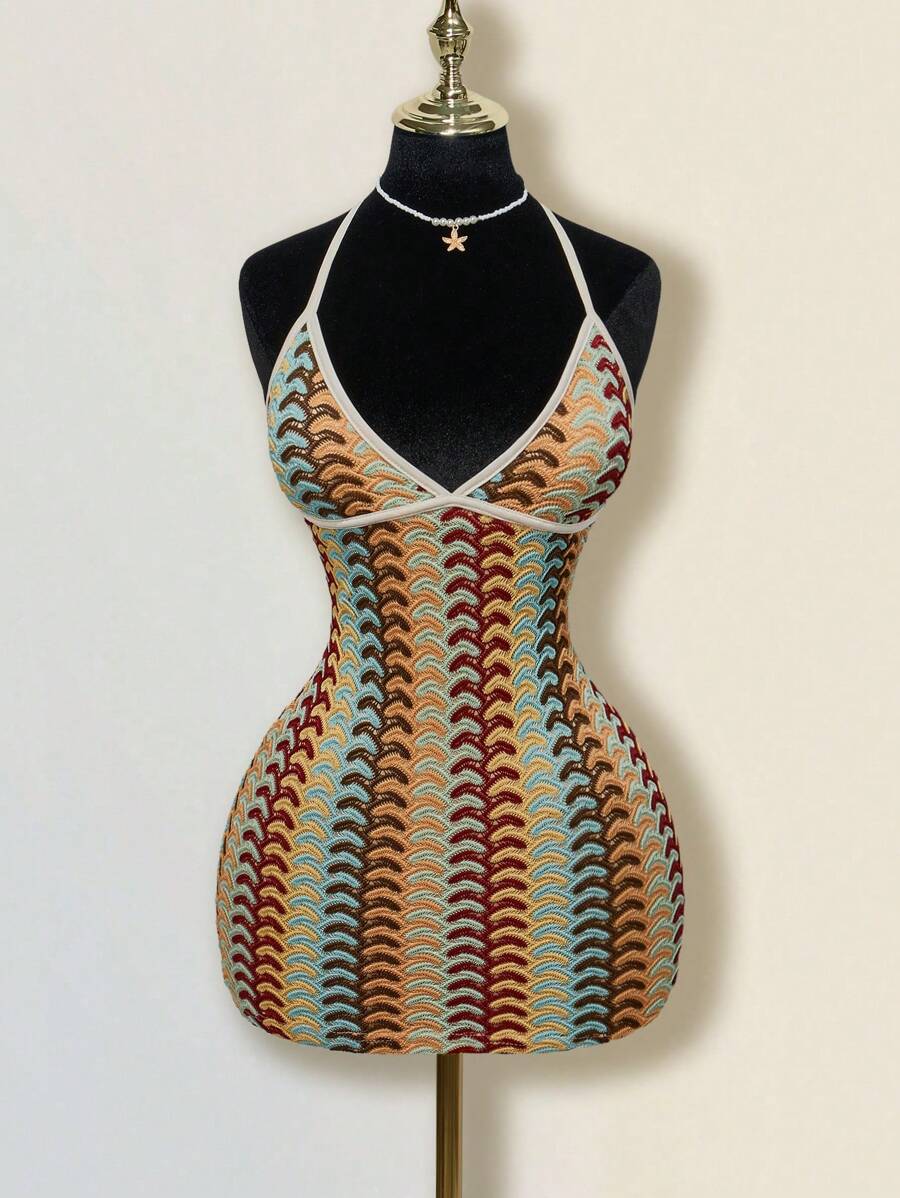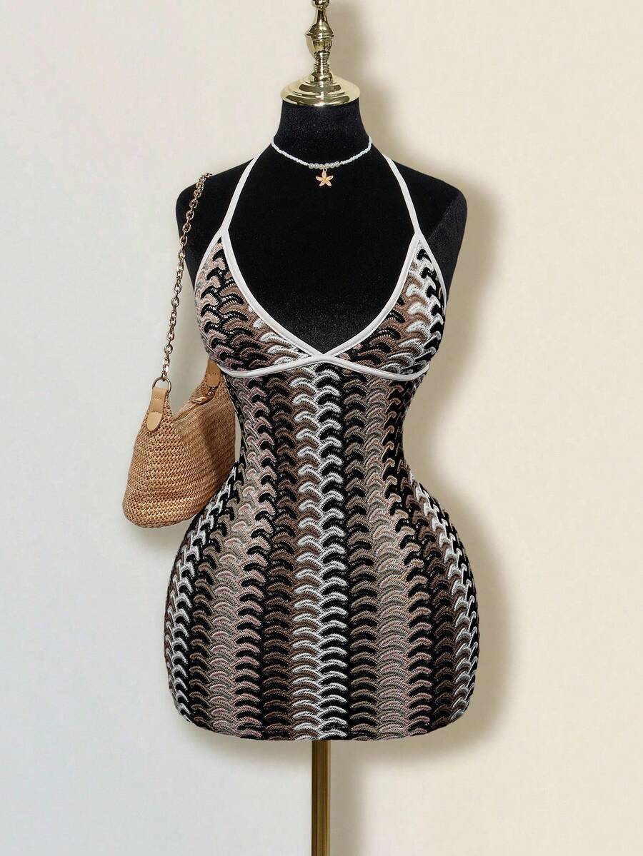 Vestido mini de playa con escote profundo en v, espalda descubierta, cuello halter y ribete acanalado en contraste, tejido de jacquard de colores para mujer
