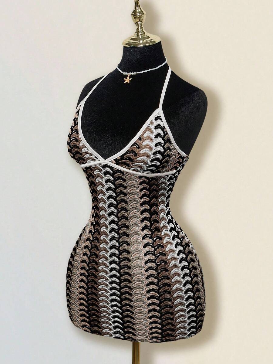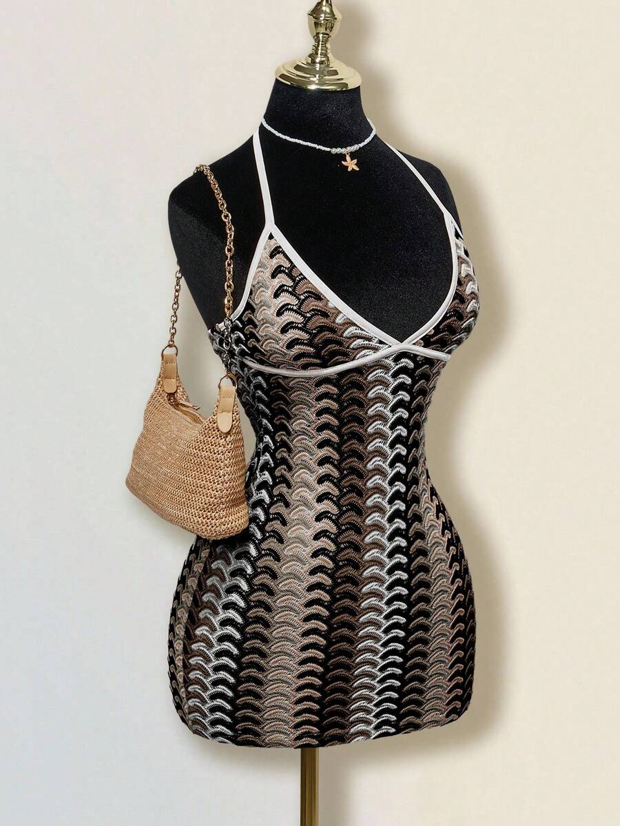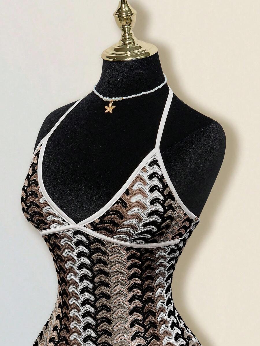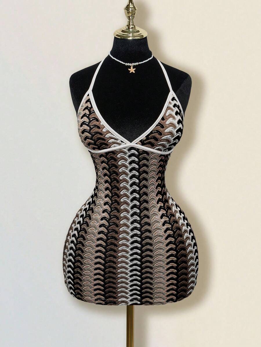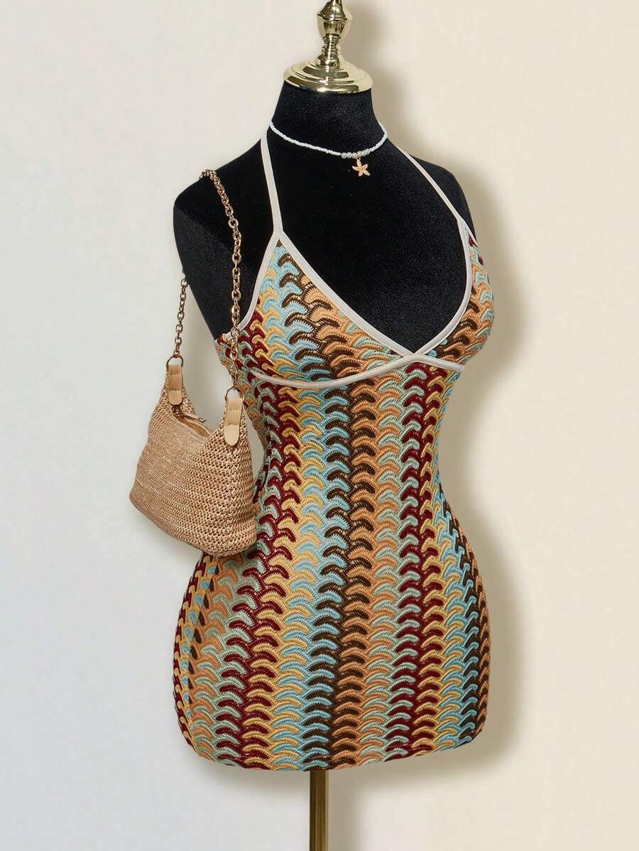 Vestido mini de playa con escote profundo en v, espalda descubierta, cuello halter y ribete acanalado en contraste, tejido de jacquard de colores para mujer