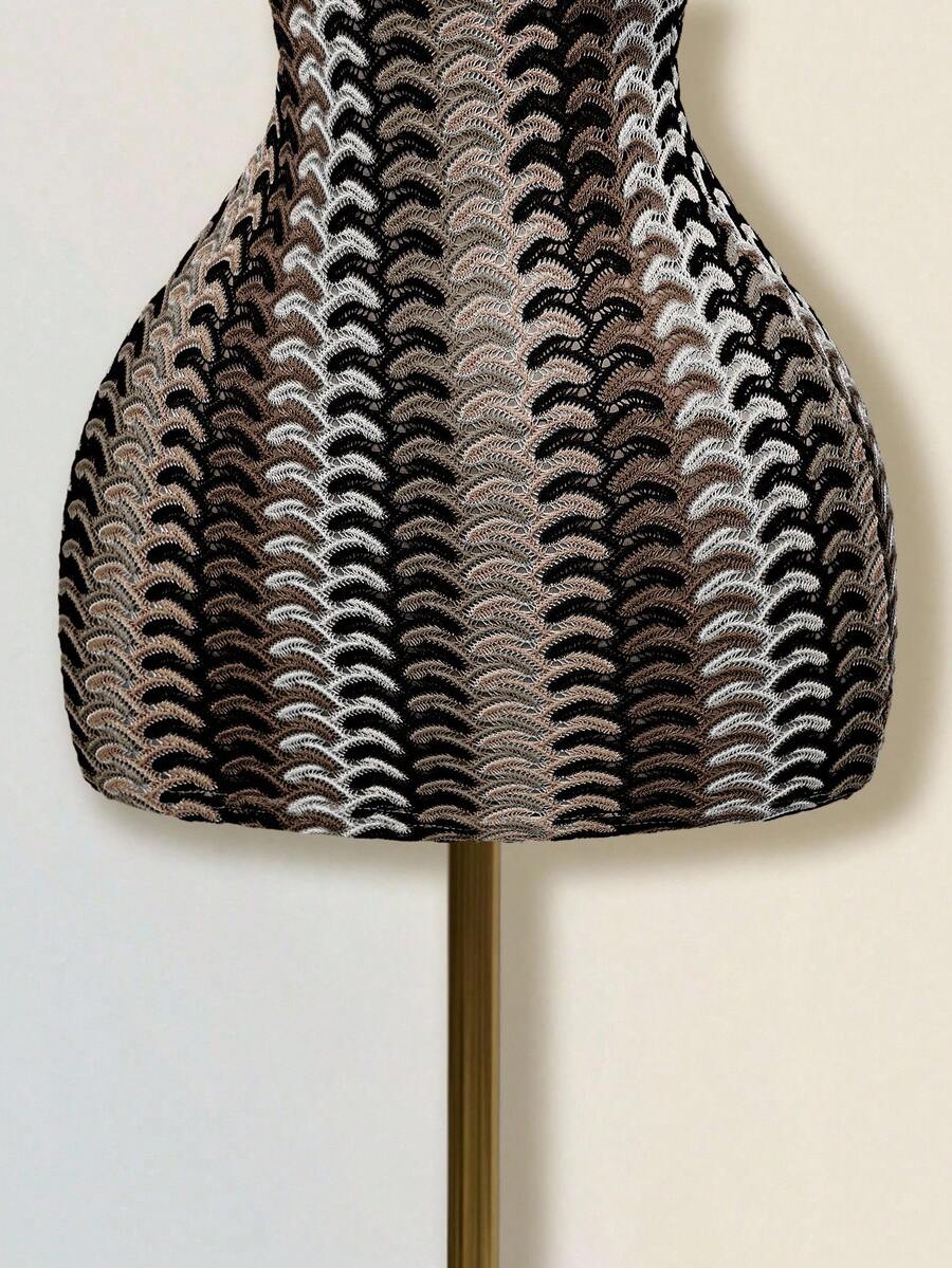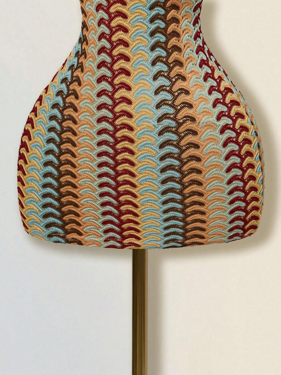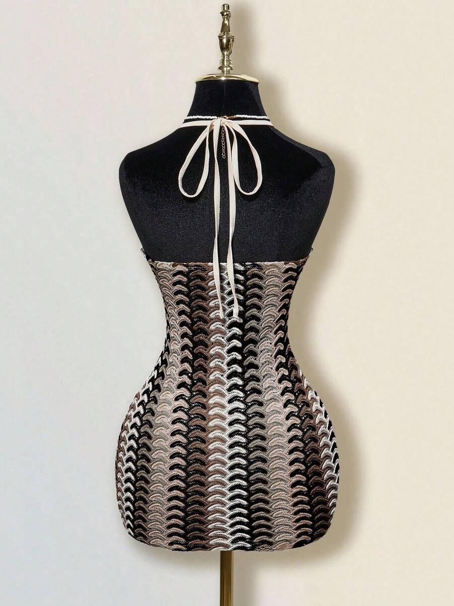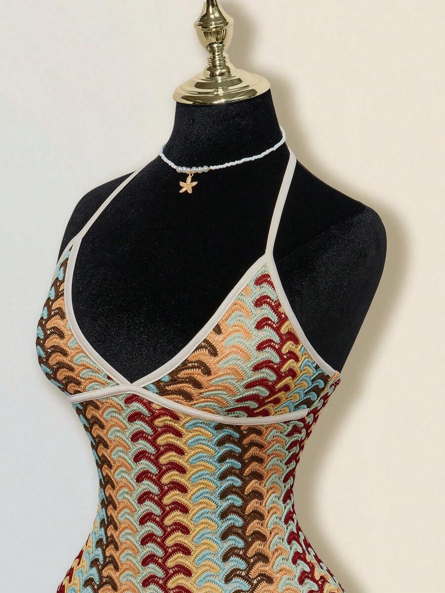 Vestido mini de playa con escote profundo en v, espalda descubierta, cuello halter y ribete acanalado en contraste, tejido de jacquard de colores para mujer